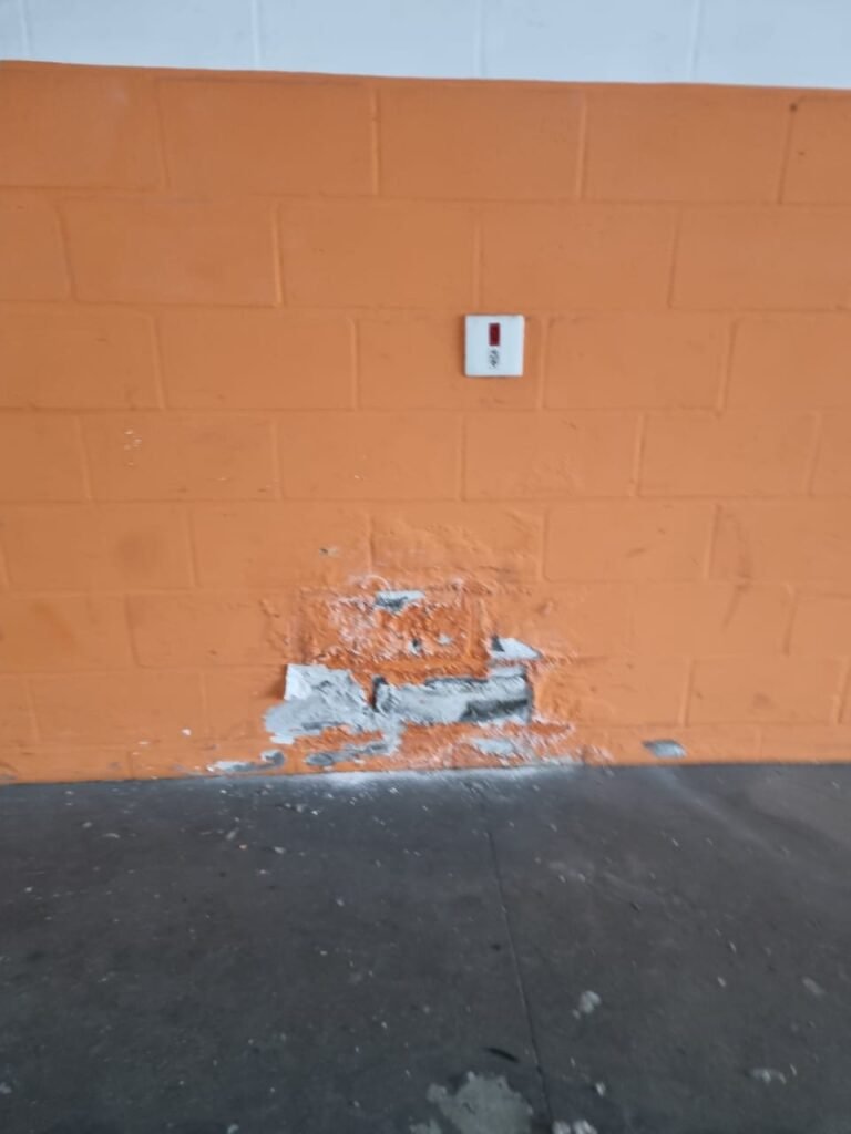 Fachada:- Piso em concreto desempenado e com trincas na pintura em tinta piso cinza descascando o restante em ordem, fachada e muros em textura com a pintura na cor laranja e preto em ordem, letreiro do antigo inquilino em ordem, ferragens e porta aço com a pintura na cor preta vidros todos em ordem,
