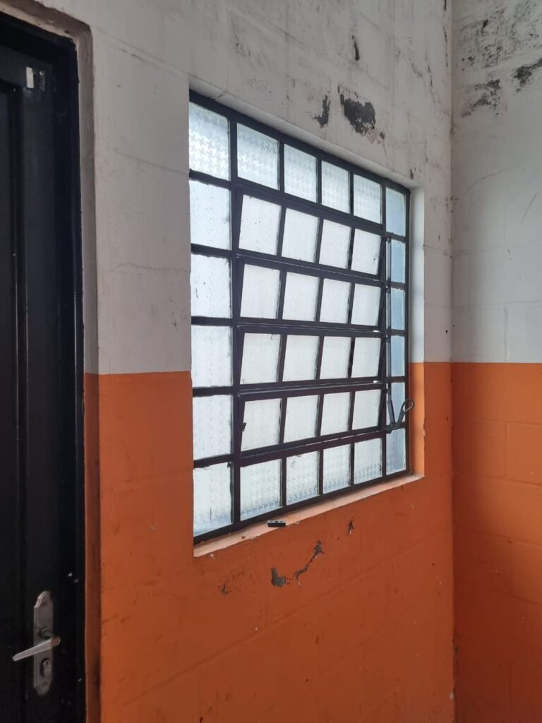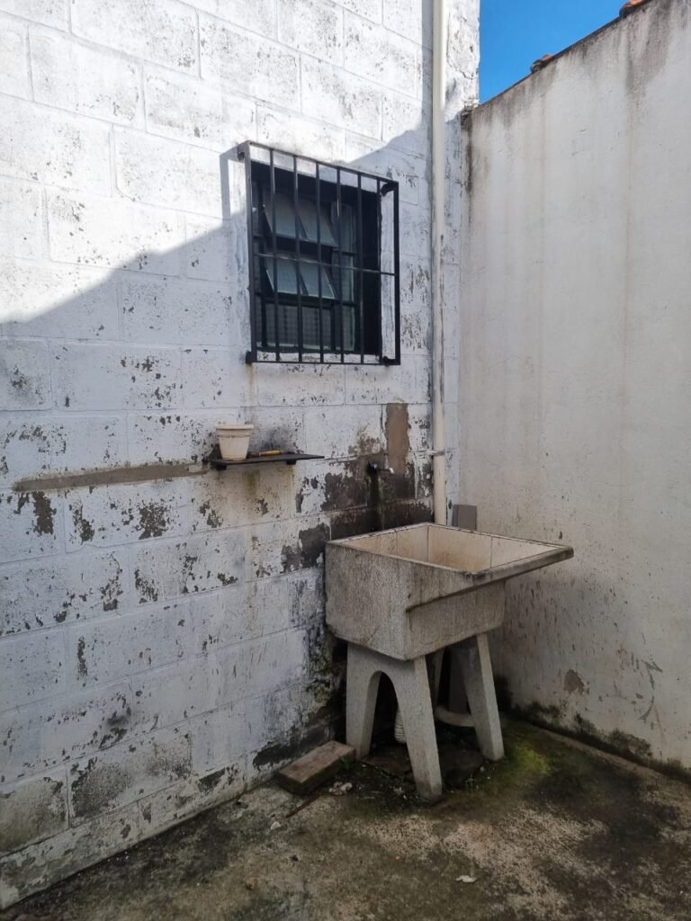 Fundos:- Porta chapa dobrada com a pintura na cor preto em ordem, fechadura e chaves em ordem, maçanetas em ordem piso concreto desempenado em ordem, 01 ralo com tampa desentupido em ordem, 01 tanque em cimento em ordem, 02 torneiras rosca em ordem, paredes com a pintura na cor branco com desgaste na pintura e marcas de sujeira o restante em ordem.