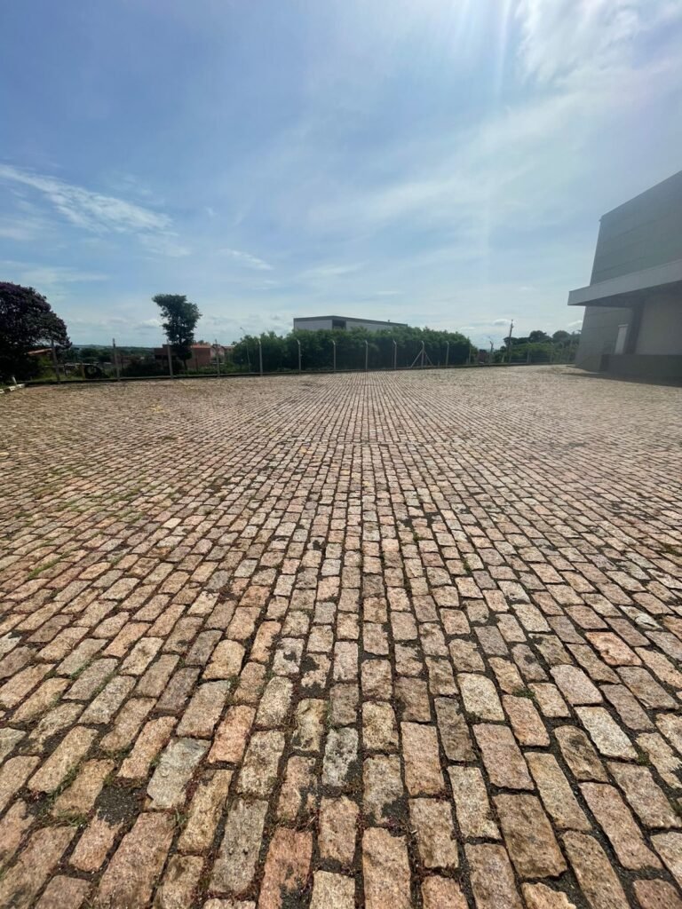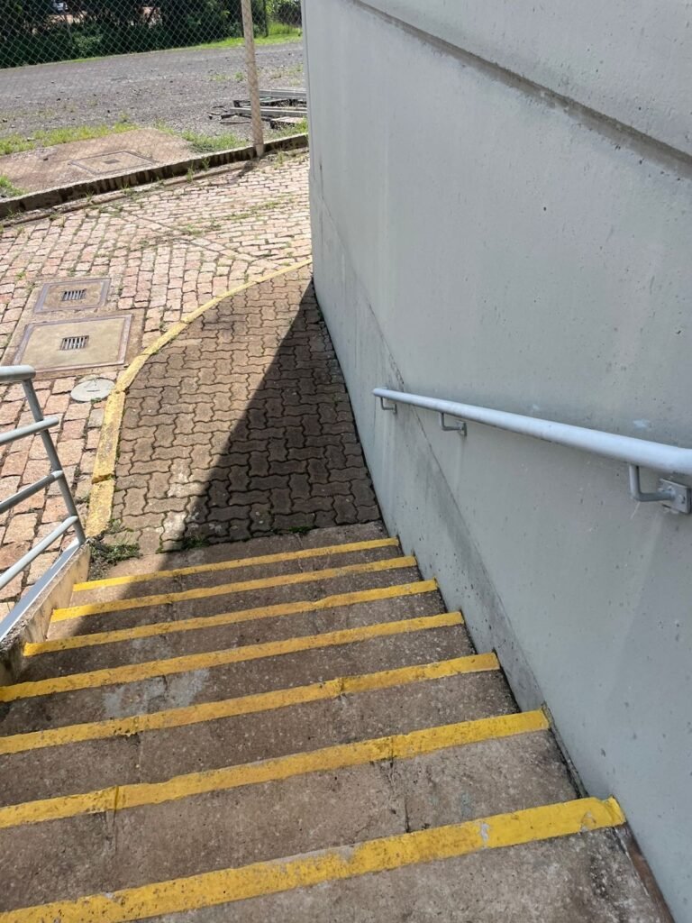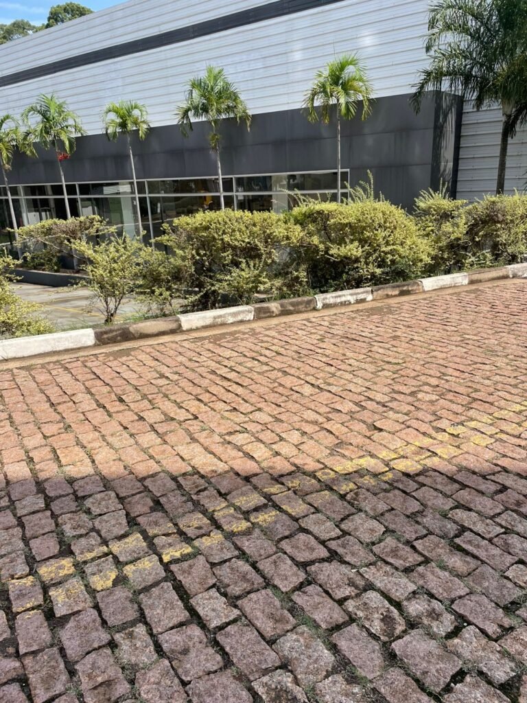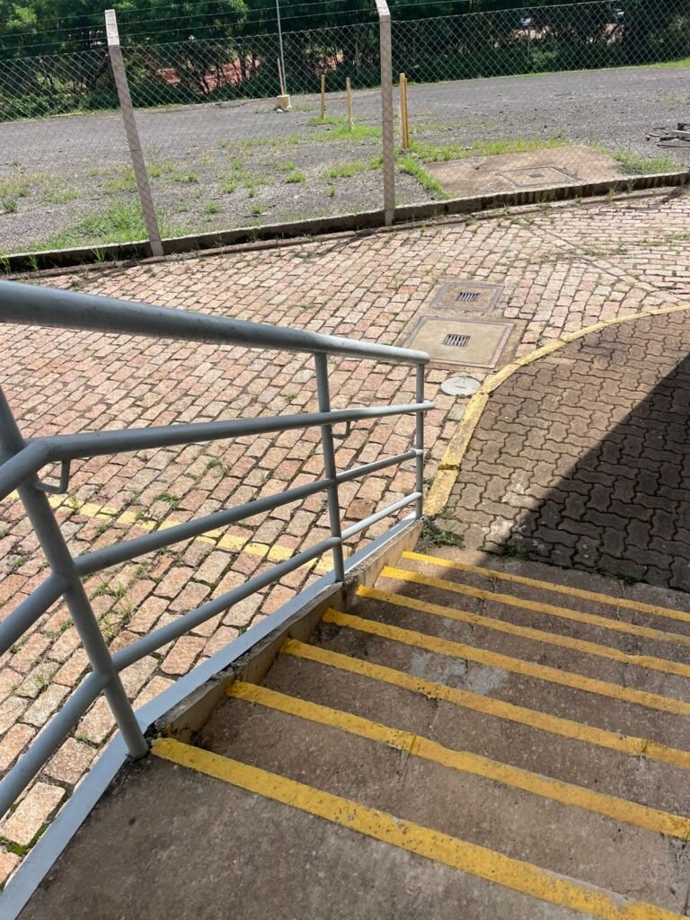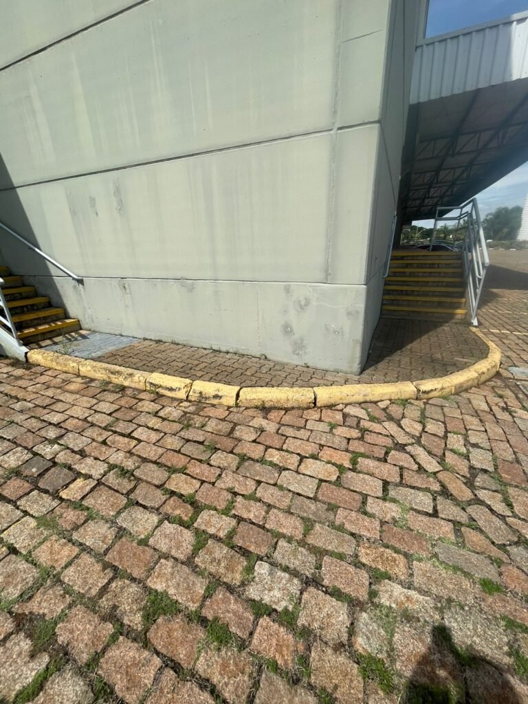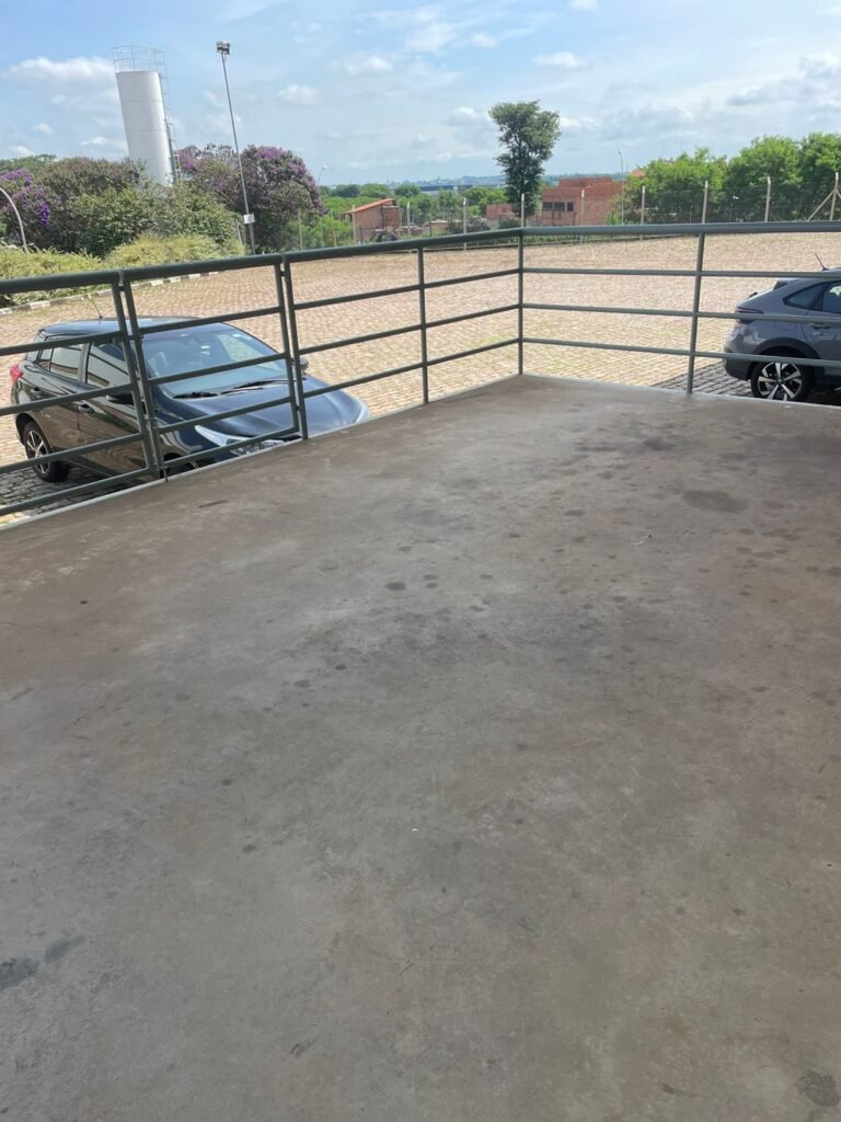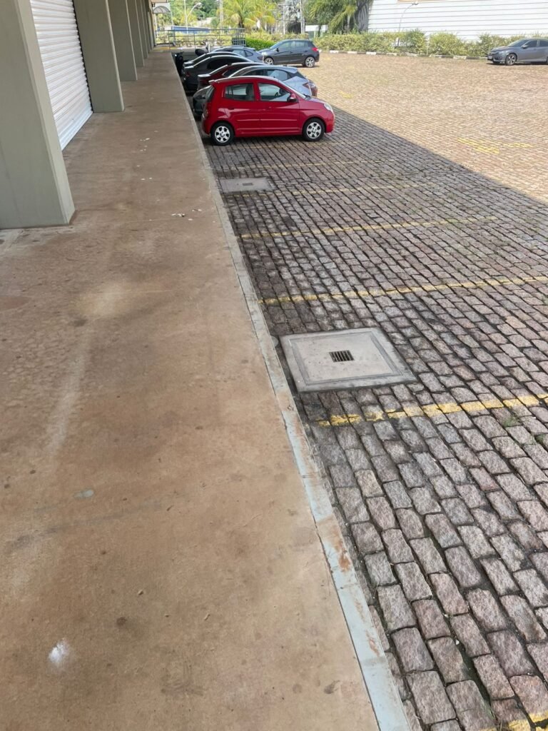 PÁTIO :- Piso paralelepípedo com demarcações de vagas em amarelo, rampa de acesso e guarda corpo em ordem, paredes das docas com pintura na cor cinza nova em ordem, 07 luminárias LED em ordem, marquise estrutura metálica com pintura na cor cinza nova em ordem, telhas galvanizadas com pintura na cor branco em ordem, 02 portas corta fogo com pintura nova na cor branco em ordem, 07 portas de aço com pintura nova na cor branco neve em ordem, 01 torneira de jardim, marquise fundos estrutura metálica com pintura na cor cinza nova em ordem, 05 luminárias, guarda corpo e escada alvenaria.
