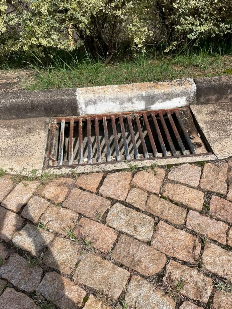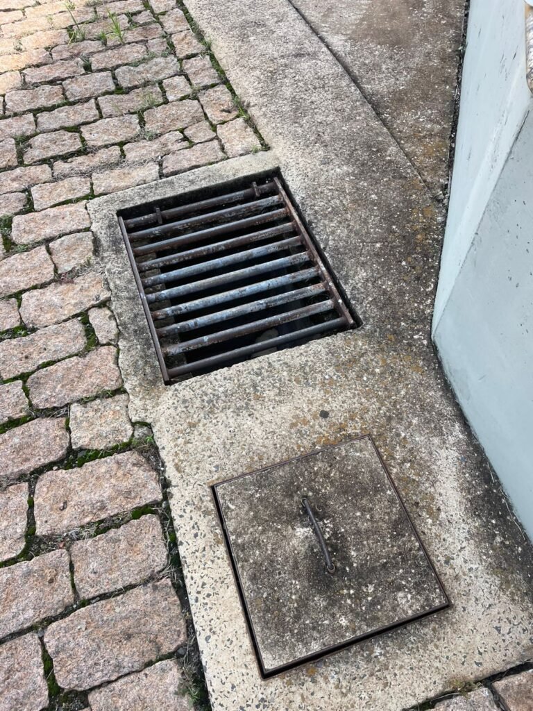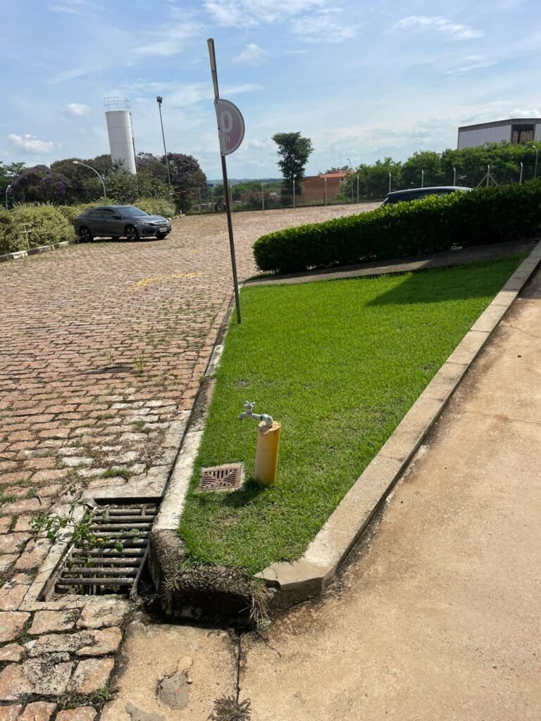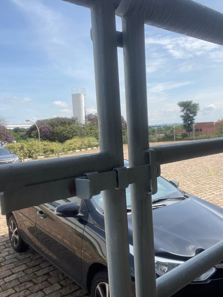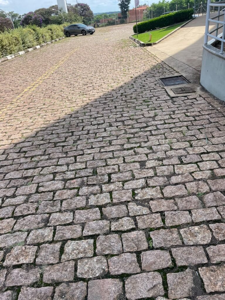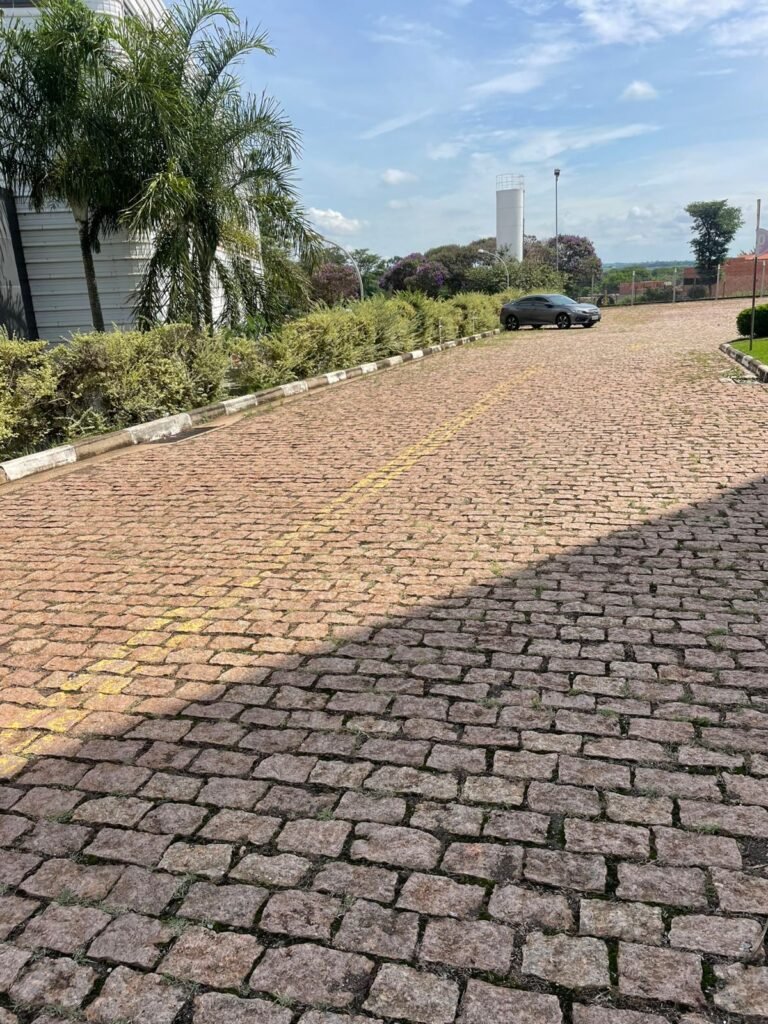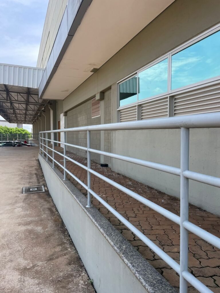 PÁTIO :- Piso paralelepípedo com demarcações de vagas em amarelo, rampa de acesso e guarda corpo em ordem, paredes das docas com pintura na cor cinza nova em ordem, 07 luminárias LED em ordem, marquise estrutura metálica com pintura na cor cinza nova em ordem, telhas galvanizadas com pintura na cor branco em ordem, 02 portas corta fogo com pintura nova na cor branco em ordem, 07 portas de aço com pintura nova na cor branco neve em ordem, 01 torneira de jardim, marquise fundos estrutura metálica com pintura na cor cinza nova em ordem, 05 luminárias, guarda corpo e escada alvenaria.