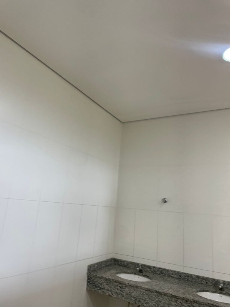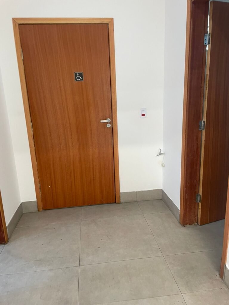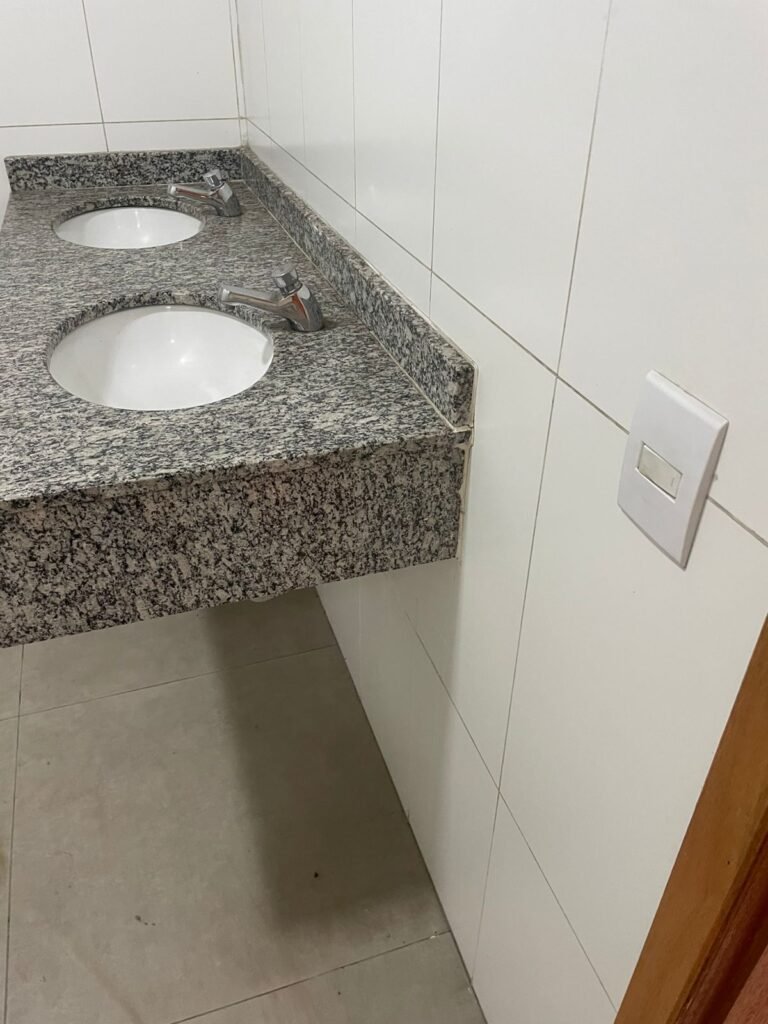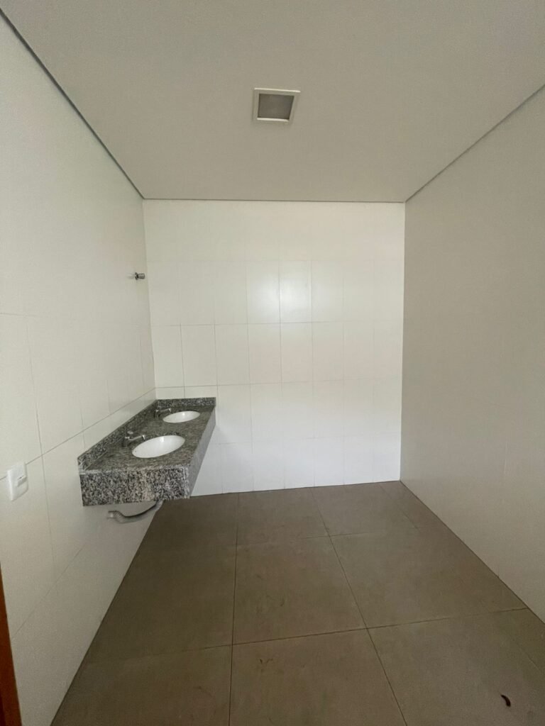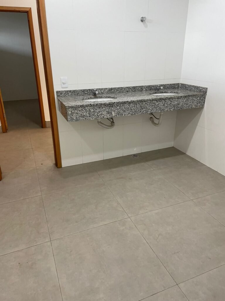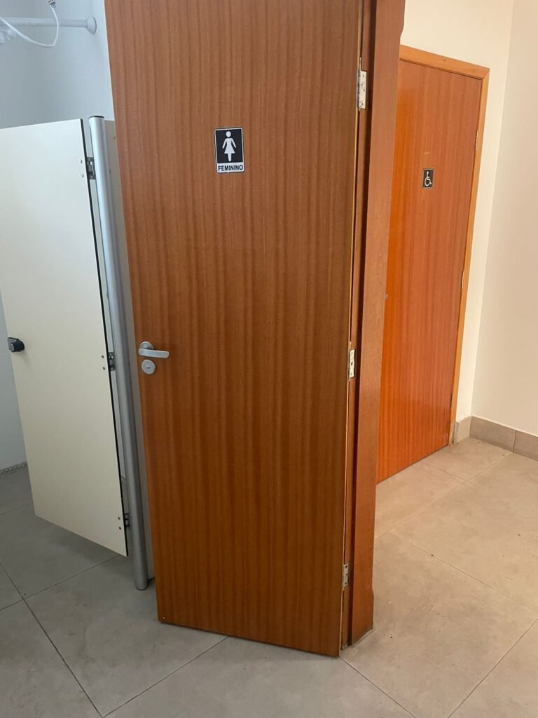W.C FEMININO :- Porta de madeira envernizada e nova em ordem, fechadura e chaves em ordem, piso porcelanato em ordem, pia mármore em ordem, 02 cubas cerâmica branca Deca em ordem, 02 torneiras Celite em ordem, 02 sifão sanfonado universal em ordem, azulejo até o teto em ordem, 02 luminárias embutidas com lâmpada LED em ordem, 01 vitrô basculante com vidro blindex em ordem, trava em ordem, 02 Box com 02 portas em ordem, travas em ordem, 01 ralo tipo grade em ordem, 01 conjunto de vaso sanitário e caixa acoplada de descarga em ordem, tampa de plástico em ordem, 02 registros com canopla em ordem, 01 chuveiro hydra DuchaSS em ordem, 01 interruptor danificado, espelho de luz em ordem.