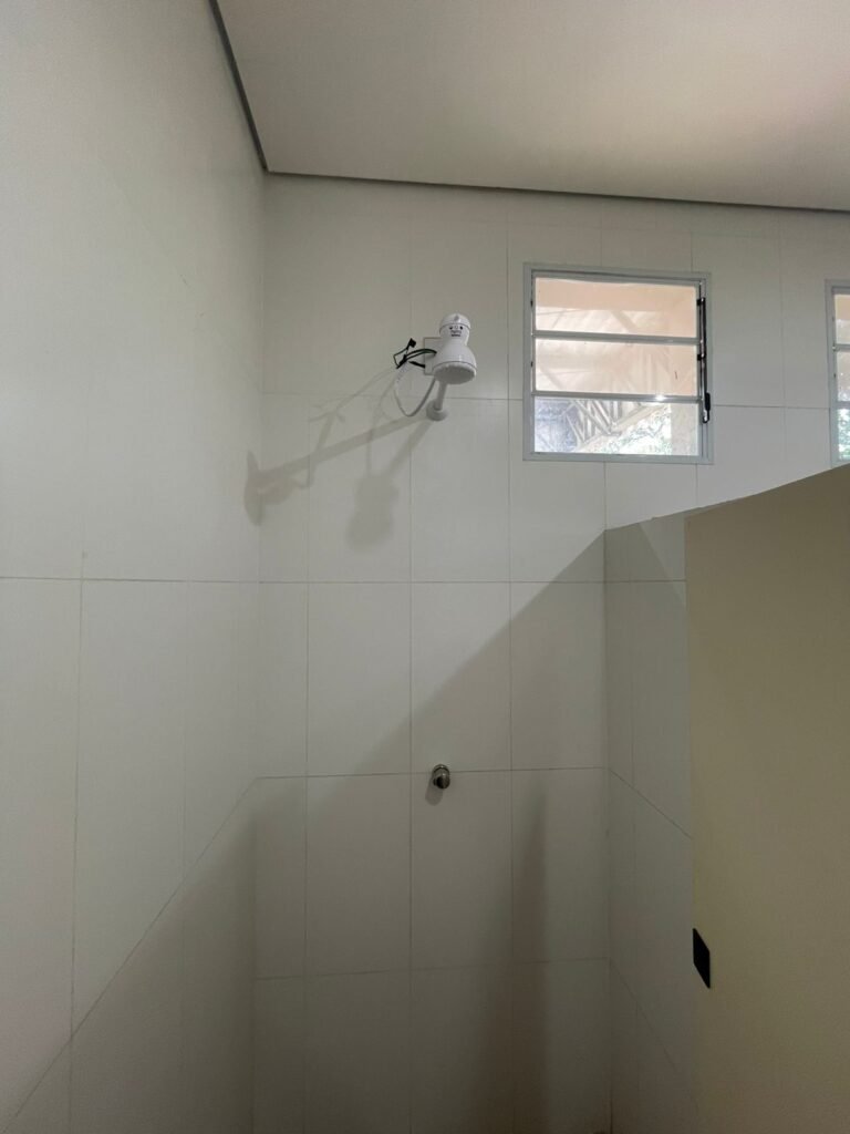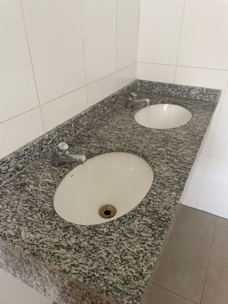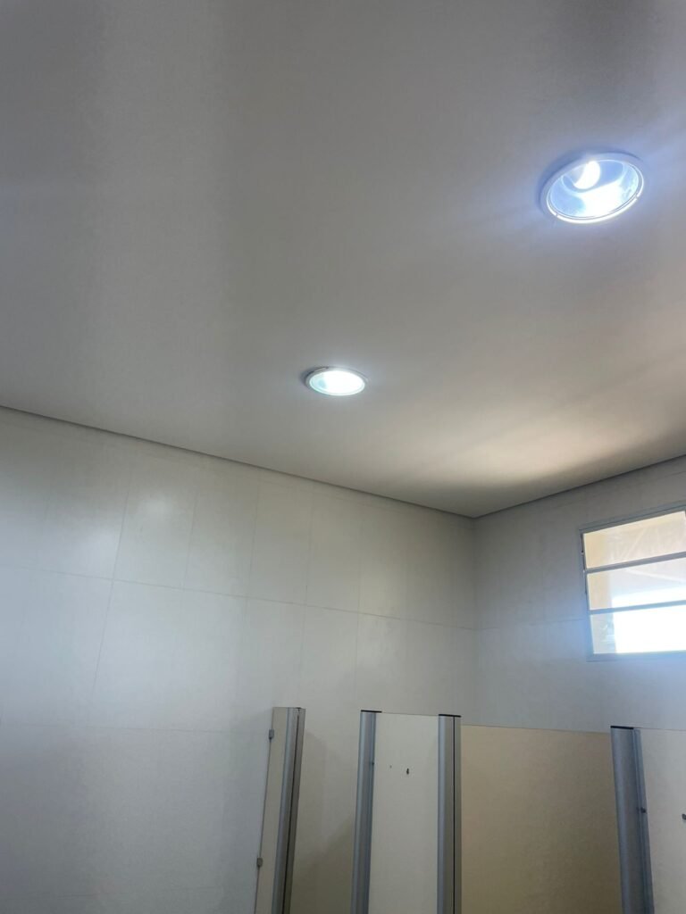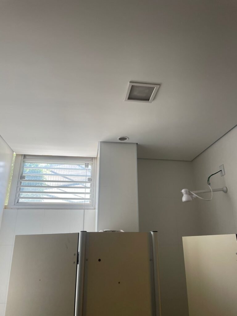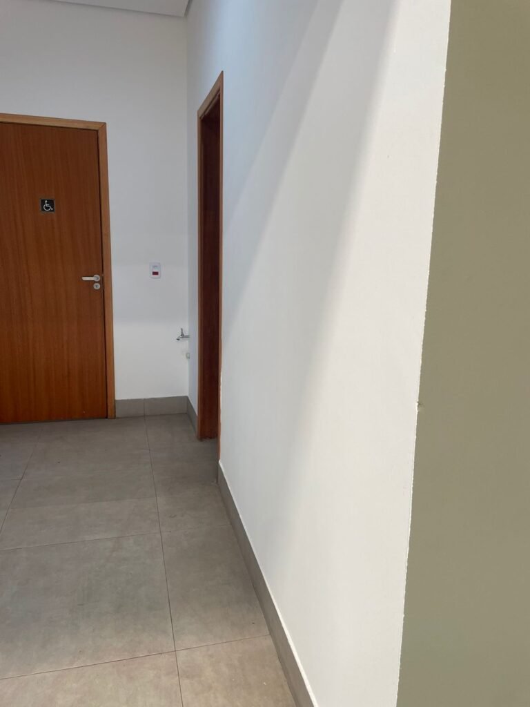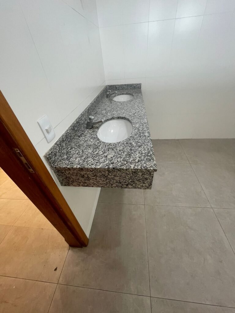 W.C FEMININO :- Porta de madeira envernizada e nova em ordem, fechadura e chaves em ordem, piso porcelanato em ordem, pia mármore em ordem, 02 cubas cerâmica branca Deca em ordem, 02 torneiras Celite em ordem, 02 sifão sanfonado universal em ordem, azulejo até o teto em ordem, 02 luminárias embutidas com lâmpada LED em ordem, 01 vitrô basculante com vidro blindex em ordem, trava em ordem, 02 Box com 02 portas em ordem, travas em ordem, 01 ralo tipo grade em ordem, 01 conjunto de vaso sanitário e caixa acoplada de descarga em ordem, tampa de plástico em ordem, 02 registros com canopla em ordem, 01 chuveiro hydra DuchaSS em ordem, 01 interruptor danificado, espelho de luz em ordem.