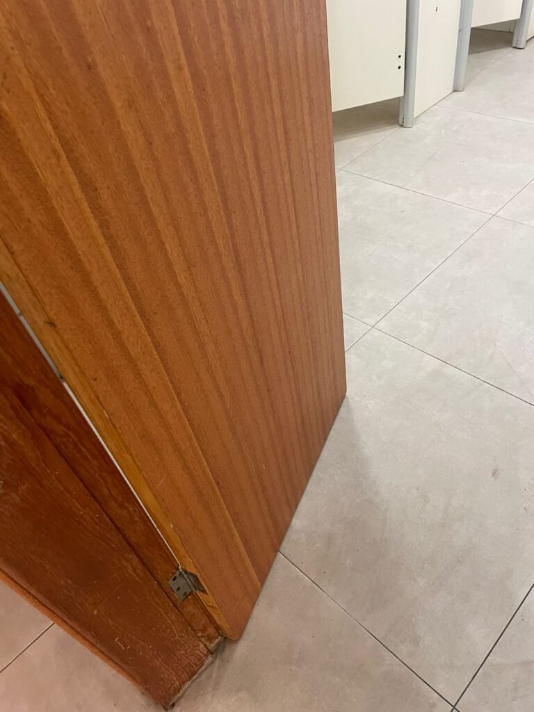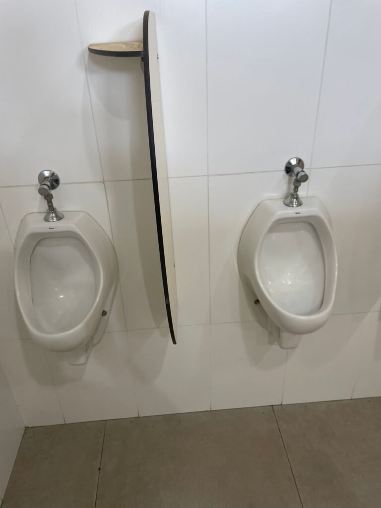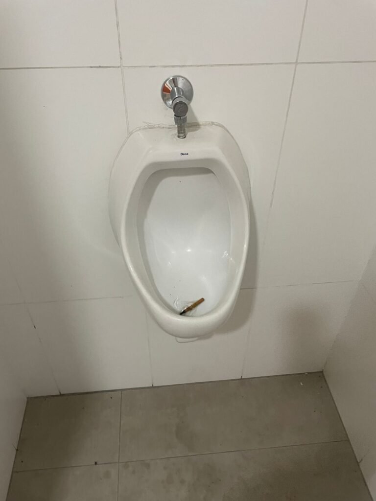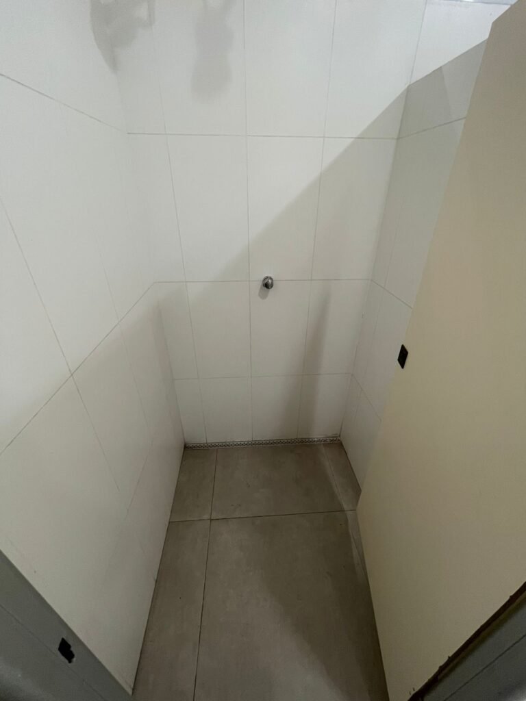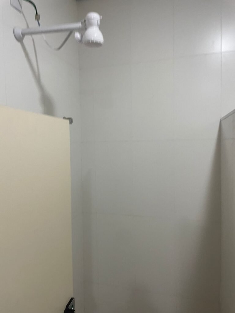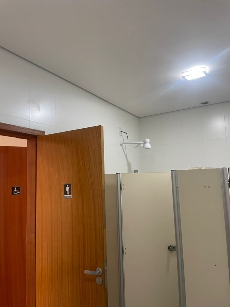 W.C MASCULINO :- Porta de madeira envernizada em ordem, maçanetas em ordem, fechadura e chave em ordem, piso porcelanato em ordem, azulejo até o teto, 01 mictório Deca cerâmica branca em ordem, descarga em ordem, pia mármore em ordem, 02 cubas cerâmica em ordem, 01 torneiras Celite em ordem , 01 torneiras Celite com pressão fraca 02 sifão universal sanfonado em ordem, 02 divisórias com portas em ordem, maçanetas em ordem, 01 conjunto vaso sanitário e caixa acoplada descarga em ordem, tampa plástico em ordem, 01 chuveiro hydra DuchaSS em ordem, 01 ralo tipo grade em ordem, 01 luminária embutida desencaixando, 01 luminária embutida em ordem.