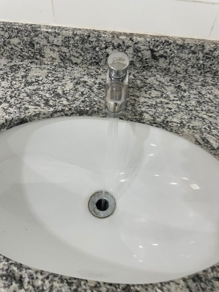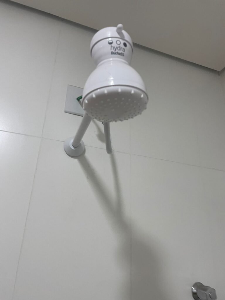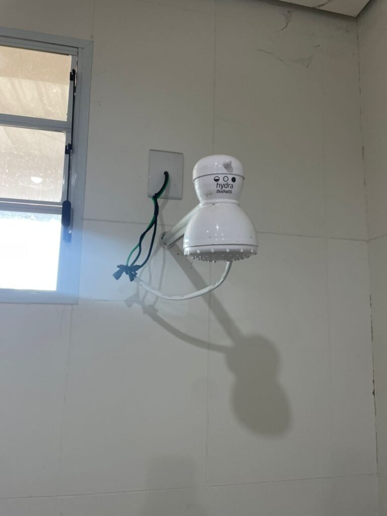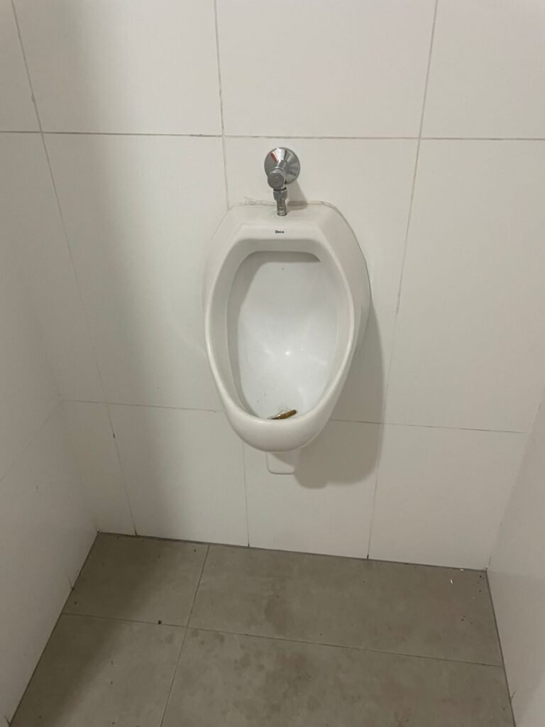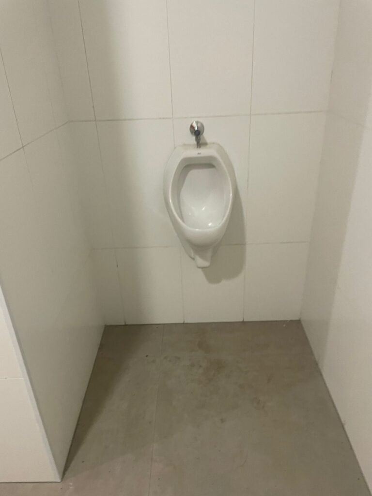W.C MASCULINO :- Porta de madeira envernizada em ordem, maçanetas em ordem, fechadura e chave em ordem, piso porcelanato em ordem, azulejo até o teto, 01 mictório Deca cerâmica branca em ordem, descarga em ordem, pia mármore em ordem, 02 cubas cerâmica em ordem, 01 torneiras Celite em ordem , 01 torneiras Celite com pressão fraca 02 sifão universal sanfonado em ordem, 02 divisórias com portas em ordem, maçanetas em ordem, 01 conjunto vaso sanitário e caixa acoplada descarga em ordem, tampa plástico em ordem, 01 chuveiro hydra DuchaSS em ordem, 01 ralo tipo grade em ordem, 01 luminária embutida desencaixando, 01 luminária embutida em ordem.