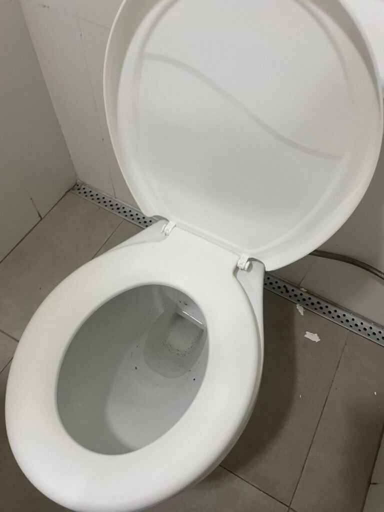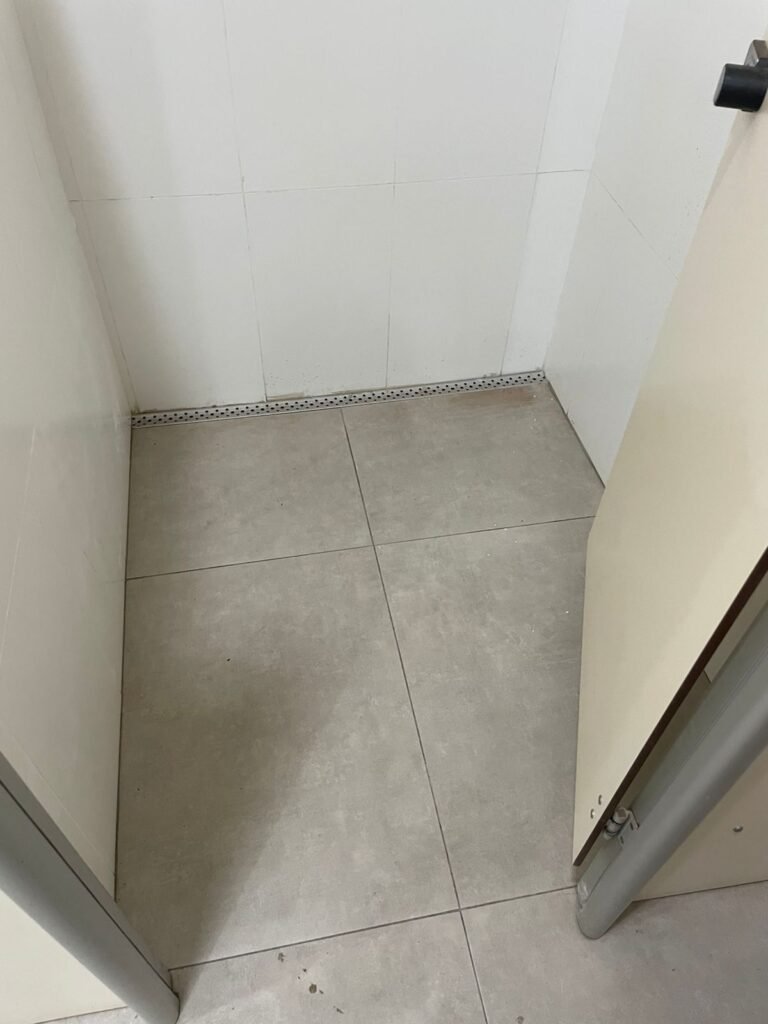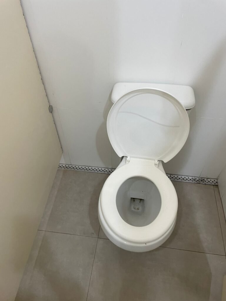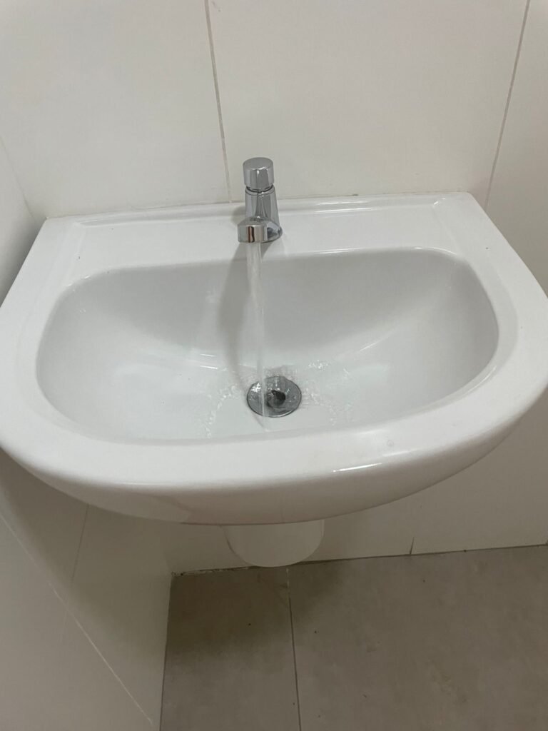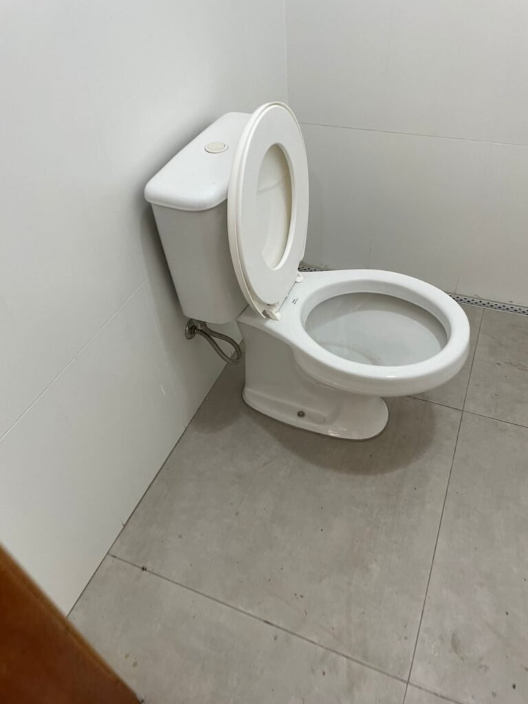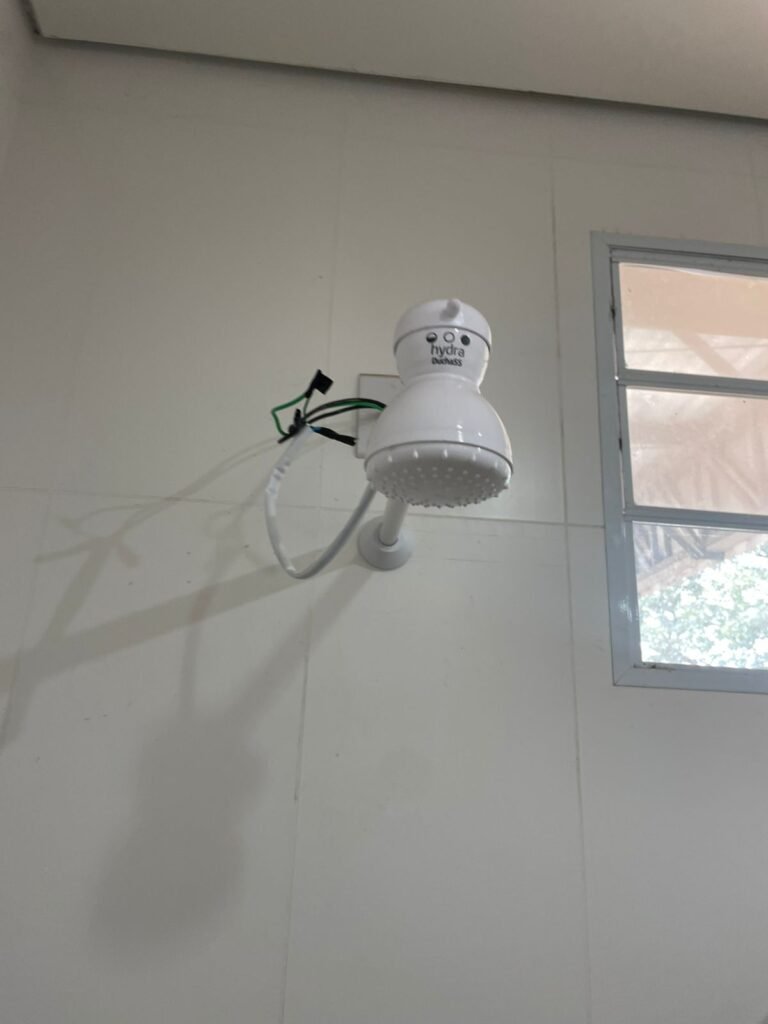 W.C MASCULINO :- Porta de madeira envernizada em ordem, maçanetas em ordem, fechadura e chave em ordem, piso porcelanato em ordem, azulejo até o teto, 01 mictório Deca cerâmica branca em ordem, descarga em ordem, pia mármore em ordem, 02 cubas cerâmica em ordem, 01 torneiras Celite em ordem , 01 torneiras Celite com pressão fraca 02 sifão universal sanfonado em ordem, 02 divisórias com portas em ordem, maçanetas em ordem, 01 conjunto vaso sanitário e caixa acoplada descarga em ordem, tampa plástico em ordem, 01 chuveiro hydra DuchaSS em ordem, 01 ralo tipo grade em ordem, 01 luminária embutida desencaixando, 01 luminária embutida em ordem.