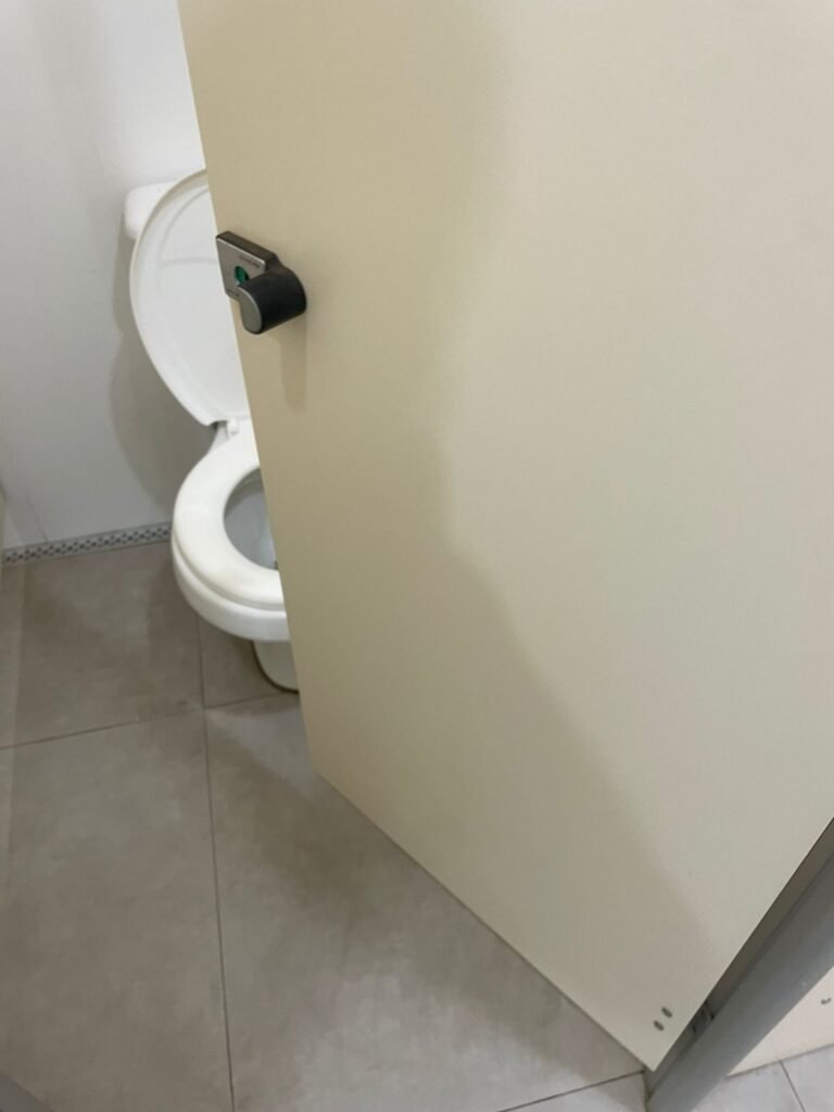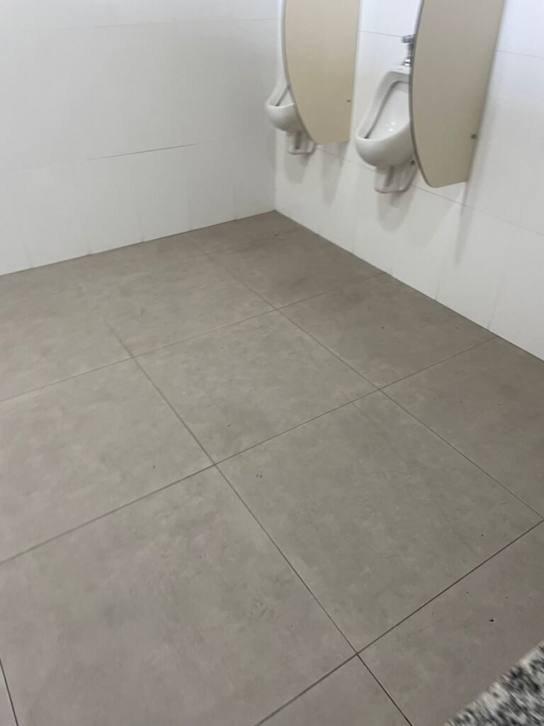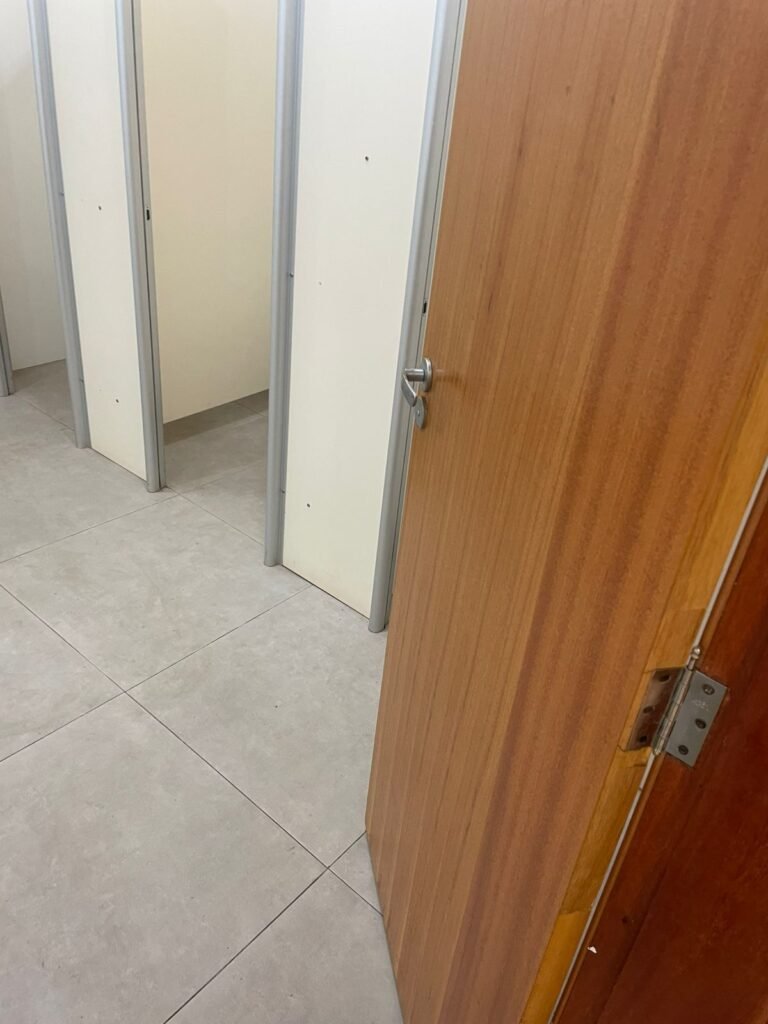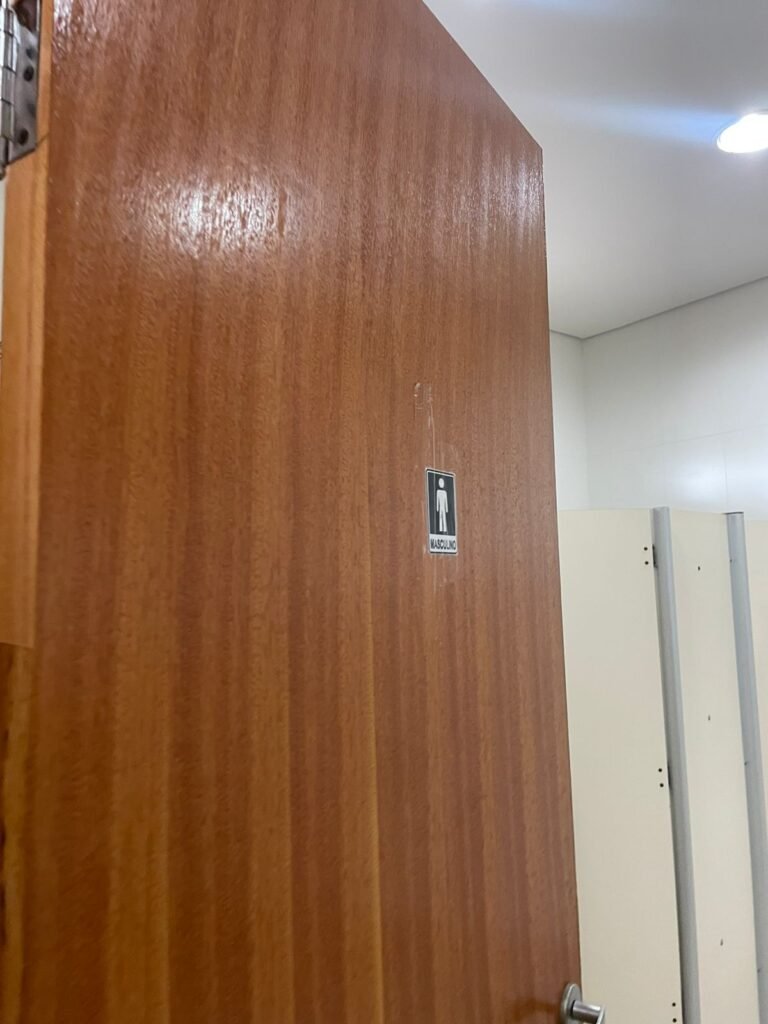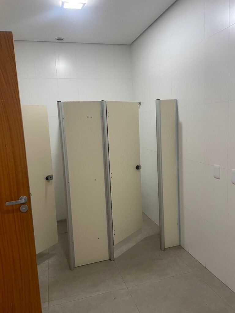 W.C MASCULINO :- Porta de madeira envernizada em ordem, maçanetas em ordem, fechadura e chave em ordem, piso porcelanato em ordem, azulejo até o teto, 01 mictório Deca cerâmica branca em ordem, descarga em ordem, pia mármore em ordem, 02 cubas cerâmica em ordem, 02 torneiras Celite, 02 sifão universal sanfonado em ordem, 03 divisórias com 03 portas em ordem, maçanetas em ordem, 02 conjuntos vaso sanitário e caixa acoplada descarga em ordem, tampa plástico em ordem, 01 chuveiro hydra duchaSS em ordem, 01 ralo tipo grelha em ordem , 03 lustres embutidos com lâmpadas de LED em ordem, 01 lustres embutidos com lâmpadas de LED sem espelho, 02 bidês com 02 divisórias de madeira em ordem, 02 vitrôs basculante com vidros em ordem.