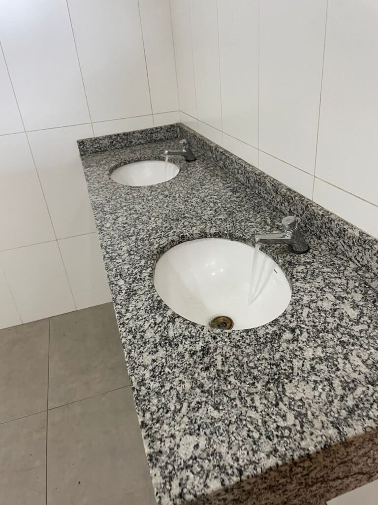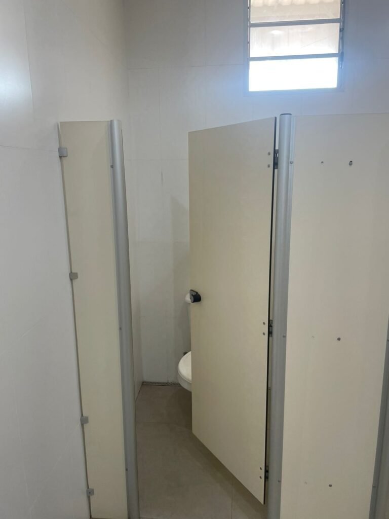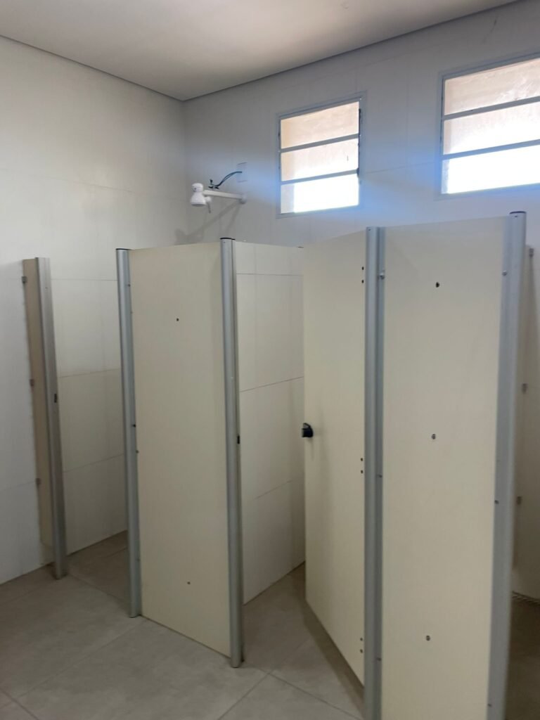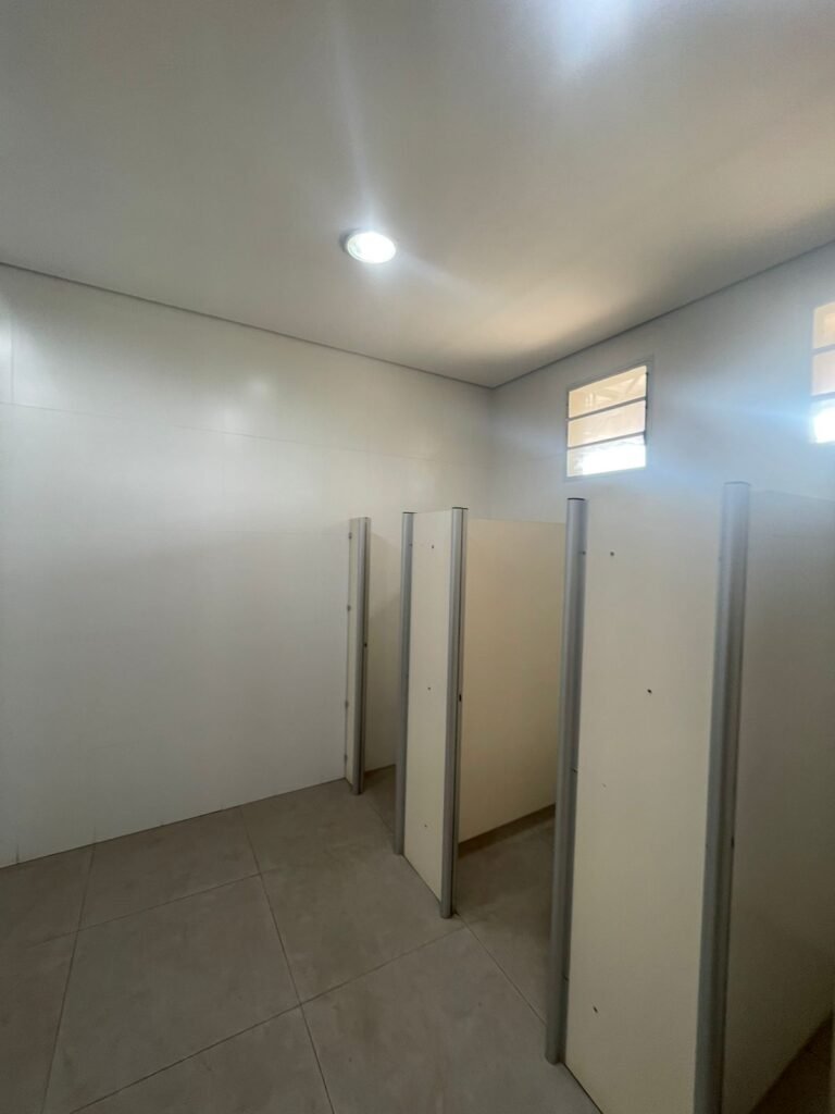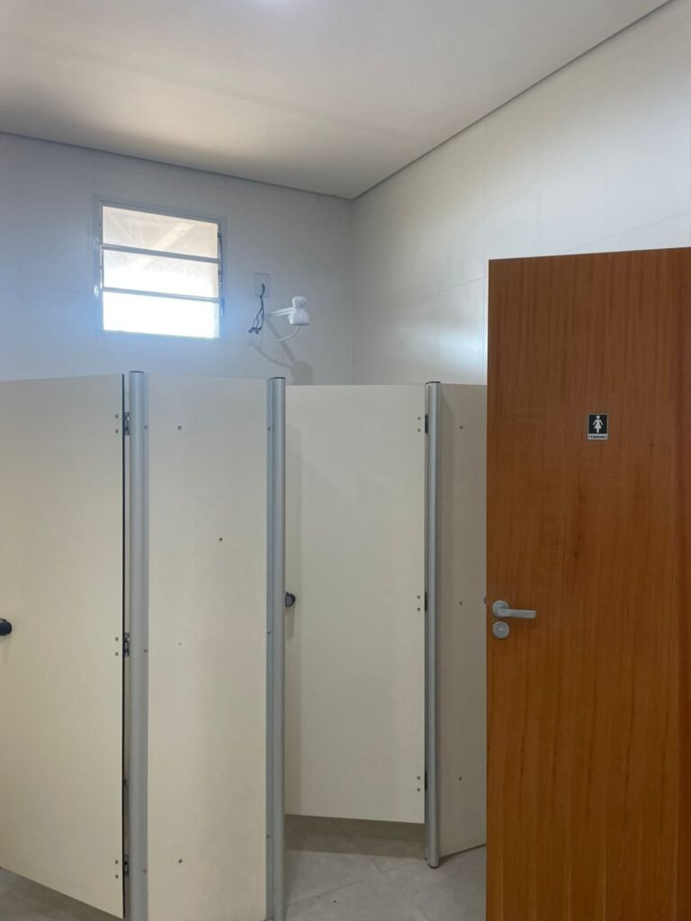 W.C FEMININO :- Porta de madeira envernizada e nova em ordem, fechadura e chaves em ordem, piso porcelanato em ordem, pia mármore em ordem, 02 cubas cerâmica branca Deca em ordem, 02 torneiras Celite em ordem, 02 sifão sanfonado universal em ordem, azulejo até o teto em ordem, 01 lustres embutidos com lâmpadas de LED em ordem, 03 lustres embutidos com lâmpadas de LED sem o prato, 02 vitrôs basculante com vidro blindex em ordem, trava em ordem, 03 Box com 03 portas em ordem, travas em ordem, 01 ralo tipo grade em ordem, 02 conjuntos de vaso sanitário e caixa acoplada de descarga em ordem, tampa de plástico em ordem, 01 registro com canopla em ordem, 01 vaso sanitário sem descarga, 01 chuveiro hydra duchaSS em ordem, 01 interruptor em ordem, espelho de luz em ordem, 03 divisórias com 03 portas em ordem, maçanetas em ordem.