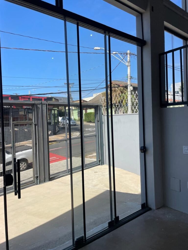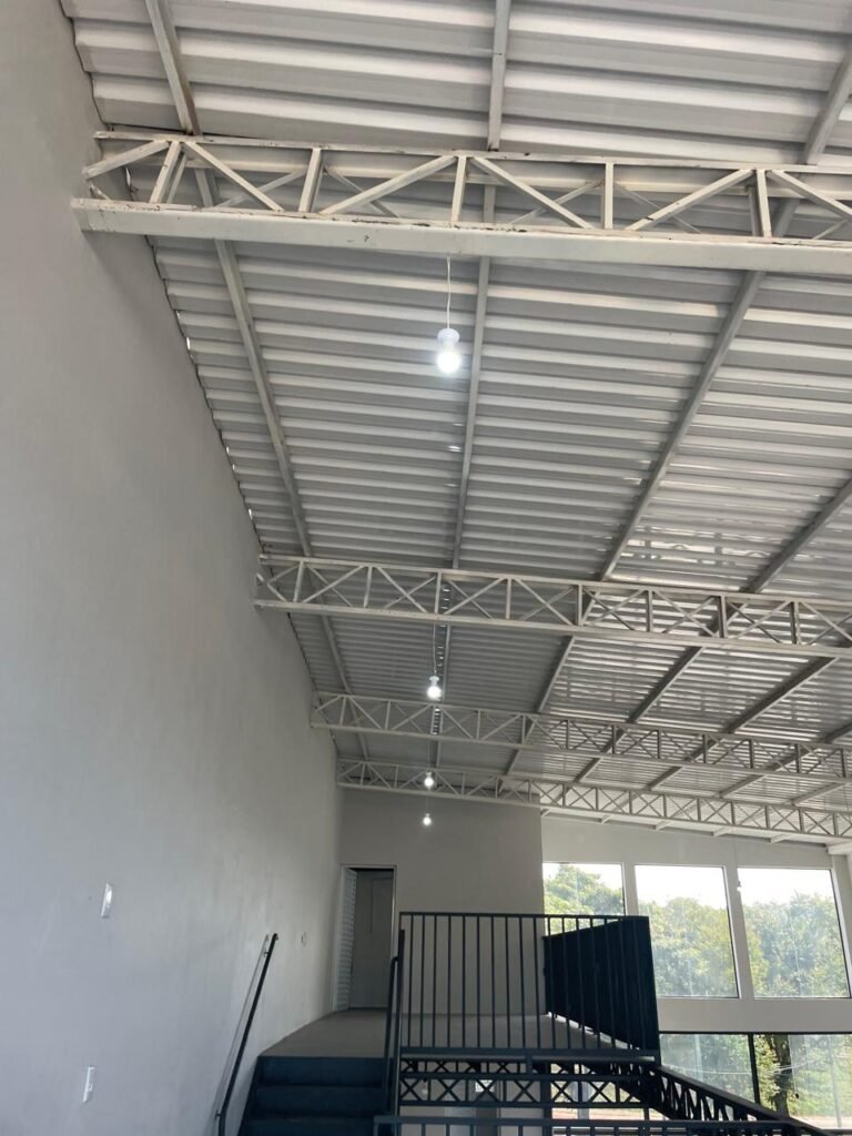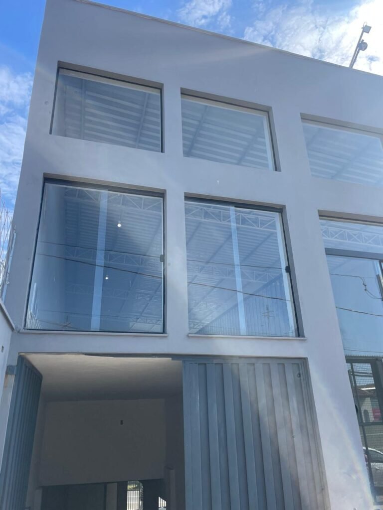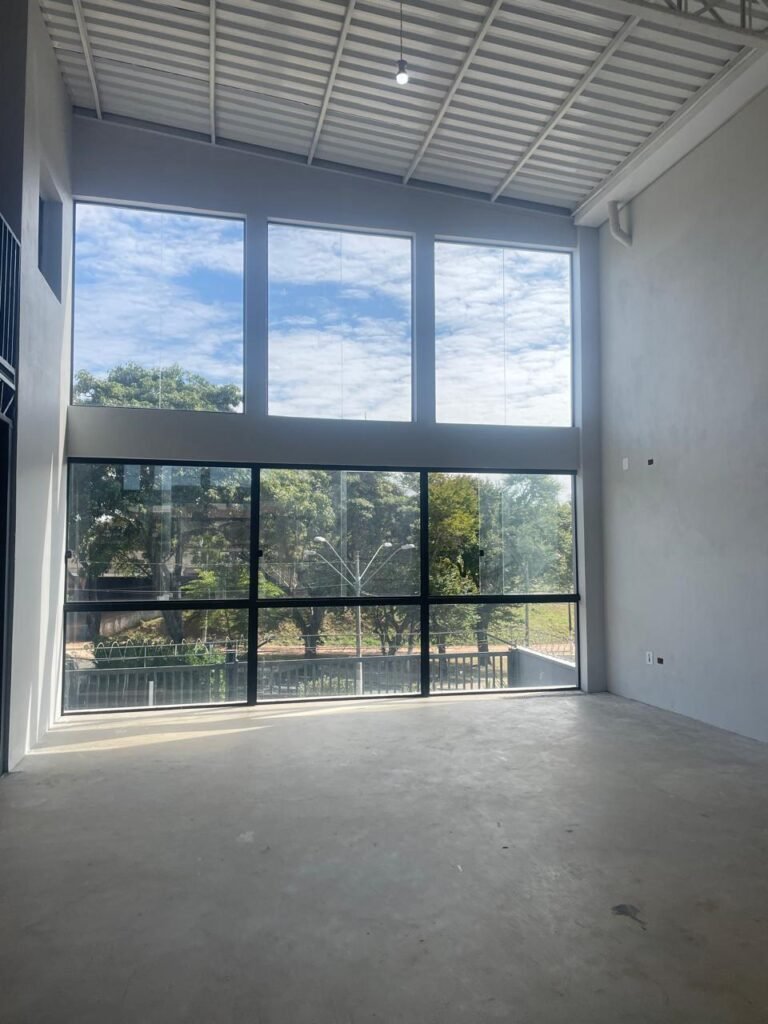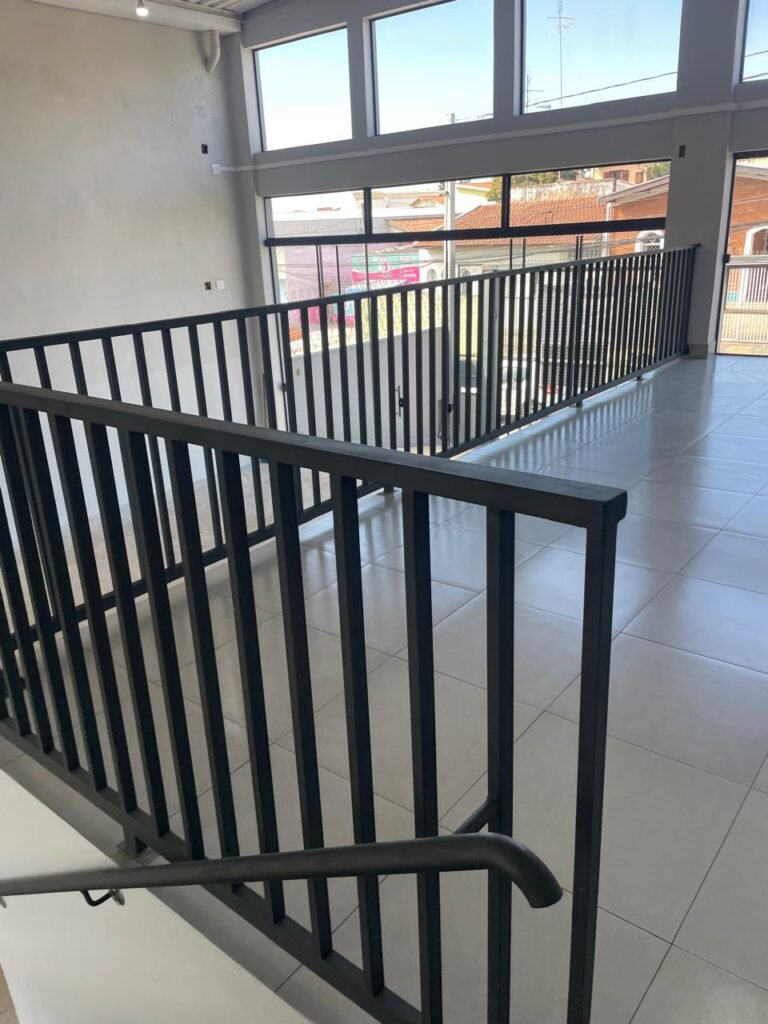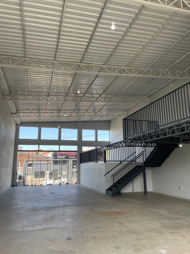 GALPÃO-: 06 Portas deslizantes em vidro liso, transparente, temperado em ordem, 02 kits de puxadores na cor preto em ordem, 04 fechaduras pacres em ordem, marca Hela com chave, 17 vidros fixos, transparentes e temperados em ordem, 05 janelas deslizantes em ordem, ambas com 02 vidros lisos, transparentes e temperados em ordem e também com 01 fechadura em ordem, piso de concreto usinado com desgastes naturais, manchas, rachaduras pela extensão e restante em ordem, 01 ralo grelha de ferro em ordem, paredes com pintura látex nova, na cor branco gelo em ordem, 24 espelhos de luz marca Tramontina em ordem, sendo eles: 01 espelho com 06 interruptores, 13 tomadas duplas (110v/220v) e 09 espelhos cegos. 02 tampas de inspeção de plástico em ordem, 17 pré instalação de espelhos de luz, 06 lâmpadas de led em ordem, telhado revestido de telhas galvanizadas com pintura nova na cor branco em ordem, 01 escada de ferro com pintura nova na cor cinza em ordem, corrimões e guarda-corpos em ordem, com pintura nova na cor cinza em ordem.
