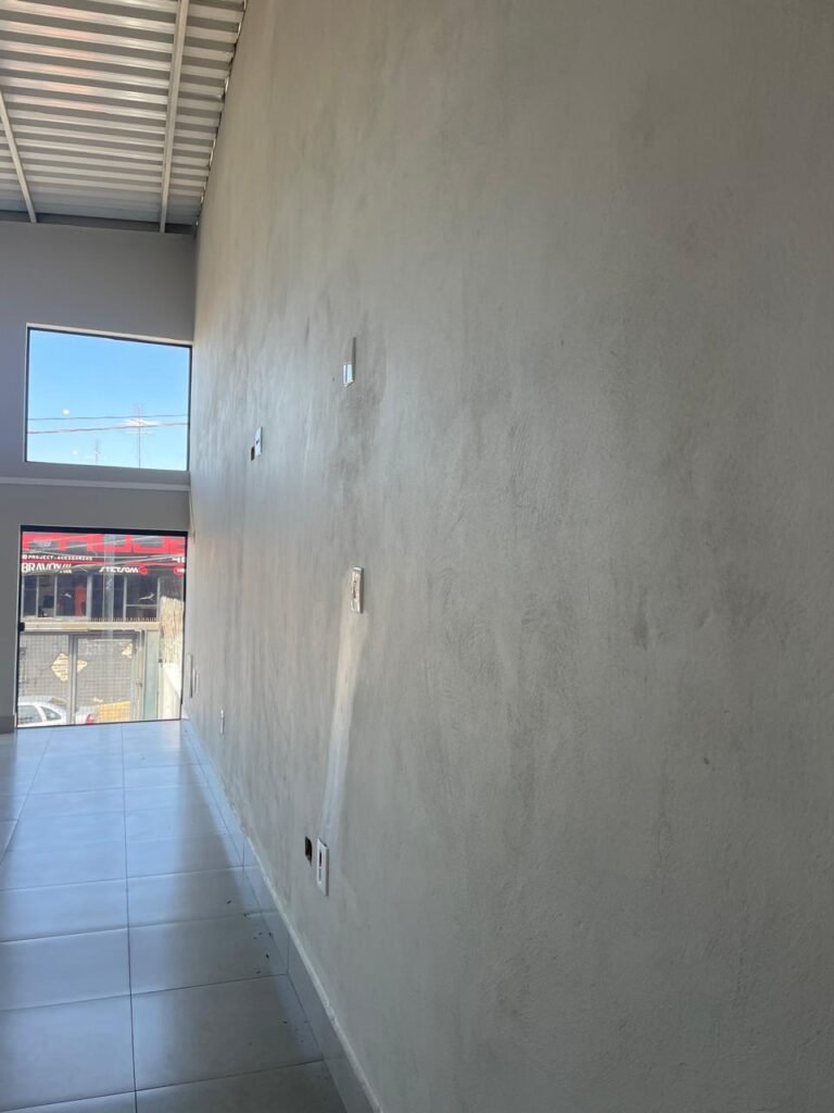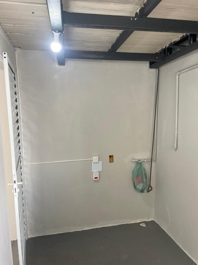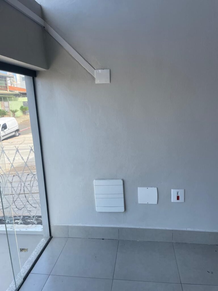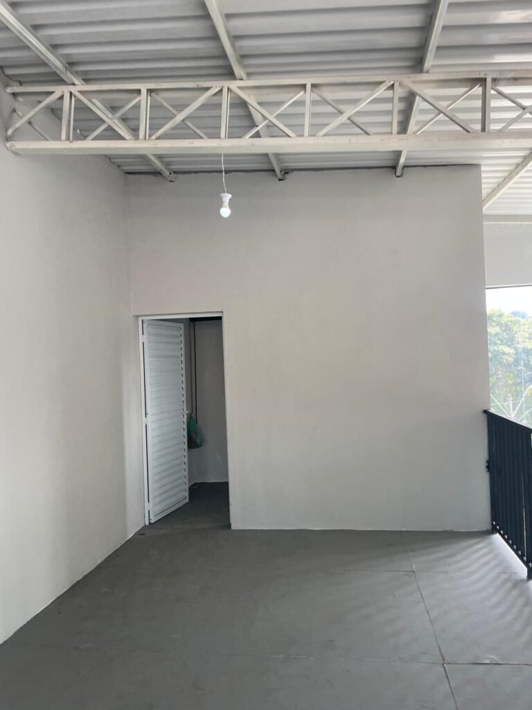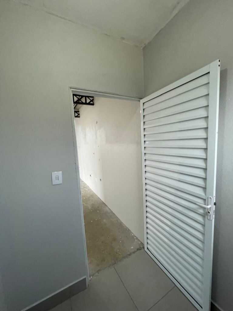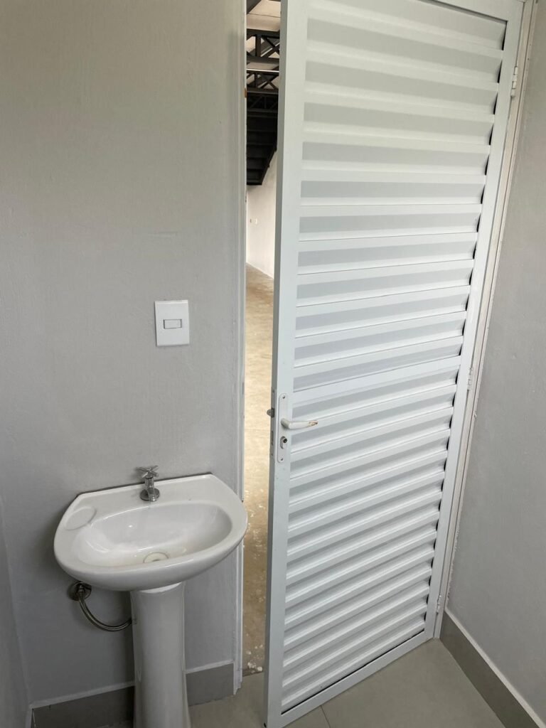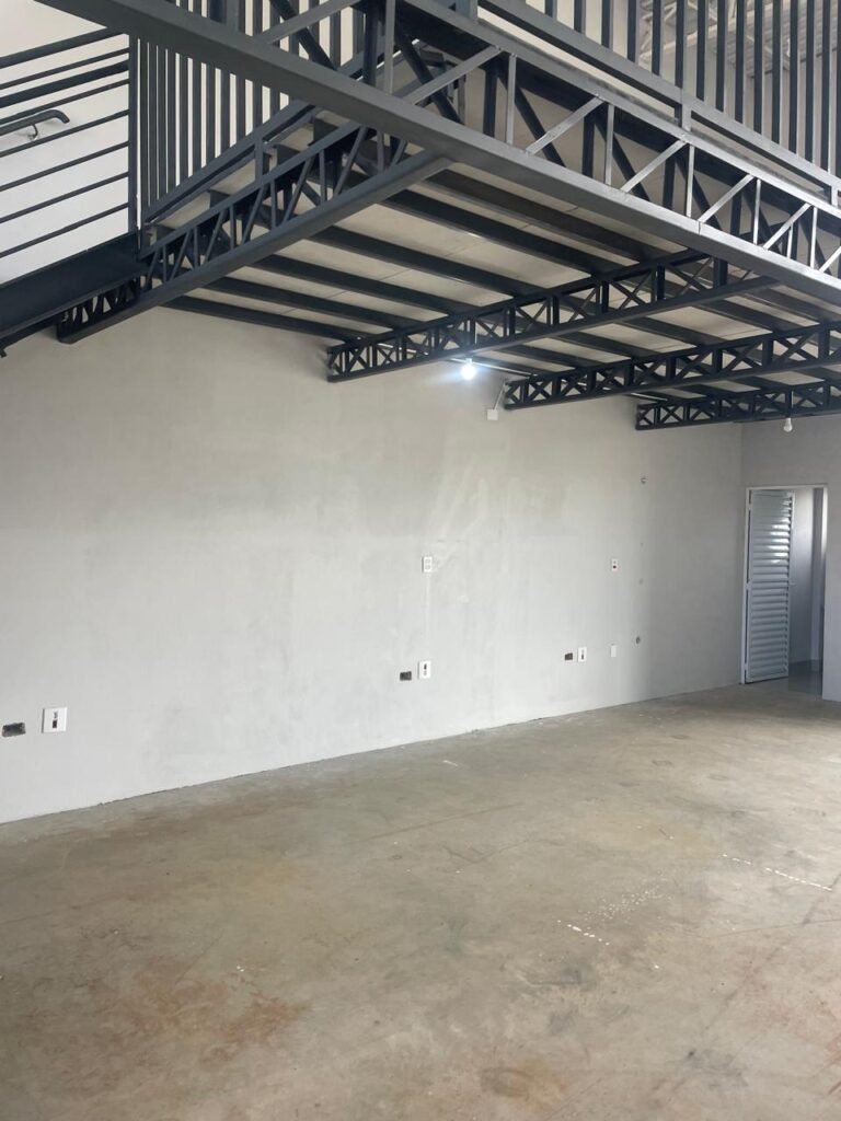SALA MEZANINO-: 01 Porta de alumínio cor branco em ordem, com maçaneta e fechadura marca Stam em ordem, piso de concreto com pintura na cor cinza em ordem, 01 ralo plástico branco em ordem, 02 espelhos de luz marca Tramontina, sendo eles: 01 espelho com 01 interruptor e 01 espelho com 02 tomadas ( 110v/220v), 01 tampa de plástico de inspeção em ordem, 01 pré instalação de espelho de luz em ordem, paredes com pintura látex nova, na cor cinza em ordem, canos PVC com 01 válvula em ordem, estrutura de ferro em ordem com 01 caixa d’água marca Acqualimp 500l em ordem, 01 lâmpada LED em ordem, 01 janela deslizante em ordem, com 01 fechadura em ordem e 02 folhas de vidro liso, transparente e temperado com manchas de tinta e restante em ordem.