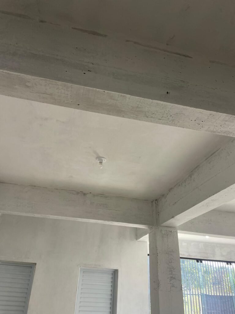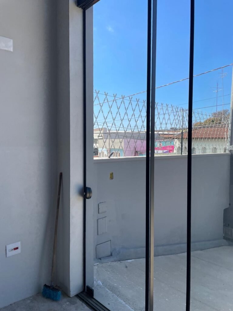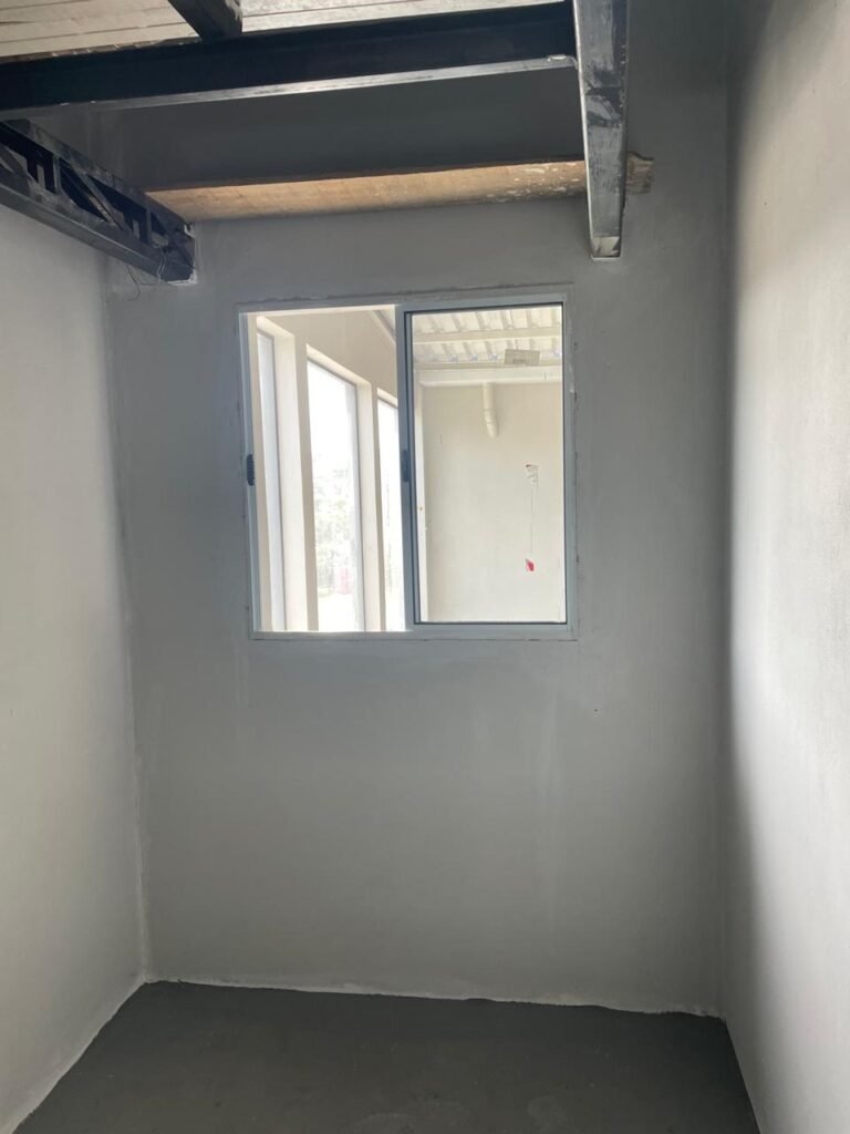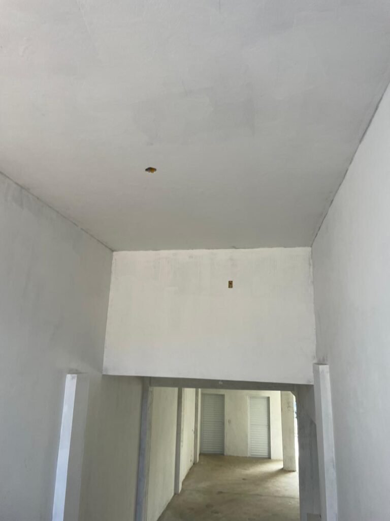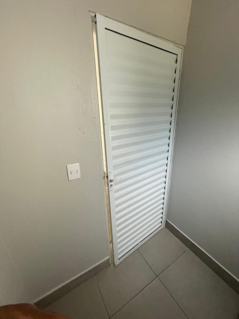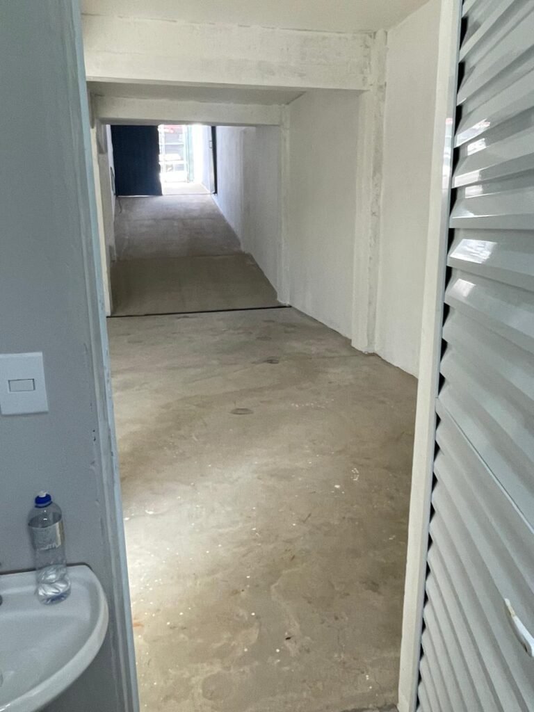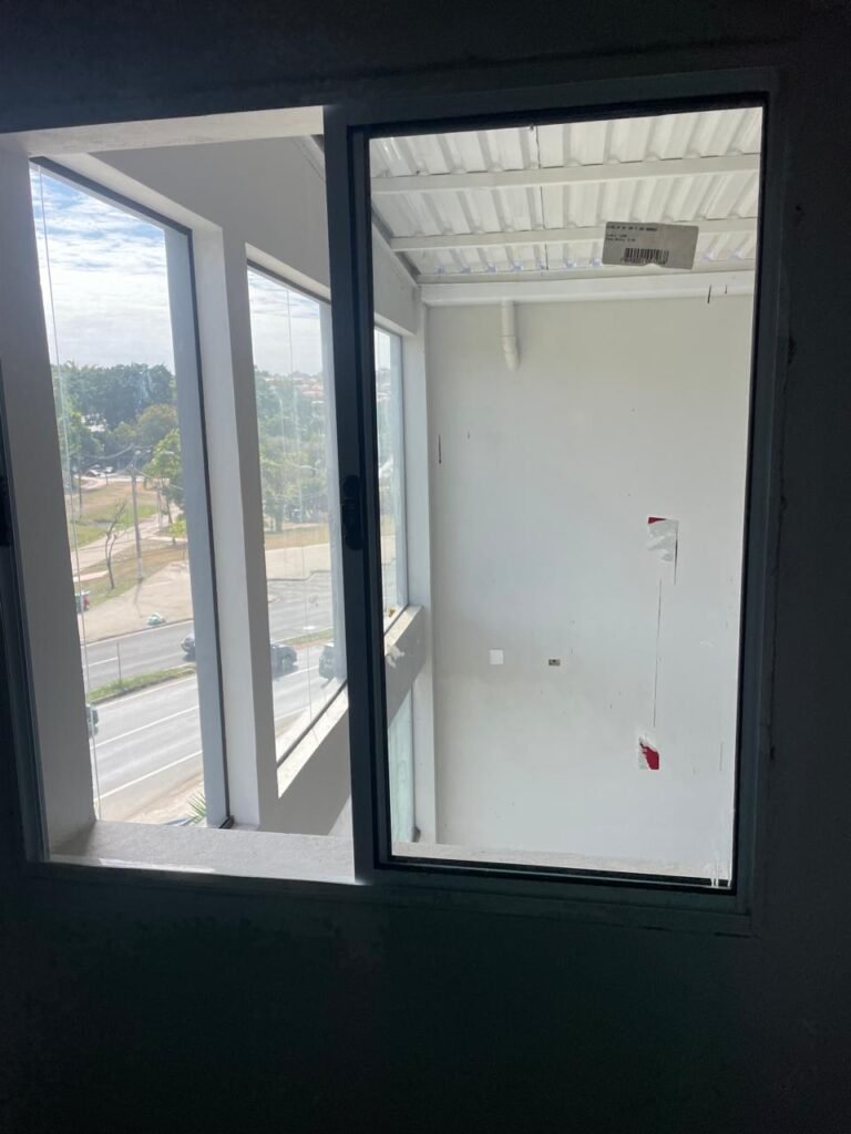SALA MEZANINO-: 01 Porta de alumínio cor branco em ordem, com maçaneta e fechadura marca Stam em ordem, piso de concreto com pintura na cor cinza em ordem, 01 ralo plástico branco em ordem, 02 espelhos de luz marca Tramontina, sendo eles: 01 espelho com 01 interruptor e 01 espelho com 02 tomadas ( 110v/220v), 01 tampa de plástico de inspeção em ordem, 01 pré instalação de espelho de luz em ordem, paredes com pintura látex nova, na cor cinza em ordem, canos PVC com 01 válvula em ordem, estrutura de ferro em ordem com 01 caixa d’água marca Acqualimp 500l em ordem, 01 lâmpada LED em ordem, 01 janela deslizante em ordem, com 01 fechadura em ordem e 02 folhas de vidro liso, transparente e temperado com manchas de tinta e restante em ordem.