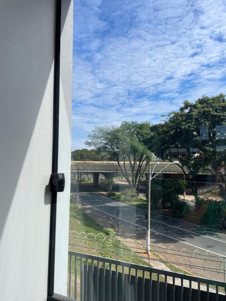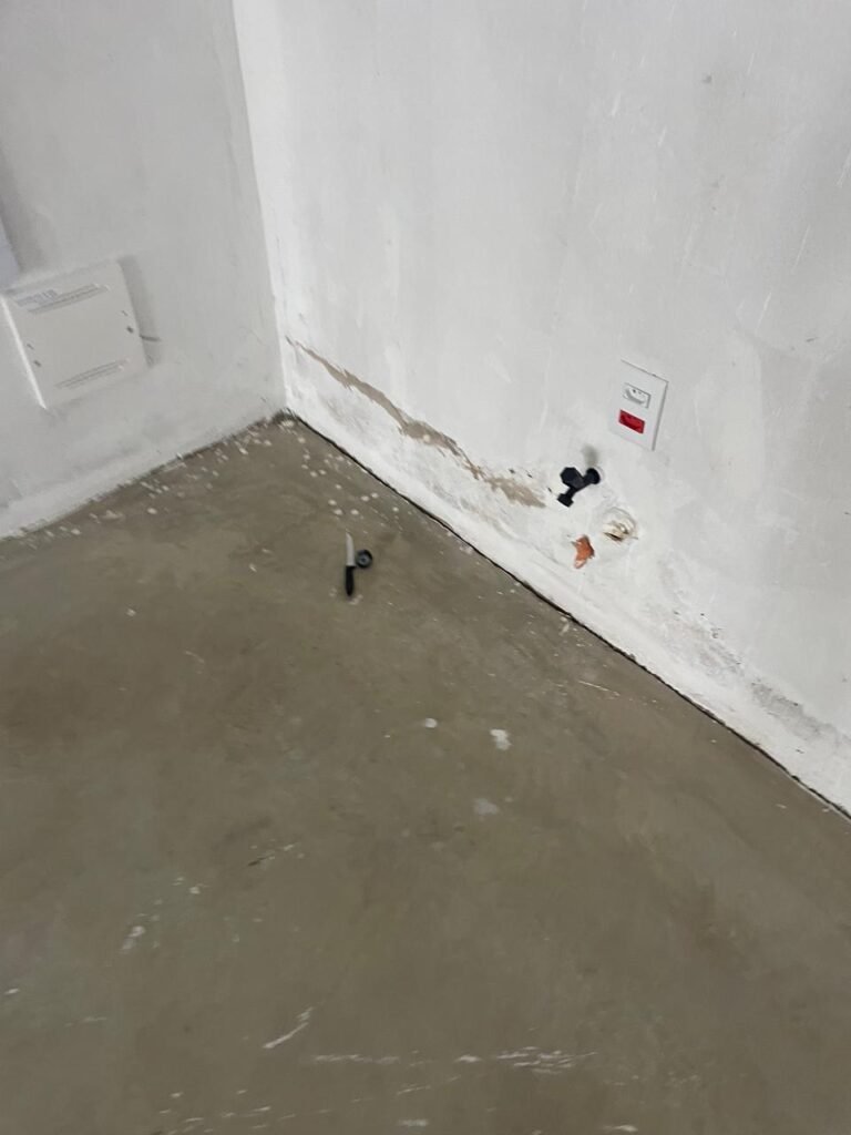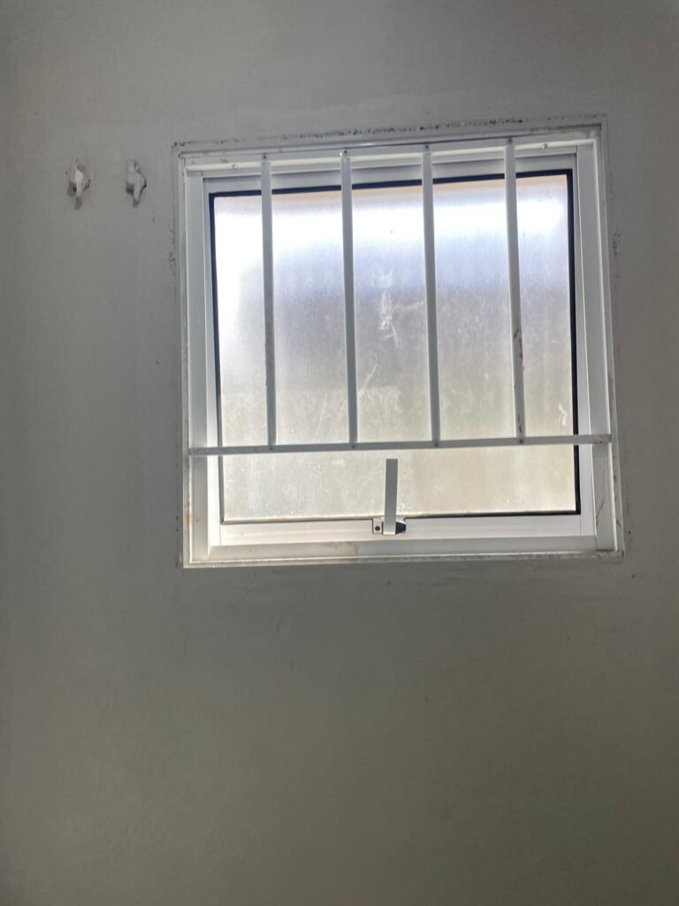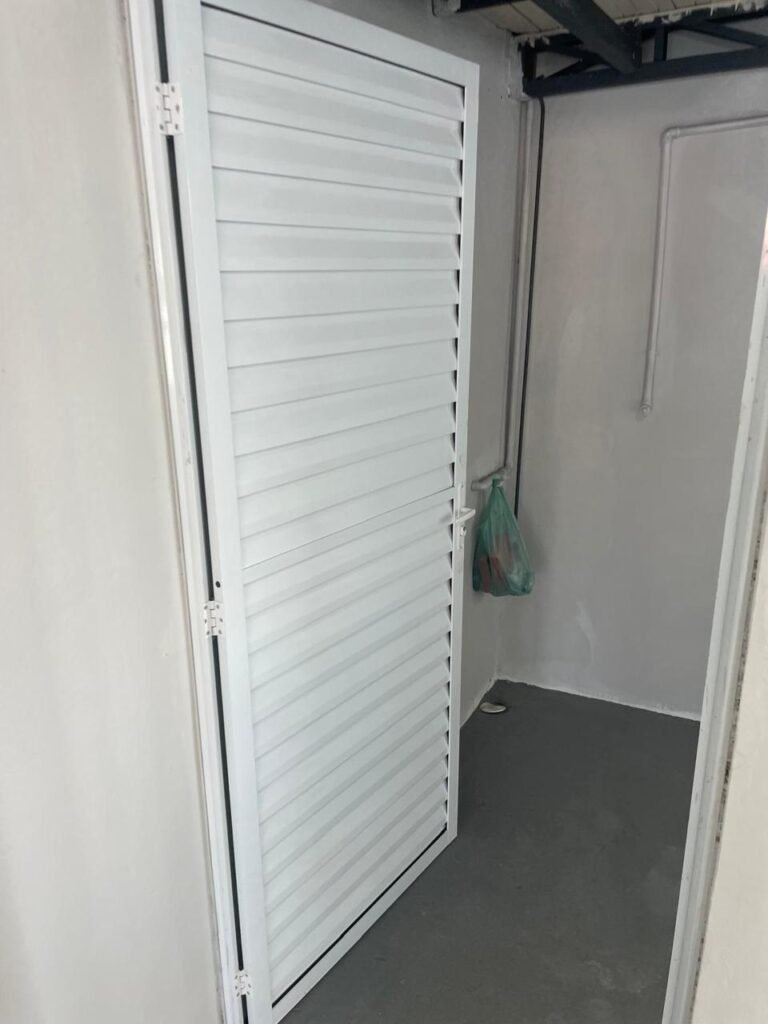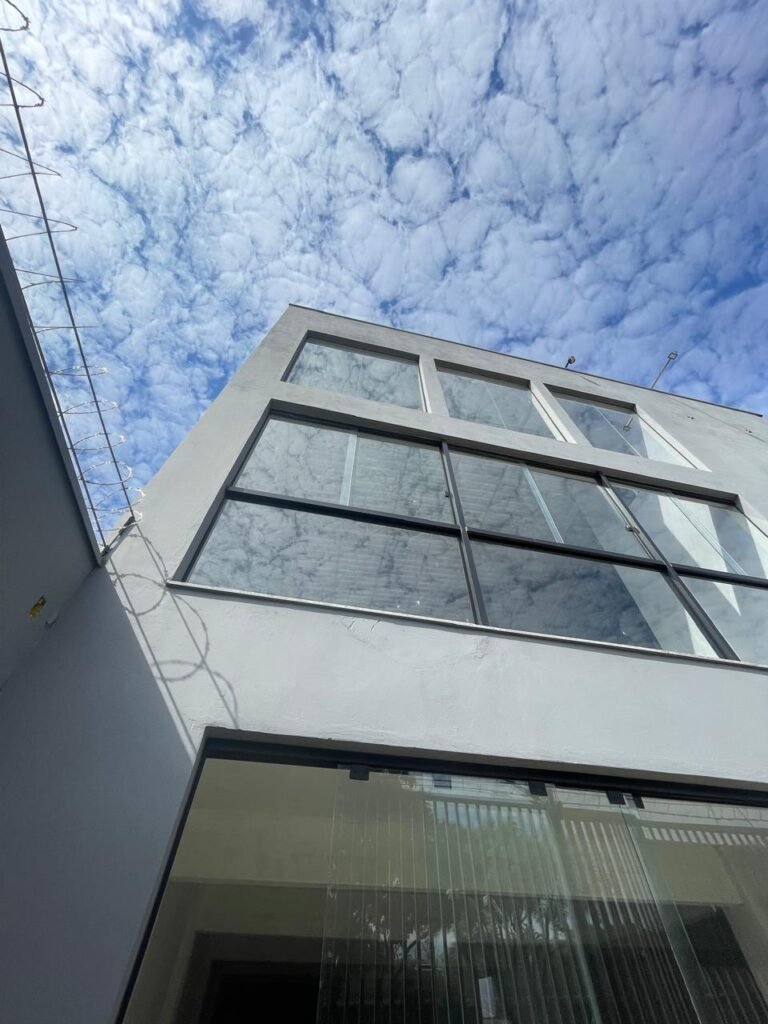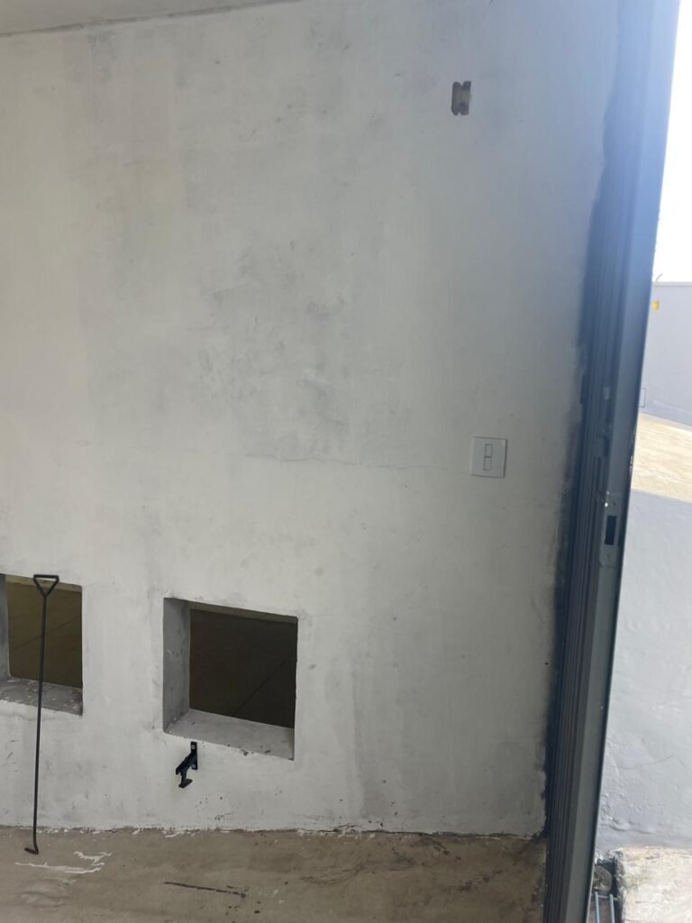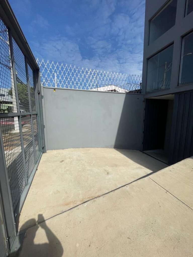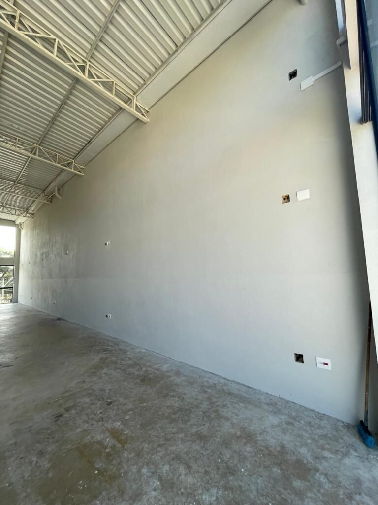 SALA MEZANINO-: 01 Porta de alumínio cor branco em ordem, com maçaneta e fechadura marca Stam em ordem, piso de concreto com pintura na cor cinza em ordem, 01 ralo plástico branco em ordem, 02 espelhos de luz marca Tramontina, sendo eles: 01 espelho com 01 interruptor e 01 espelho com 02 tomadas ( 110v/220v), 01 tampa de plástico de inspeção em ordem, 01 pré instalação de espelho de luz em ordem, paredes com pintura látex nova, na cor cinza em ordem, canos PVC com 01 válvula em ordem, estrutura de ferro em ordem com 01 caixa d’água marca Acqualimp 500l em ordem, 01 lâmpada LED em ordem, 01 janela deslizante em ordem, com 01 fechadura em ordem e 02 folhas de vidro liso, transparente e temperado com manchas de tinta e restante em ordem.