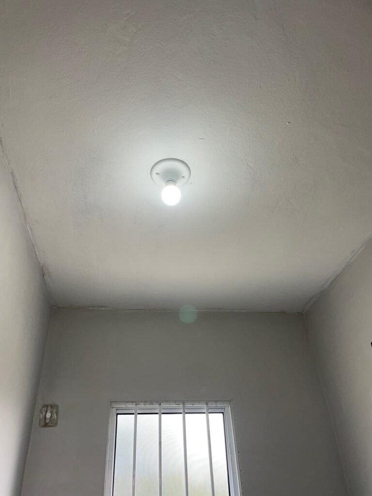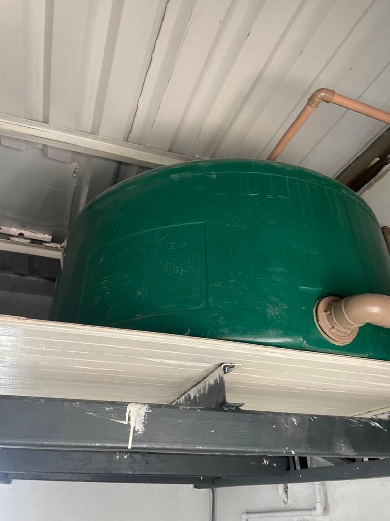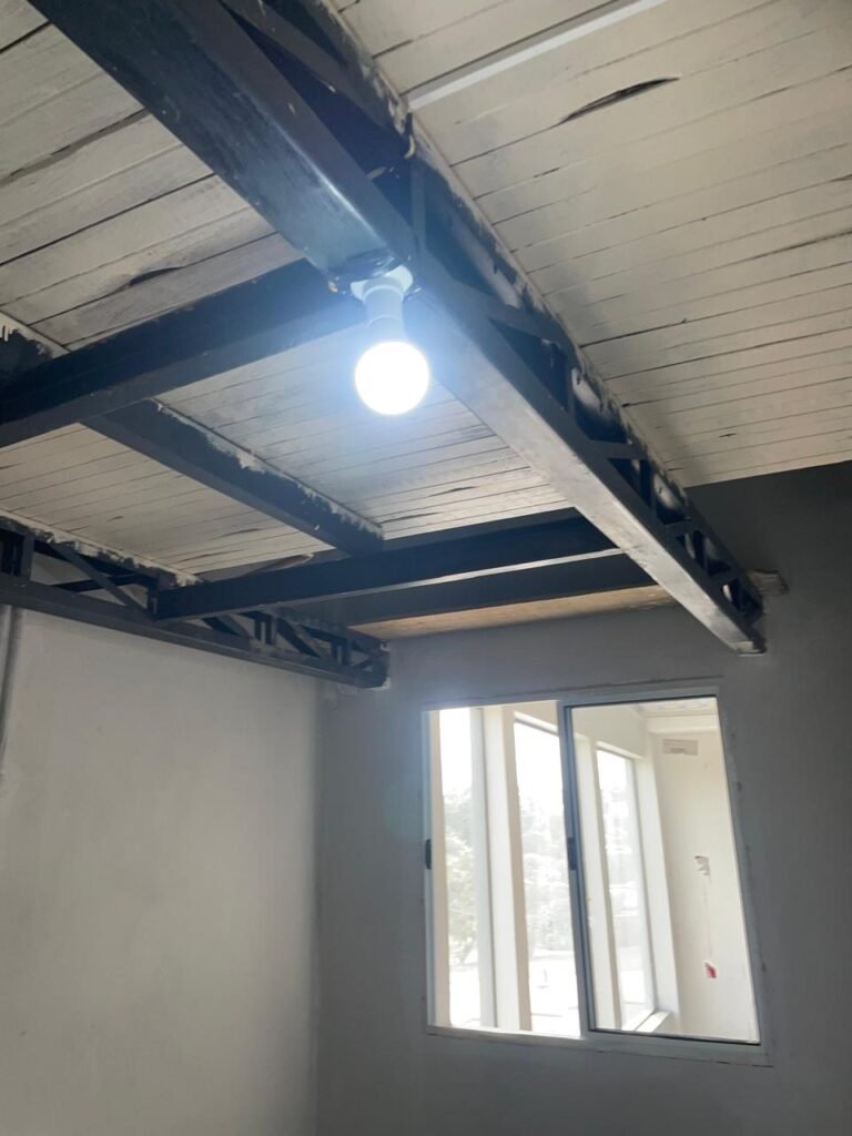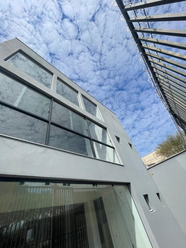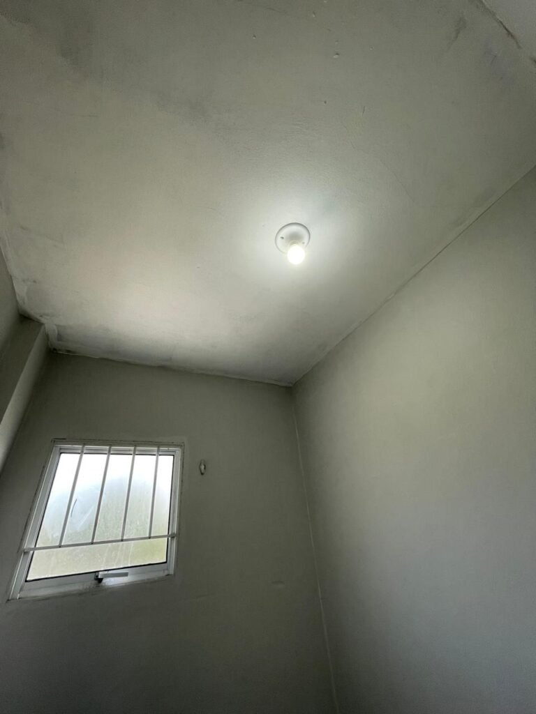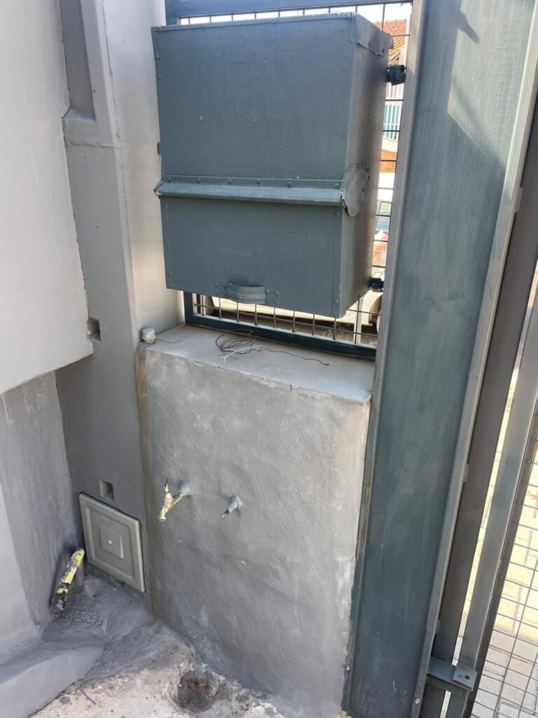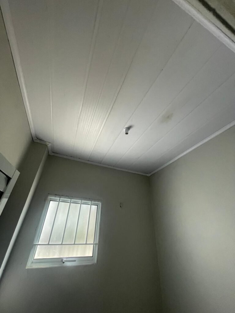 SALA MEZANINO-: 01 Porta de alumínio cor branco em ordem, com maçaneta e fechadura marca Stam em ordem, piso de concreto com pintura na cor cinza em ordem, 01 ralo plástico branco em ordem, 02 espelhos de luz marca Tramontina, sendo eles: 01 espelho com 01 interruptor e 01 espelho com 02 tomadas ( 110v/220v), 01 tampa de plástico de inspeção em ordem, 01 pré instalação de espelho de luz em ordem, paredes com pintura látex nova, na cor cinza em ordem, canos PVC com 01 válvula em ordem, estrutura de ferro em ordem com 01 caixa d’água marca Acqualimp 500l em ordem, 01 lâmpada LED em ordem, 01 janela deslizante em ordem, com 01 fechadura em ordem e 02 folhas de vidro liso, transparente e temperado com manchas de tinta e restante em ordem.