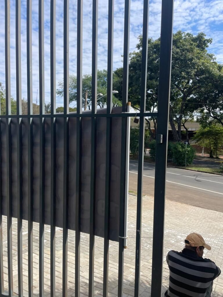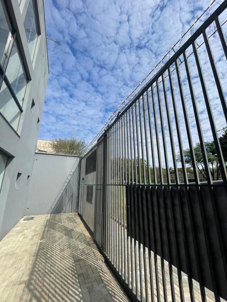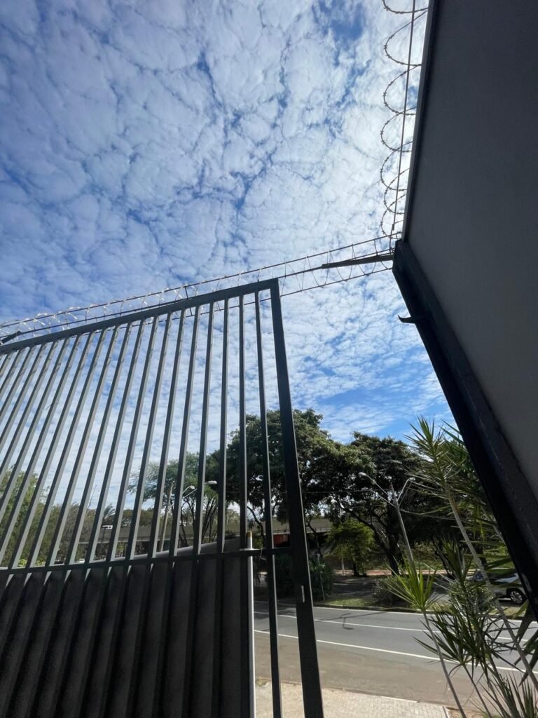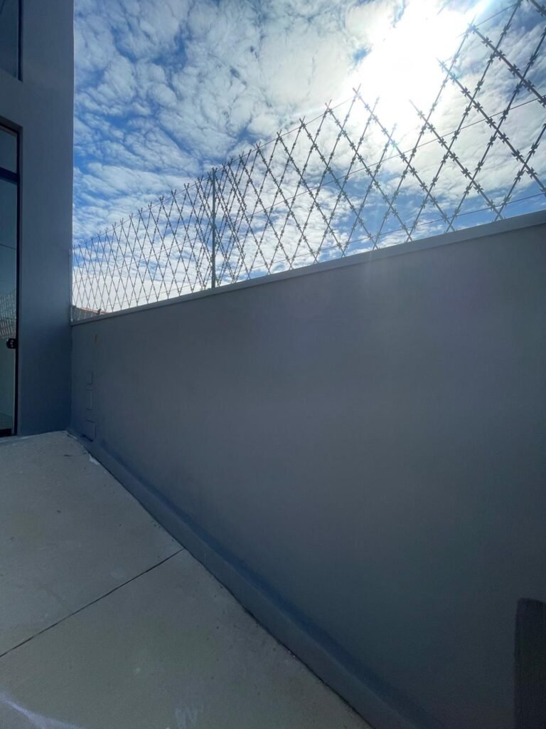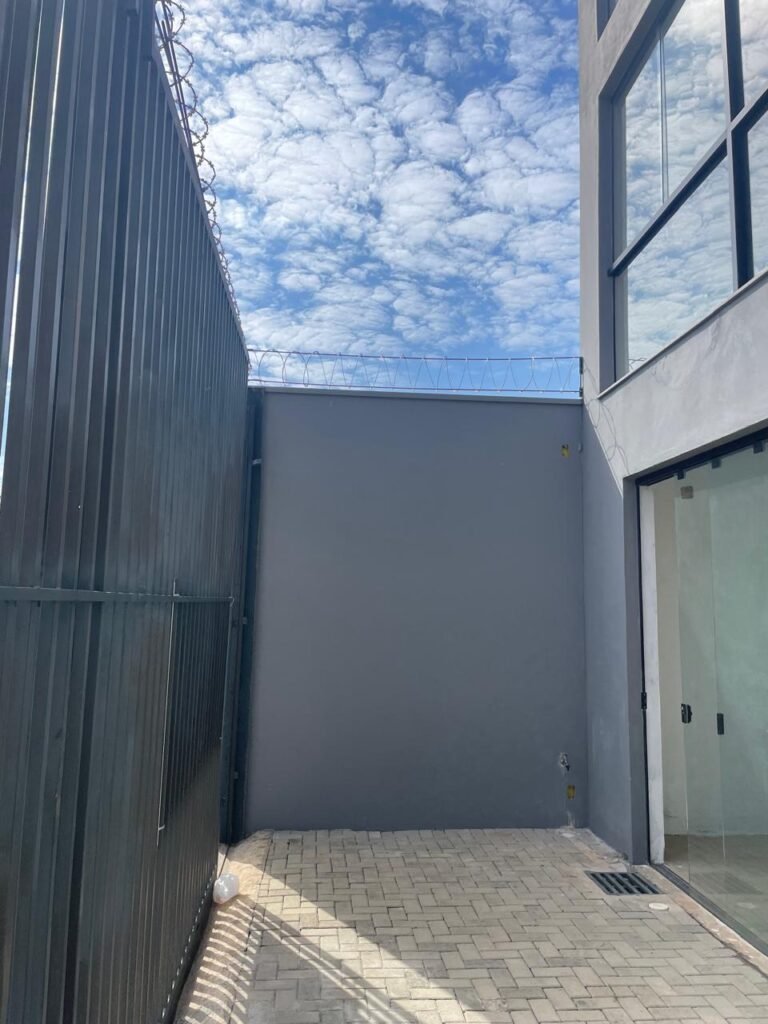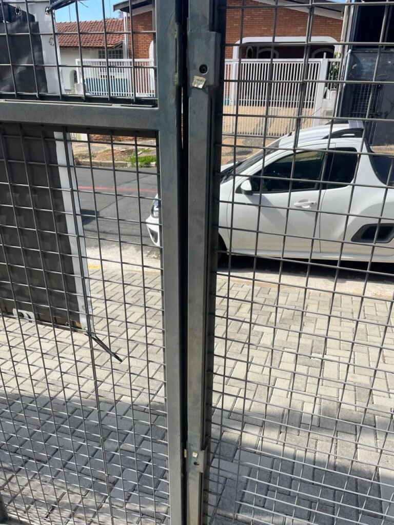 FUNDOS-: Piso em bloquetes intertravados em ordem, 01 ralo em grelhas de ferro em ordem, 01 ralo de plástico branco em ordem, 05 tampas de plástico na cor branco de inspeção em ordem, muros laterais e paredes do imóvel com pintura látex nova, cor cinza em ordem, cercas serpentinas em ordem, 01 torneira de Jardim em ordem, 04 pré-instalações de espelhos de luz em ordem, 01 refletor em ordem, 01 câmera não testada, 01 portão deslizante em gradil de ferro em ordem, com pintura na cor cinza com desgastes naturais e com pigmentos de ferrugem, portão emperrando para abrir, 02 trincos para cadeado, 01 cadeado marca Fecab em ordem e com chave, 01 portão em gradil de ferro com pintura na cor cinza com desgastes naturais e com pigmentos de ferrugem, com 01 porta social, contendo 01 fechadura start marca Stam em ordem e com chave, cercas serpentinas em ordem.