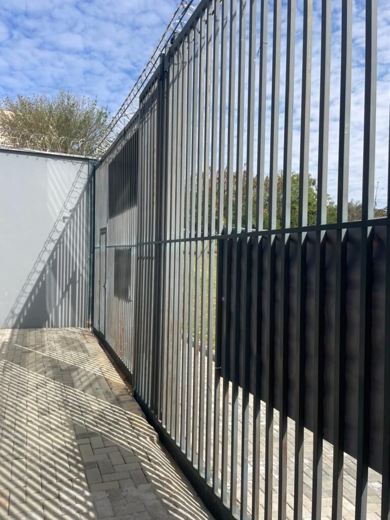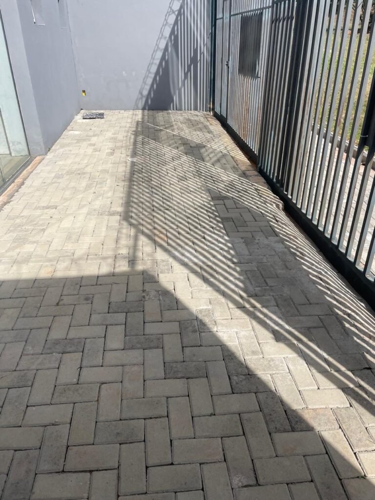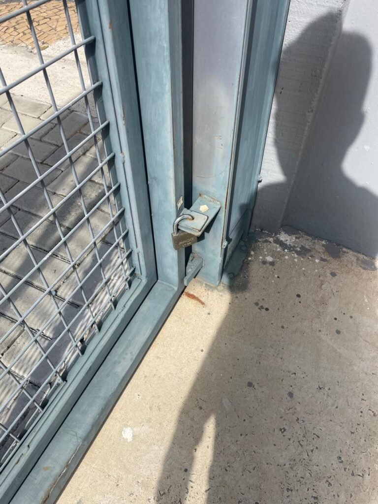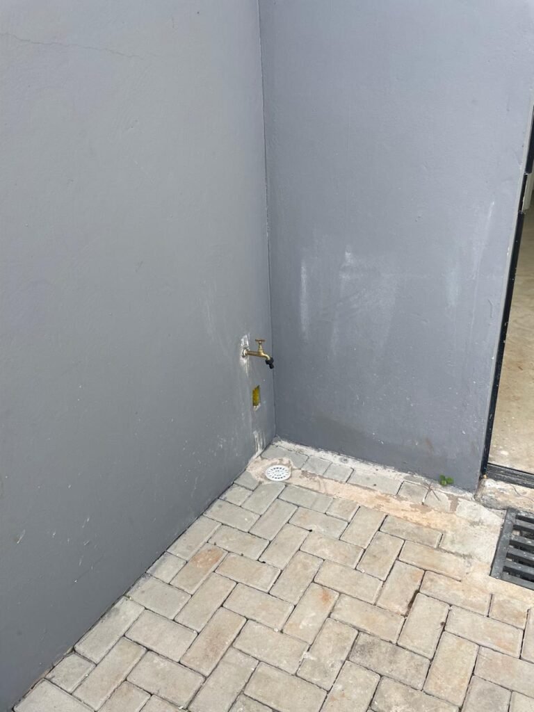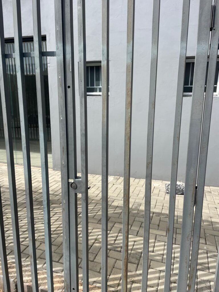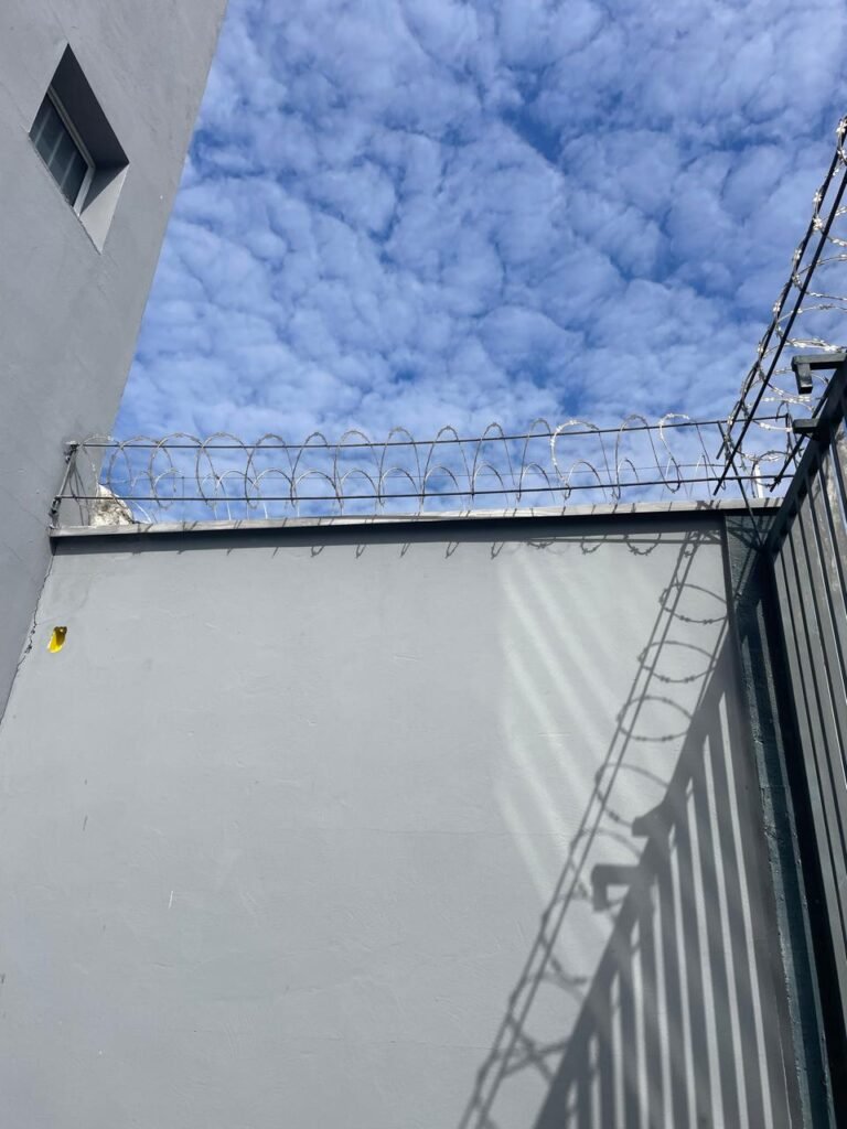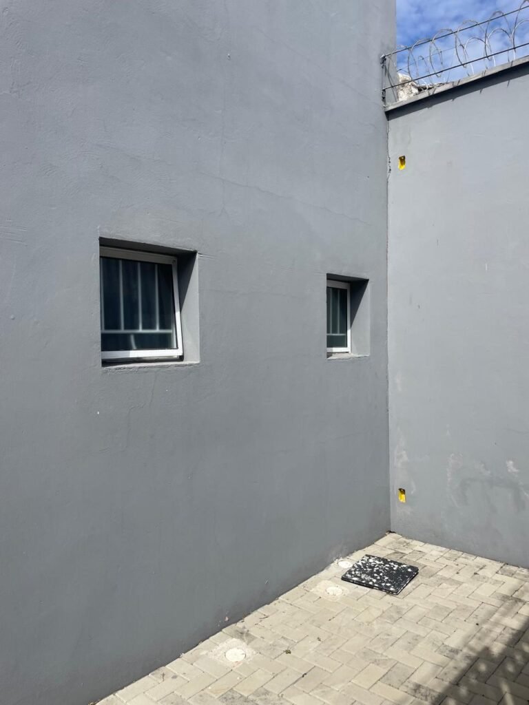 FUNDOS-: Piso em bloquetes intertravados em ordem, 01 ralo em grelhas de ferro em ordem, 01 ralo de plástico branco em ordem, 05 tampas de plástico na cor branco de inspeção em ordem, muros laterais e paredes do imóvel com pintura látex nova, cor cinza em ordem, cercas serpentinas em ordem, 01 torneira de Jardim em ordem, 04 pré-instalações de espelhos de luz em ordem, 01 refletor em ordem, 01 câmera não testada, 01 portão deslizante em gradil de ferro em ordem, com pintura na cor cinza com desgastes naturais e com pigmentos de ferrugem, portão emperrando para abrir, 02 trincos para cadeado, 01 cadeado marca Fecab em ordem e com chave, 01 portão em gradil de ferro com pintura na cor cinza com desgastes naturais e com pigmentos de ferrugem, com 01 porta social, contendo 01 fechadura start marca Stam em ordem e com chave, cercas serpentinas em ordem.