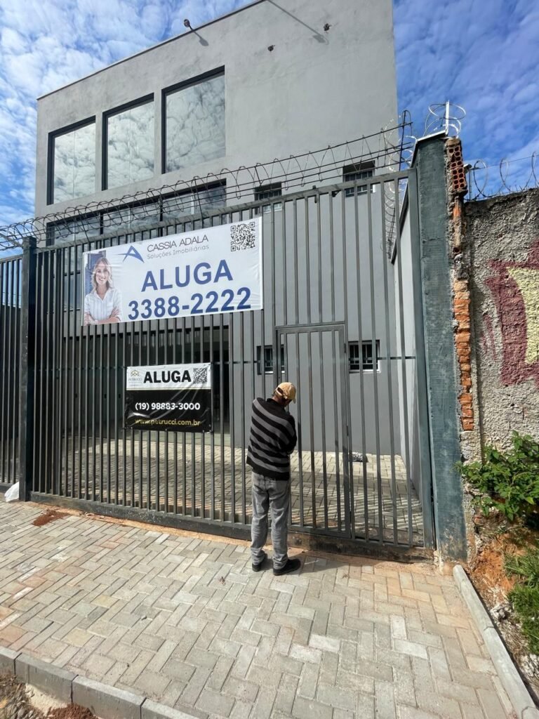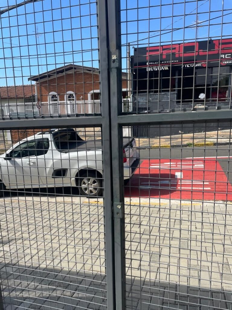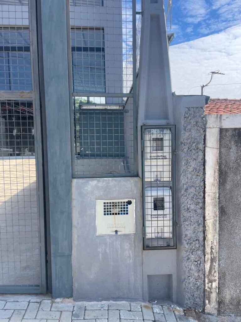 FACHADA-: Calçada revestida de bloquetes intertravados em ordem, mureta de alvenaria com pintura látex na cor cinza com desgastes naturais, 01 hidrômetro padrão sanasa em ordem, com tampa de proteção em lacre em ordem, 01 Poste padrão Concrefer em ordem, com pintura látex barrada na cor cinza com desgastes naturais e restante em ordem, 02 quadros de distribuição para medidores elétricos com tampa de proteção marca Concrefer em ordem, gradil de ferro de proteção com 02 trincos para cadeado, 01 medidor elétrico padrão CPFL em ordem, 02 portões basculantes, em gradil de ferro em ordem, com dígitos em cerâmica “5-0-1” em ordem, pintura na cor cinza com desgastes naturais, lanças de aço de proteção em ordem, ambos portões contendo 01 trinco para puxador, 02 trincos para cadeado, 01 porta social em gradil de ferro, contendo 02 fechaduras tetras em ordem, marca Stam e com chaves, piso da fachada em concreto usinado com manchas de tinta e restante em ordem, muros laterais em ordem, com pintura látex nova na cor cinza em ordem, cerca tipo arame farpado em ordem, 01 Caixa de correspondência de ferro com porta e puxador em ordem, 03 tampas de inspeção de fiação com pintura na cor cinza em ordem, parede do imóvel com pintura látex nova na cor cinza em ordem, 01 refletor em ordem, 01 ralo em grelhas de ferro em ordem.