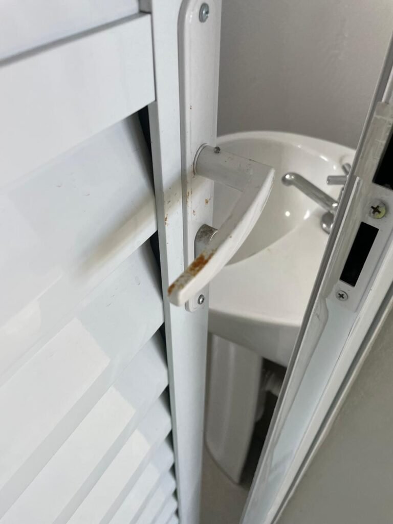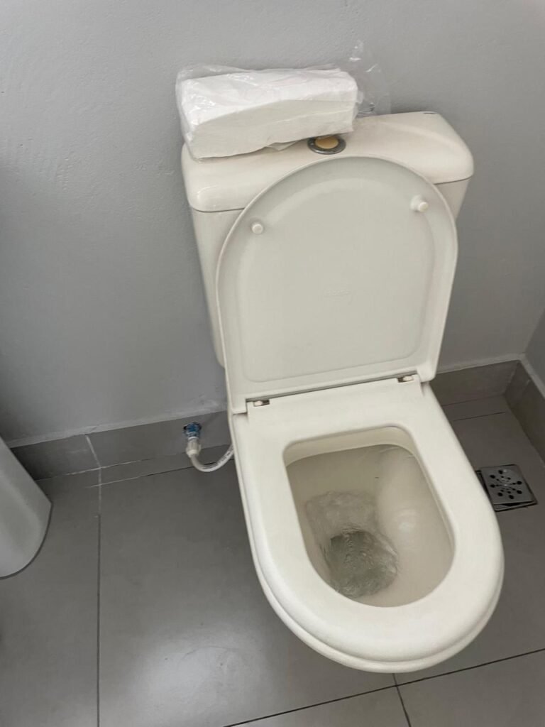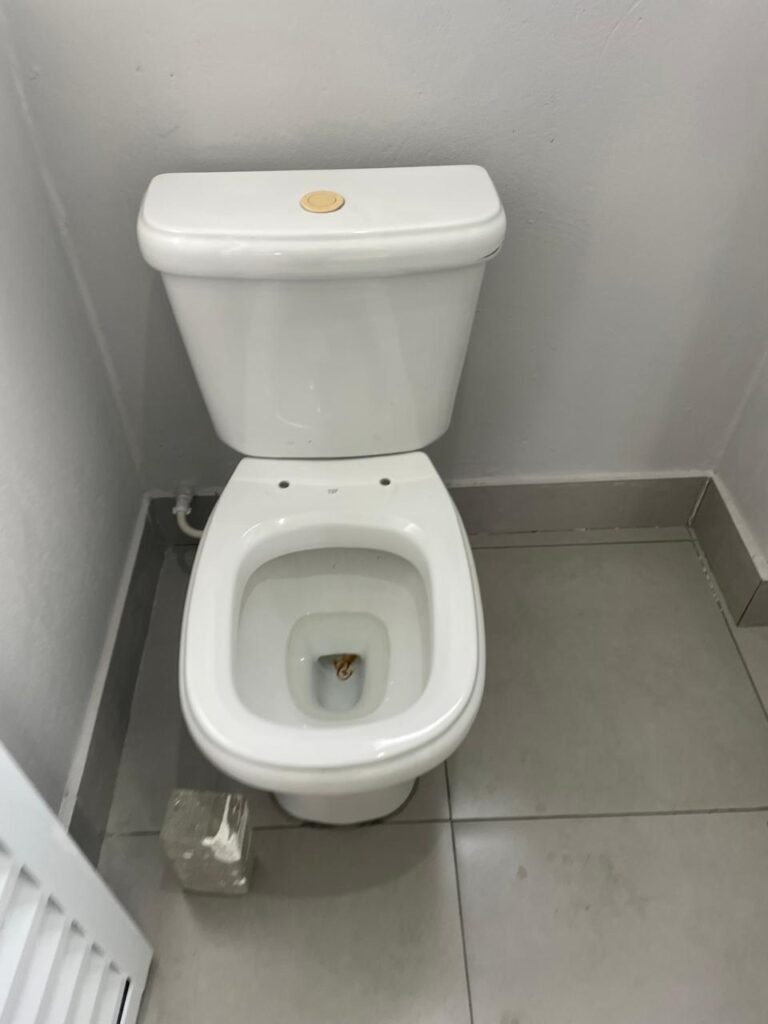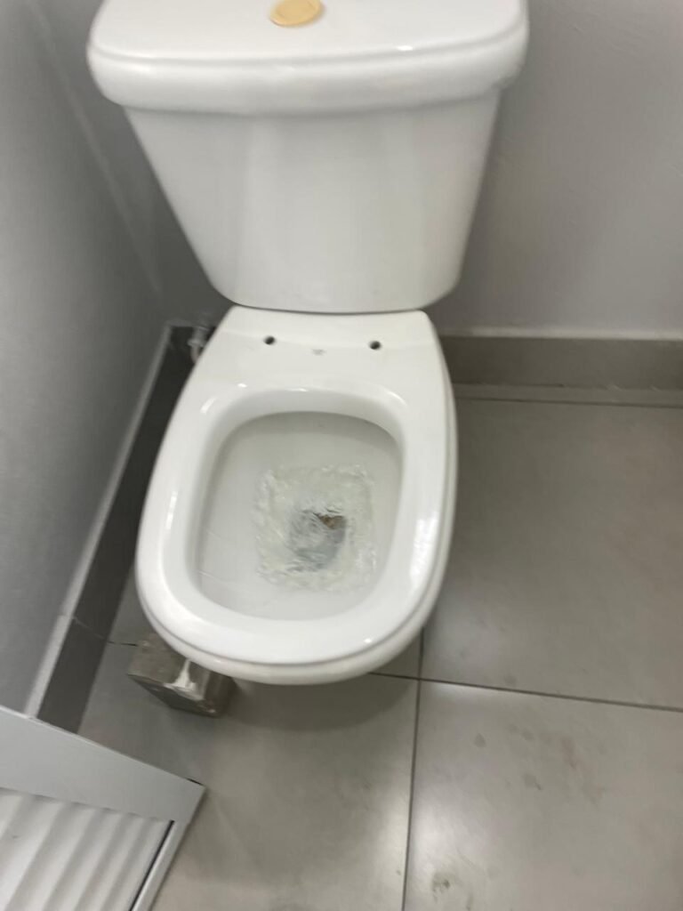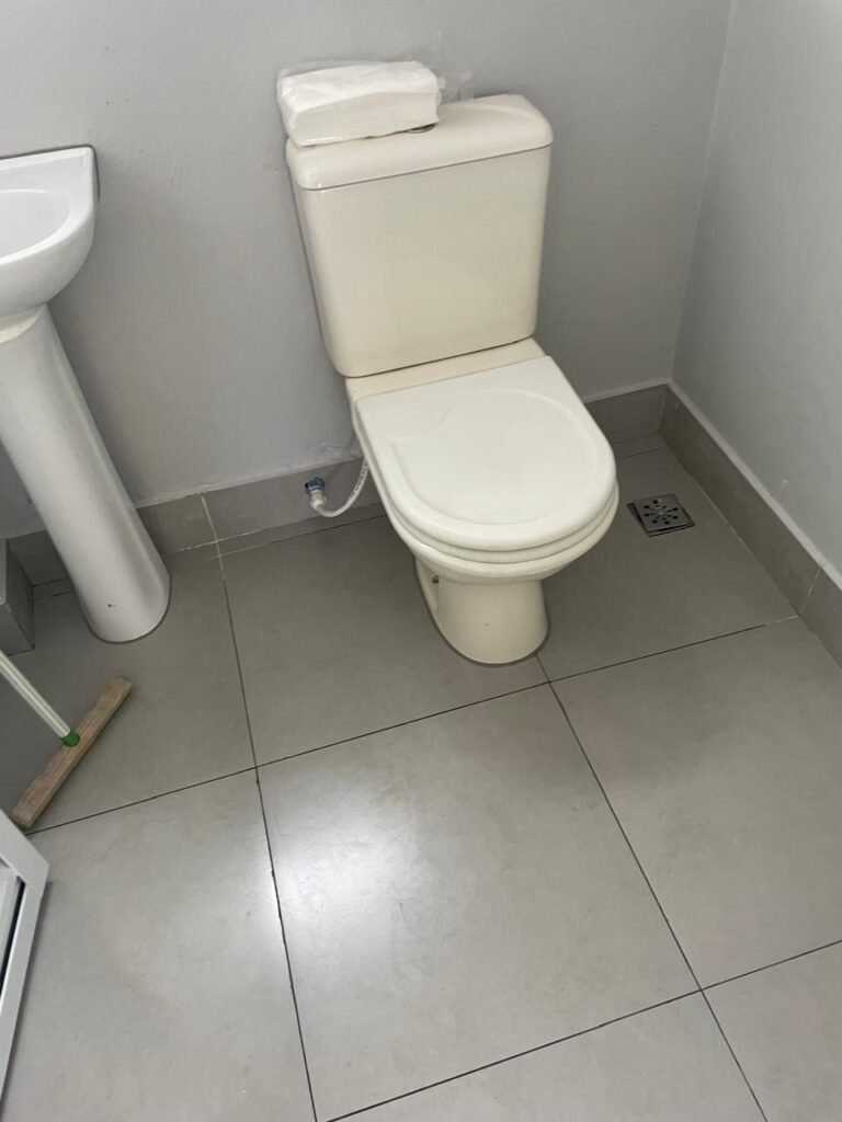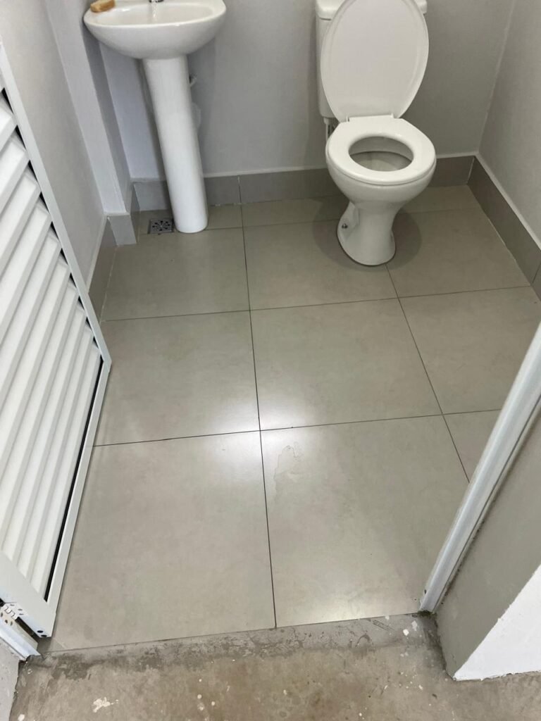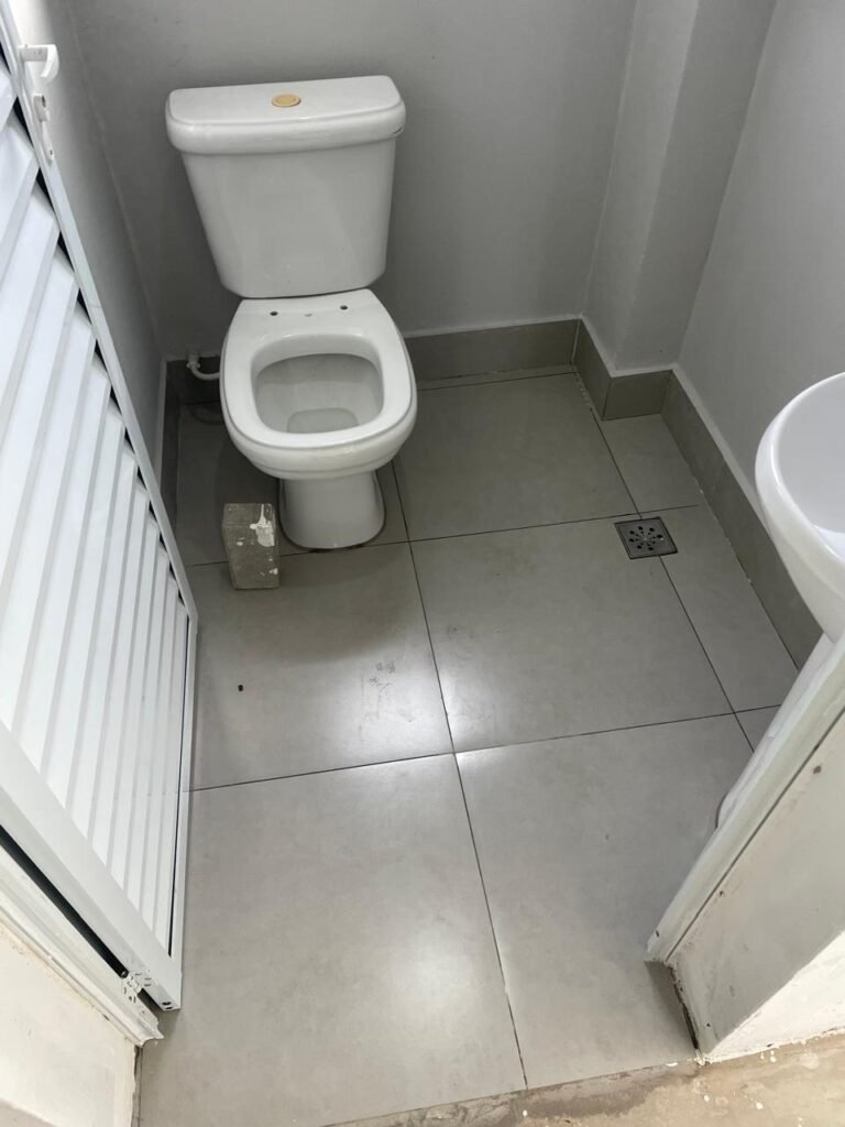 WC 01-: 01 Porta de alumínio nova, na cor branco em ordem, com maçanetas e fechadura marca Stam em ordem, piso e rodapé revestido de pisos de porcelanato na cor cinza em ordem, 01 ralo em inox em ordem, paredes com pintura látex nova, na cor cinza em ordem, 01 conjunto sanitário de cerâmica na cor branco em ordem, marca Celite, com acento e tampa novo, marca Celite em ordem, válvula de descarga em inox acoplada em ordem, descarga em ordem, conjunto lavatório de cerâmica na cor branco em ordem, marca Icasa, 01 torneira em inox marca Cemar em ordem, 01 espelho de luz marca Tramontina em ordem, com 01 interruptor em ordem, 01 vitrô basculante em ordem, com 01 fechadura em ordem, com grade de ferro de proteção em ordem, 01 folha de acrílico com manchas de tinta e restante em ordem, 01 válvula de registro em ordem, teto com pintura látex na cor branco neve nova, com manchas de tinta cinza e restante em ordem, 01 lâmpada LED em ordem.