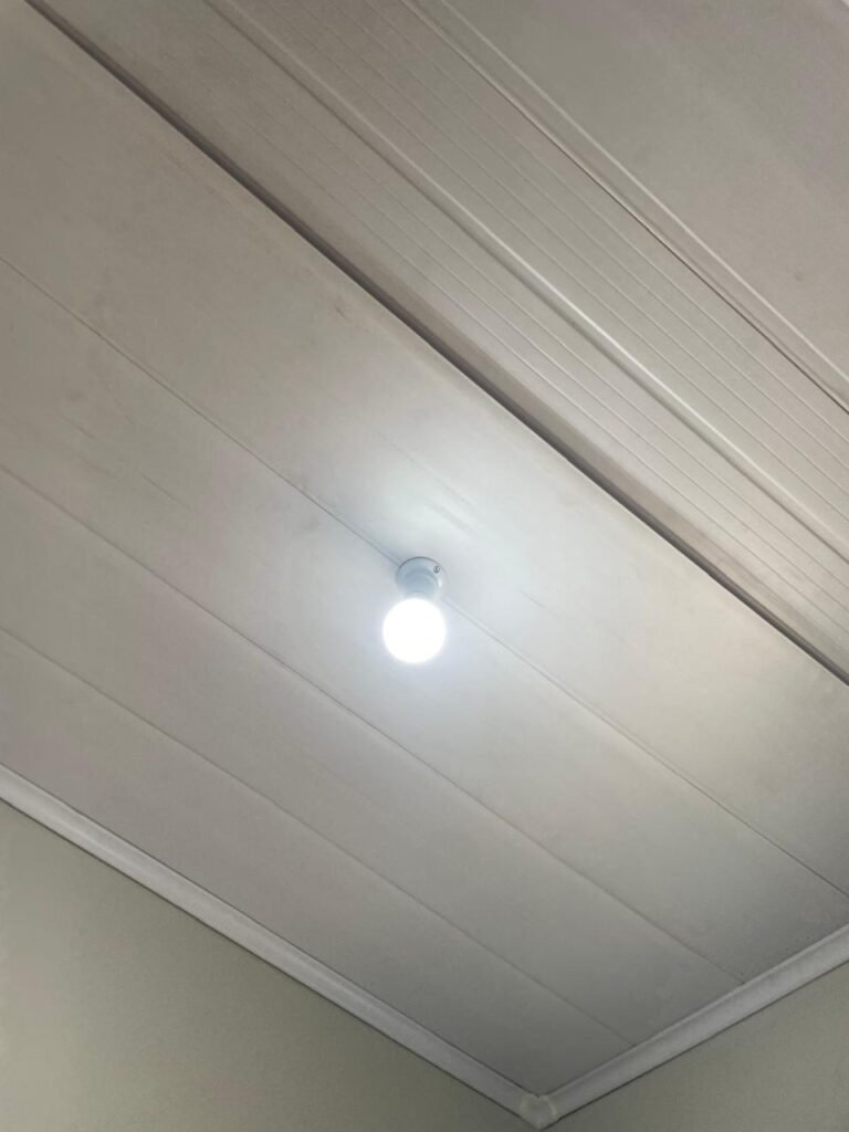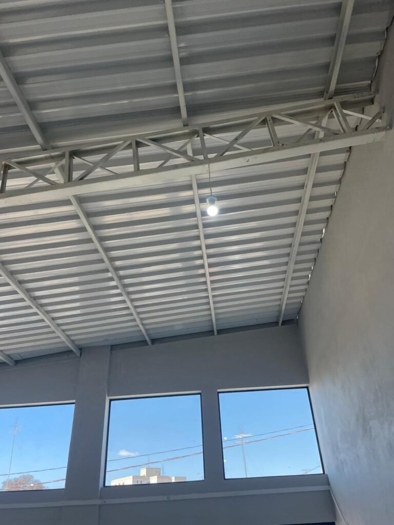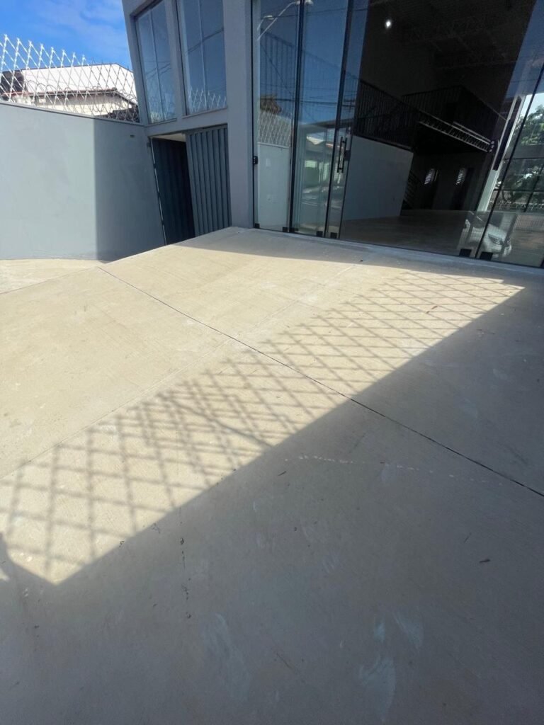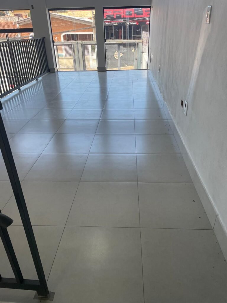 MEZANINO-: Parte do mezanino com  piso e rodapé revestido de porcelanato na cor cinza em ordem, outra parte de pisos em chapas de madeira com pintura na cor cinza em ordem, guarda-corpus com pintura na cor cinza em ordem, 02 janelas deslizantes em ordem, com 01 fechadura em cada em ordem, com 02 vidros liso, transparentes e temperados em ordem, paredes com pintura látex nova, na cor branco gelo em ordem, 09 espelhos de luz marca Tramontina em ordem, sendo eles: 01 espelho com 01 interruptor, 01 espelho com 01 interruptor e com 02 tomadas (110v/220v), 04 tomadas duplas (110v/220v) e 03 espelhos cegos em ordem. 03 para instalações de espelhos de luz, 01 tampa de inspeção de plástico em ordem, fizeram um quadro de distribuição de disjuntores com 02 tampas em ordem, marca Lexman, disjuntores marca Tramontina em ordem, 04 lâmpadas de led em ordem, telhado revestido de telhas galvanizadas com pintura na cor branco em ordem.