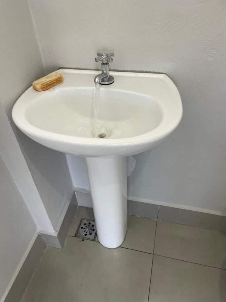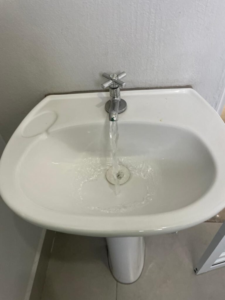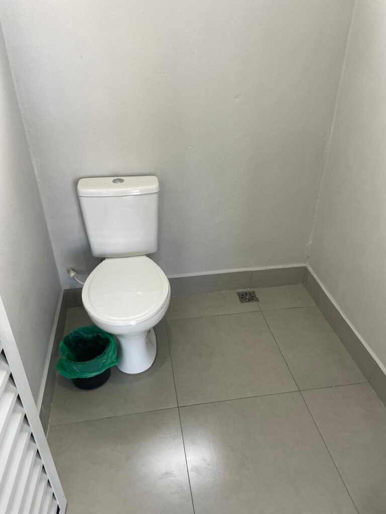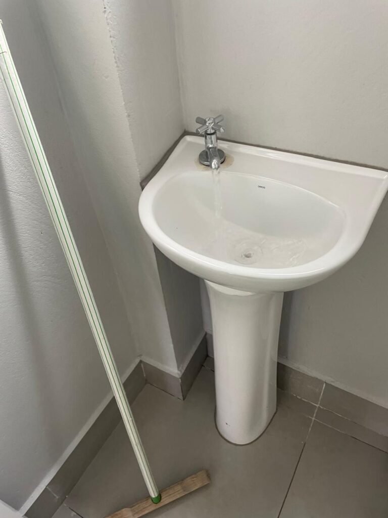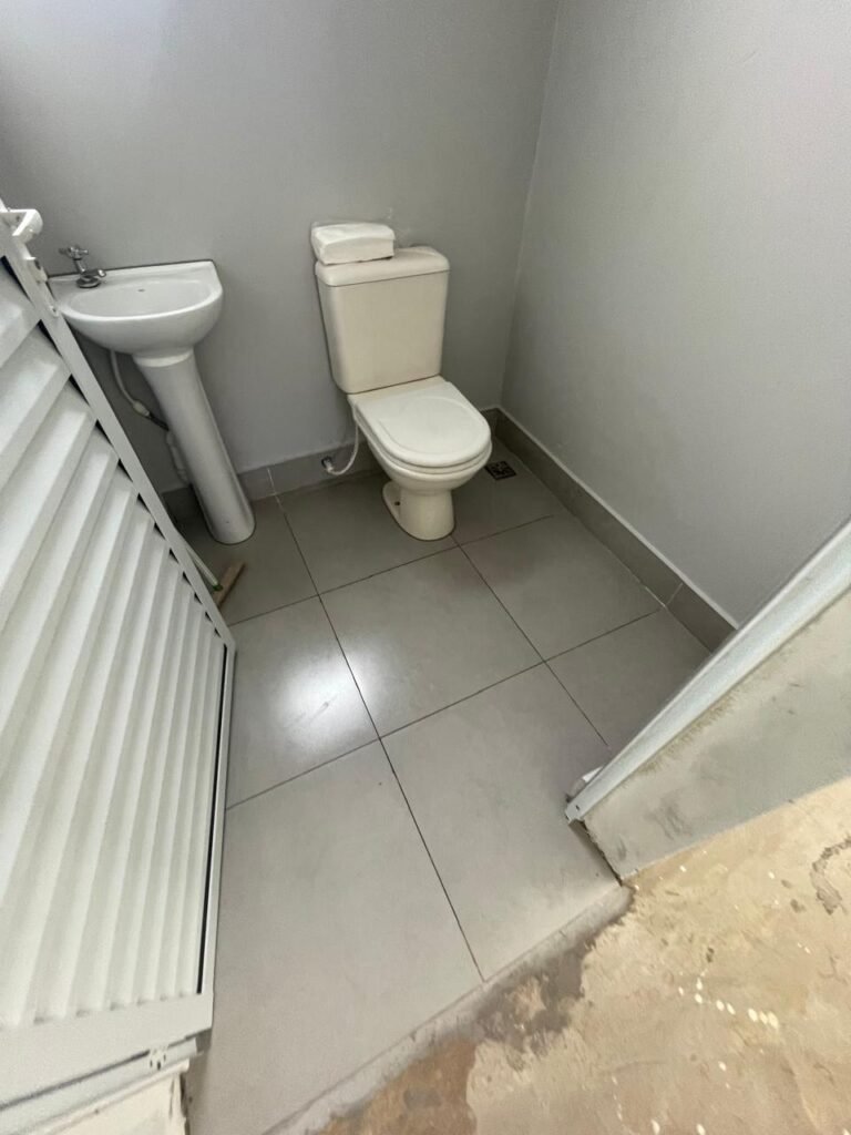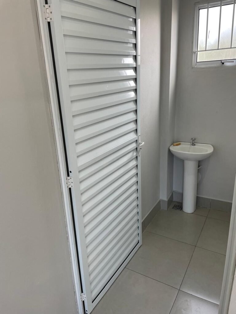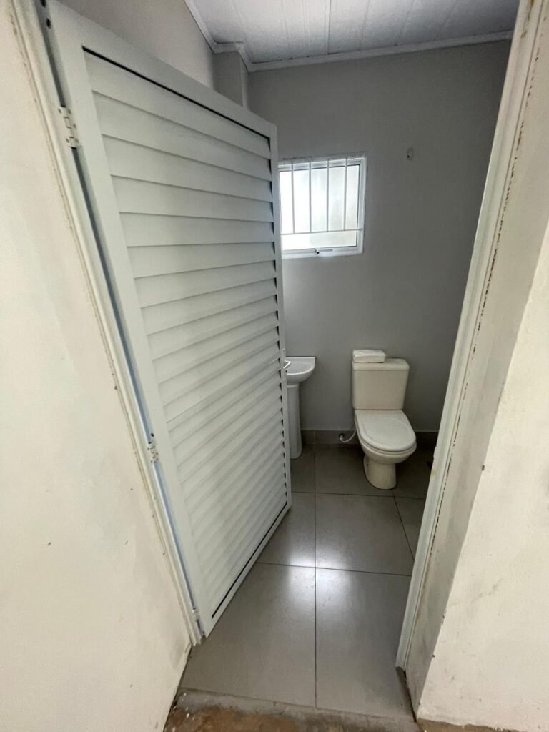 WC 01 SUBSOLO-: 01 Porta de alumínio nova, na cor branco em ordem, com maçanetas e fechadura marca Stam em ordem, piso e rodapé revestido de pisos de porcelanato na cor cinza em ordem, 01 ralo em inox em ordem, paredes com pintura látex nova, na cor cinza em ordem, 01 conjunto sanitário de cerâmica na cor branco em ordem, marca Icasa, com acento e tampa novo, marca Celite em ordem, válvula de descarga de plástico em ordem, descarga em ordem, conjunto lavatório de cerâmica na cor branco em ordem, marca Deca, 01 torneira em inox marca Cemar em ordem, 01 espelho de luz marca Tramontina em ordem, com 01 interruptor em ordem, 01 vitrô basculante em ordem, com 01 fechadura em ordem, com grade de ferro de proteção em ordem, 01 folha de acrílico com manchas de tinta e restante em ordem, 01 válvula de registro em ordem, teto com forro de dry wall, com manchas de tinta cinza e restante em ordem, 01 lâmpada LED em ordem.