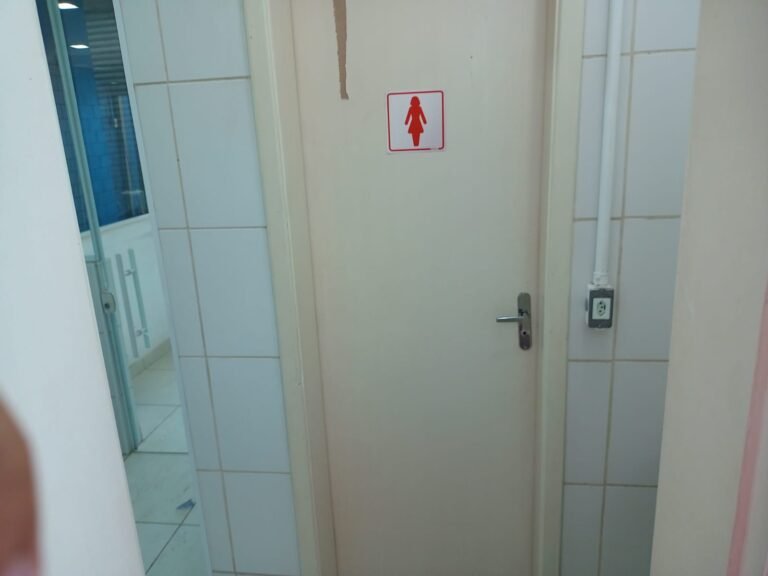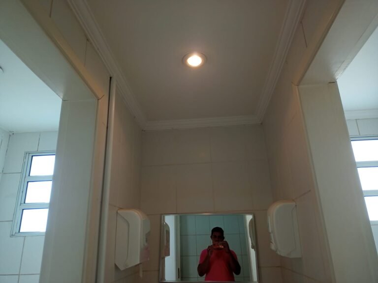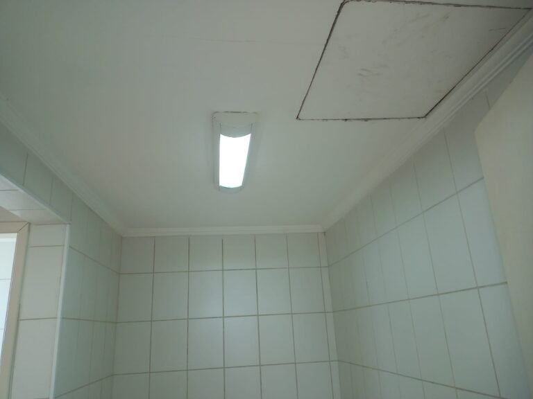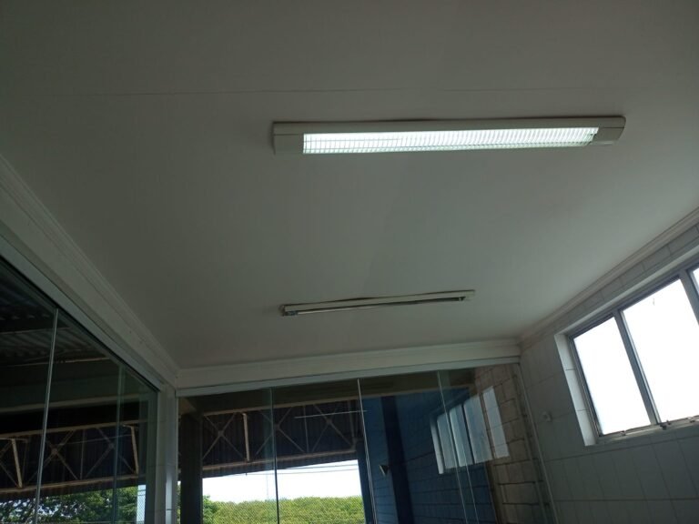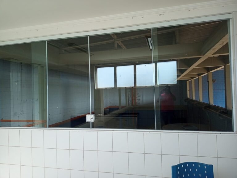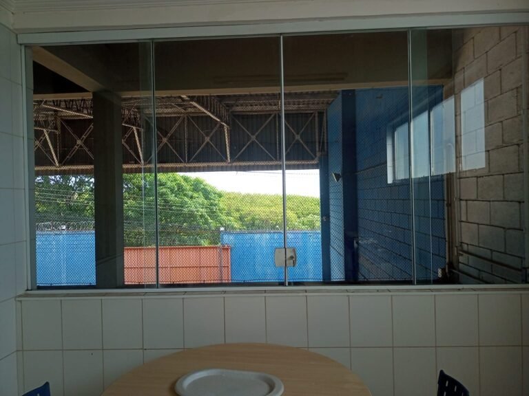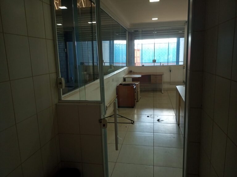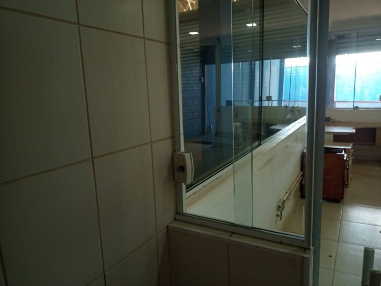 ESCRITÒRIO 02 MEZANINO:- 02 janelas de vidro temperado com 06 folha em ordem, 01 porta de vidro temperado em ordem com fechadura em ordem, paredes com revestimento de cerâmica na cor branca em ordem, 04 vitrôs basculante com 04 vidros em ordem, 06 tomadas com 06 espelhos, 01 interruptor 01 espelho, 01 luminária com 02 lâmpadas fluorescentes, 0 1 luminária sem lâmpada e restante em ordem, 01 ralo com tampa em ordem, pisos em ordem, escada com corrimão na cor laranja em ordem.