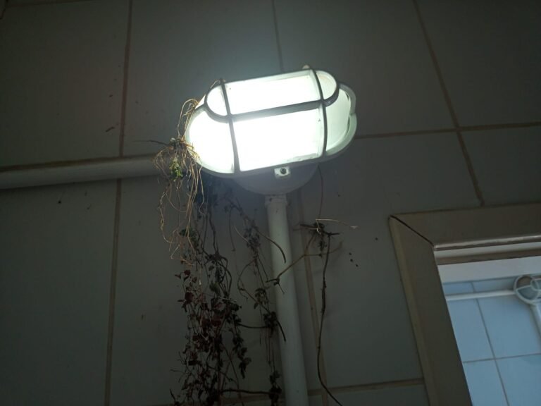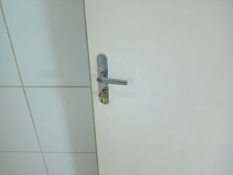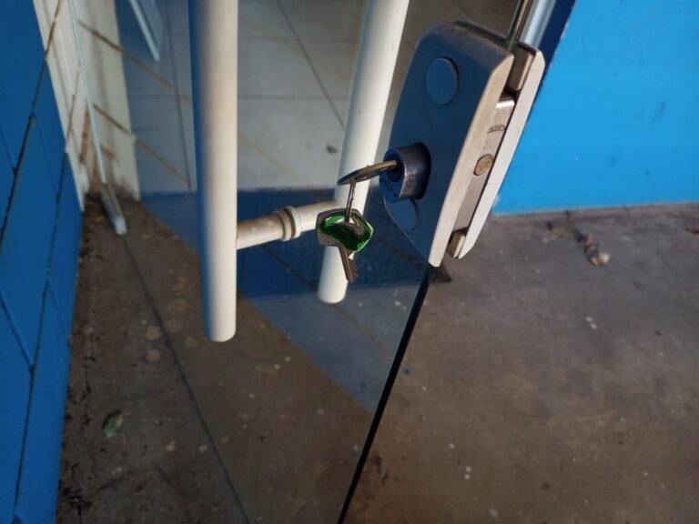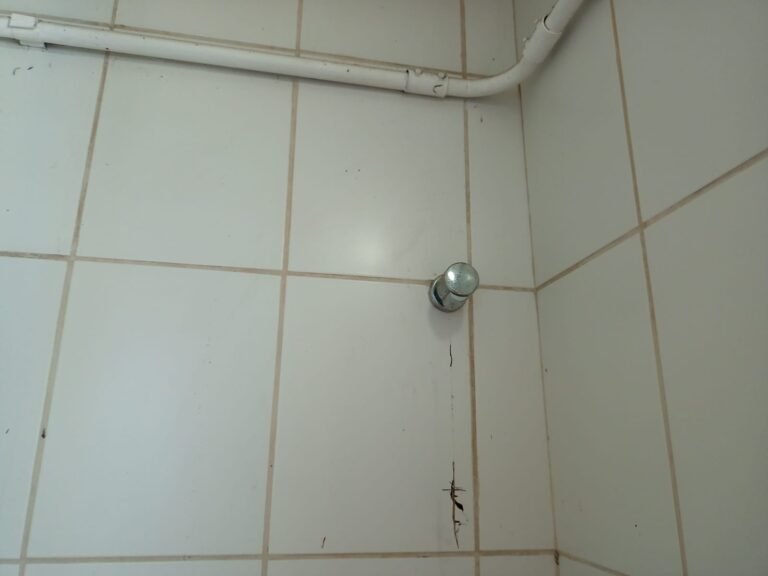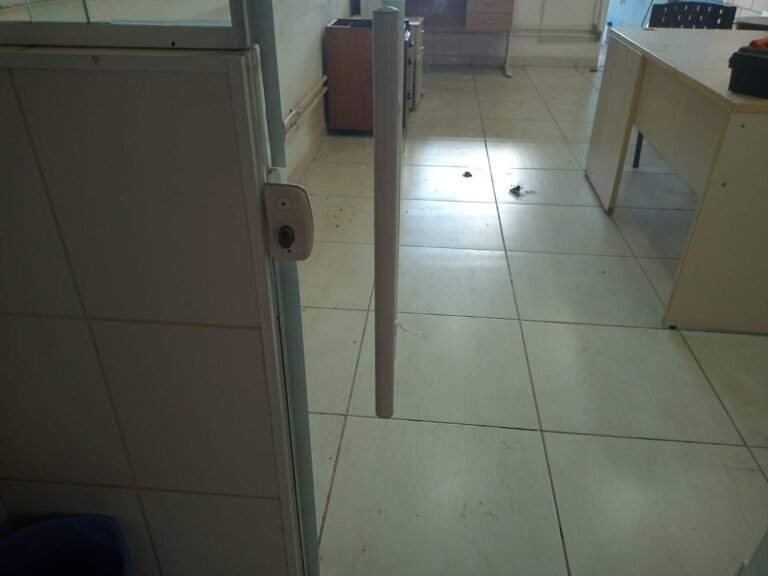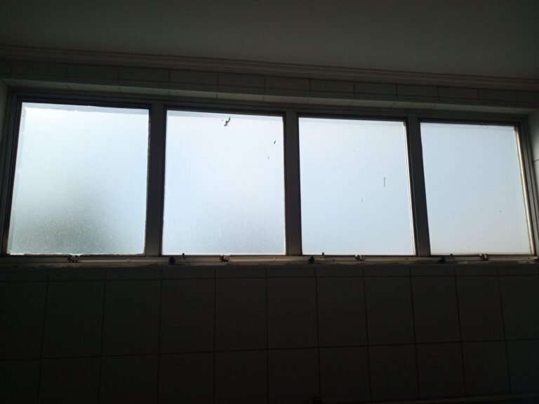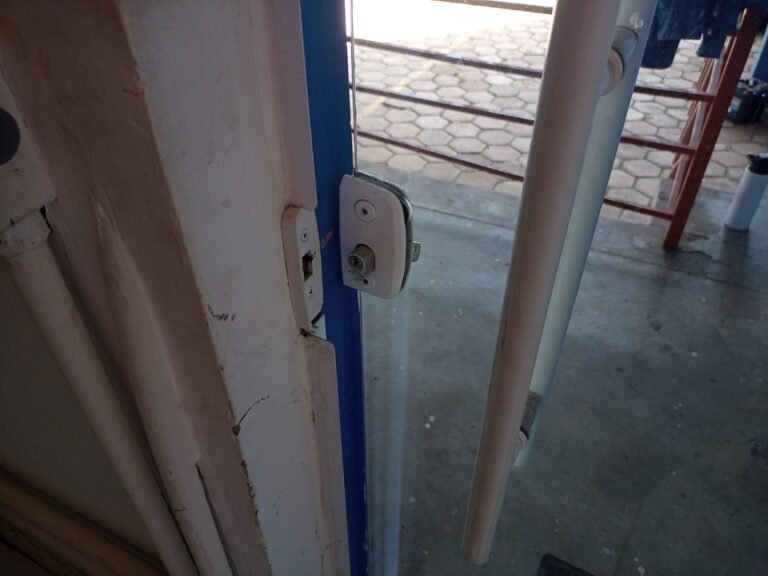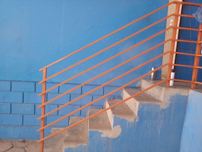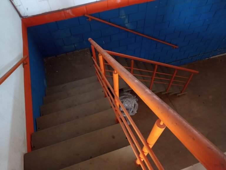 ESCRITÒRIO 02 MEZANINO:- 02 janelas de vidro temperado com 06 folha em ordem, 01 porta de vidro temperado em ordem com fechadura em ordem, paredes com revestimento de cerâmica na cor branca em ordem, 04 vitrôs basculante com 04 vidros em ordem, 06 tomadas com 06 espelhos, 01 interruptor 01 espelho, 01 luminária com 02 lâmpadas fluorescentes, 0 1 luminária sem lâmpada e restante em ordem, 01 ralo com tampa em ordem, pisos em ordem, escada com corrimão na cor laranja em ordem.