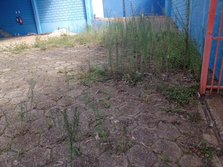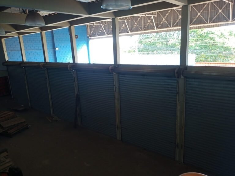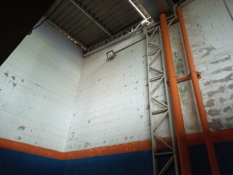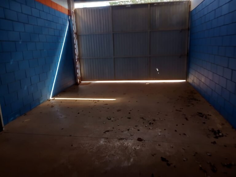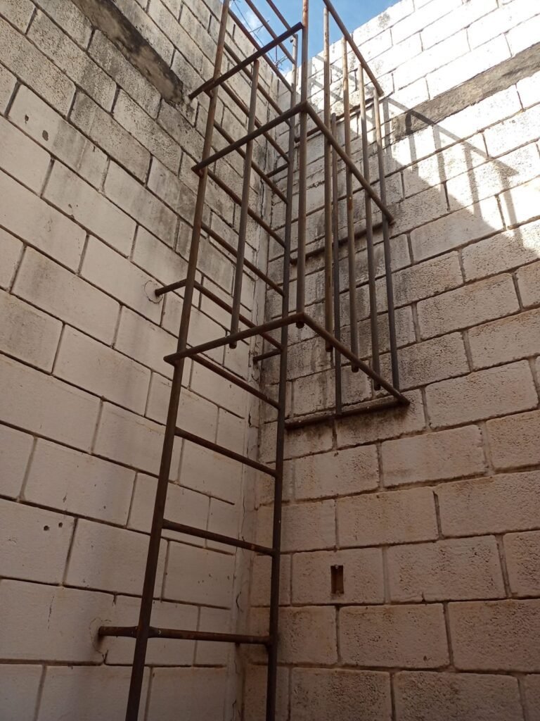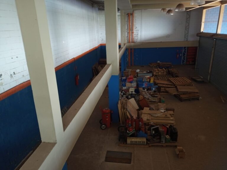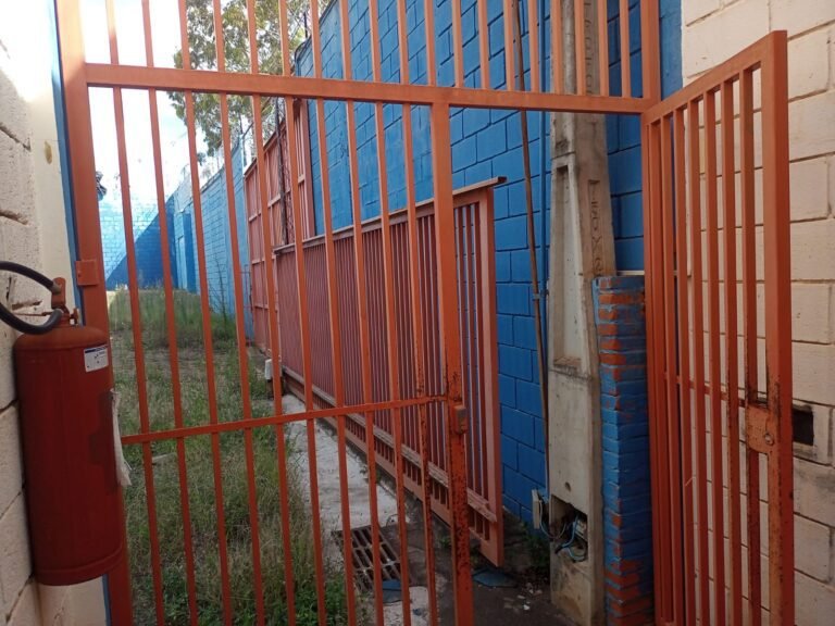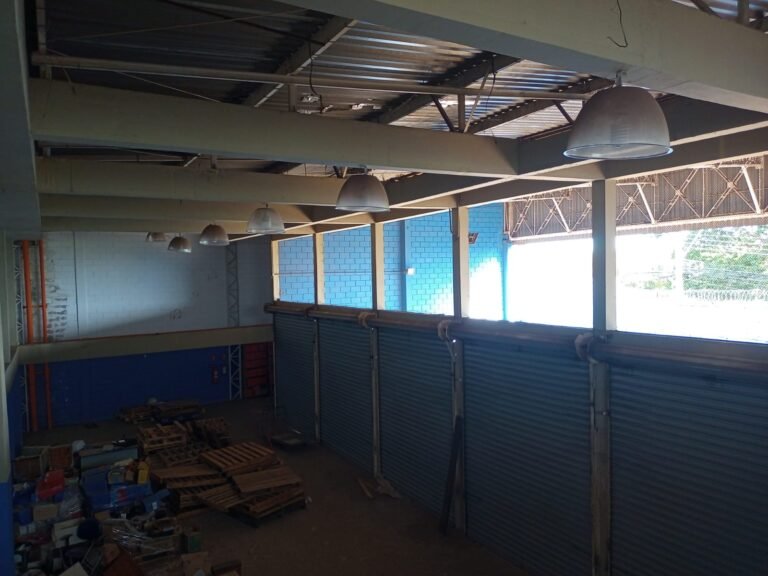 BARRACÃO:- Partes do telhado com telhas de ferro e outras partes de telha Brasilit em ordem, 7 luminárias prismática e 07 lâmpadas em ordem, piso industrial com marcas de uso e restante em ordem, paredes de bloco à vista com marcas de infiltração pintadas cor azul e branco, estruturas metálicas nas paredes em ordem, canos PVC de água da calha em ordem, calhas em ordem ,01 torneira cano3/4 em ordem, 06 extintores vencido restante em ordem, 02 ralos de águas fluviais em ordem, 01 portão de chapa de aço em ordem, estrutura de chapa de aço elevada em ordem.