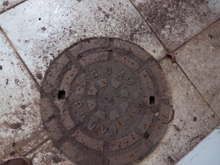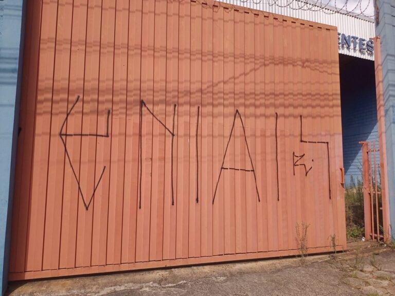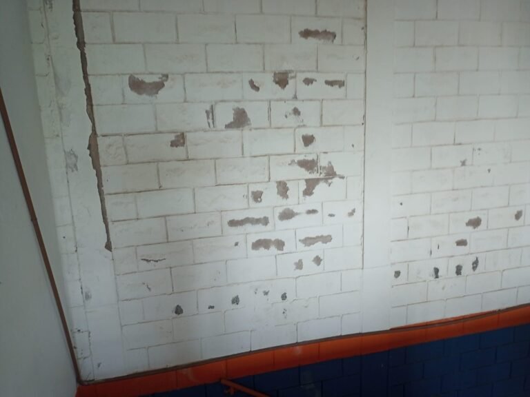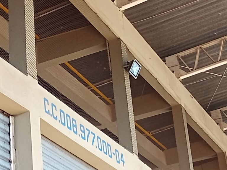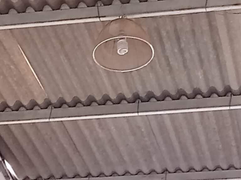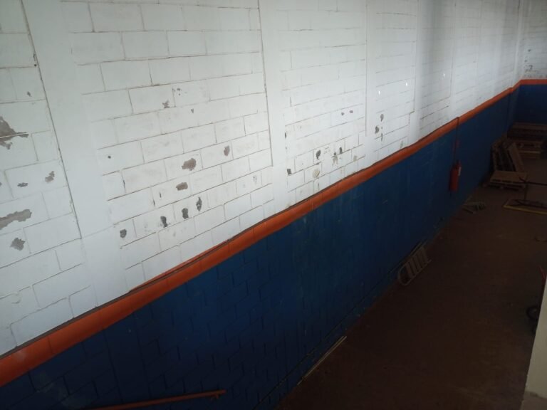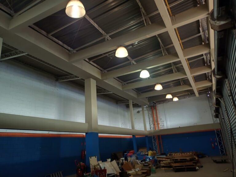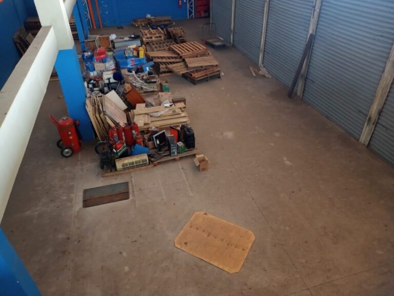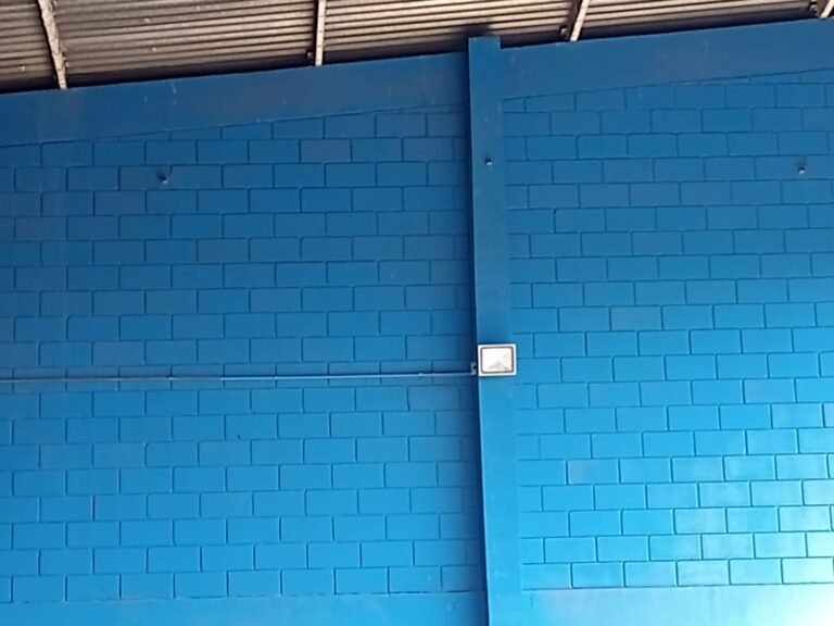 BARRACÃO:- Partes do telhado com telhas de ferro e outras partes de telha Brasilit em ordem, 7 luminárias prismática e 07 lâmpadas em ordem, piso industrial com marcas de uso e restante em ordem, paredes de bloco à vista com marcas de infiltração pintadas cor azul e branco, estruturas metálicas nas paredes em ordem, canos PVC de água da calha em ordem, calhas em ordem ,01 torneira cano3/4 em ordem, 06 extintores vencido restante em ordem, 02 ralos de águas fluviais em ordem, 01 portão de chapa de aço em ordem, estrutura de chapa de aço elevada em ordem.