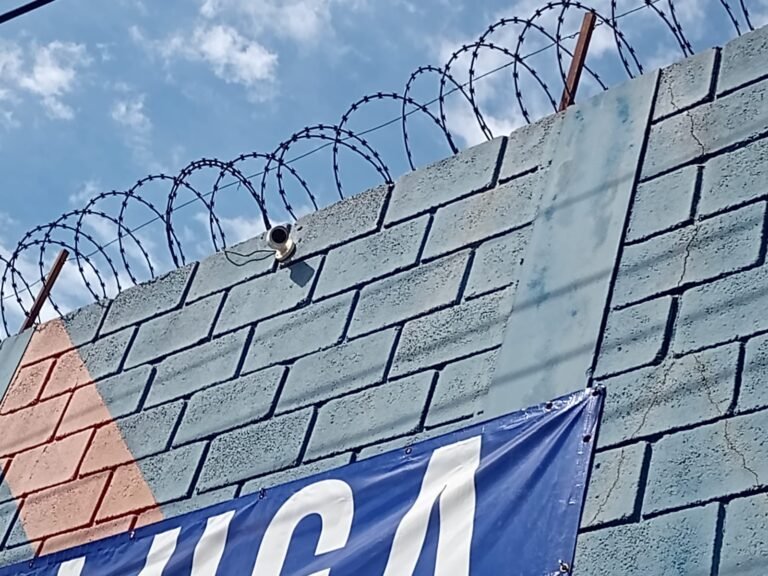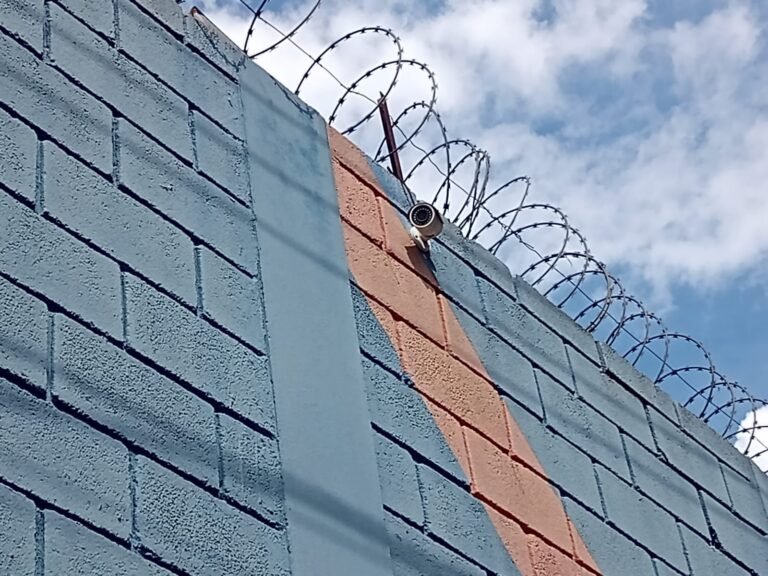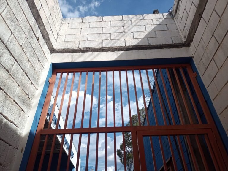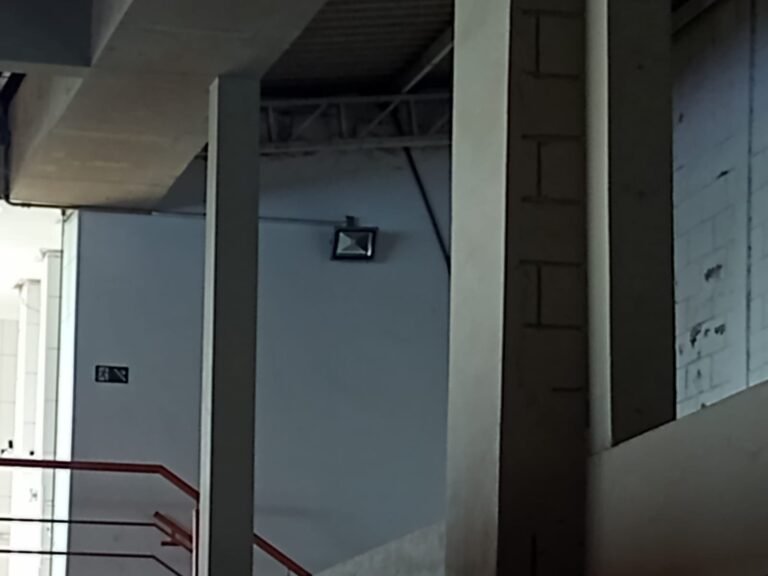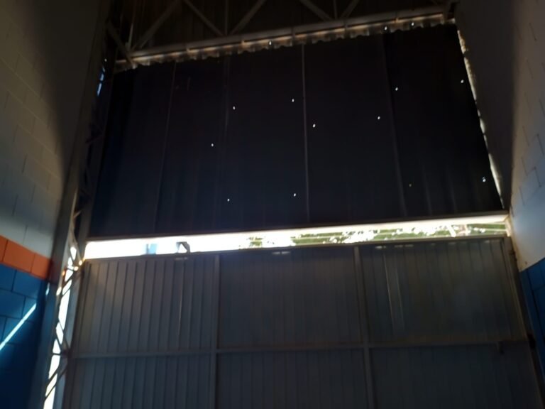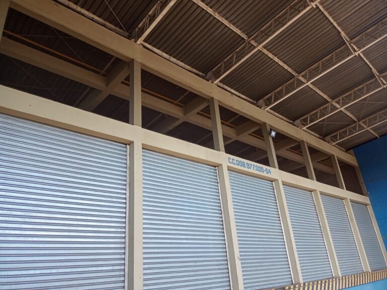 HALL DE ENTRADA SOCIAL:- Telhas de aço industrial em ordem, estrutura metálica de aço na cor branca em ordem, 06 telas de proteção em ordem, 03 refletores em ordem, 03 câmeras aparentemente em ordem, paredes do pátio com blocos à vista com pintura na cor azul com marcas de desgastes e restante em ordem, 01 corrimão de escada com pintura na cor laranja em ordem, 07 portas de aço de enrolar em ordem.