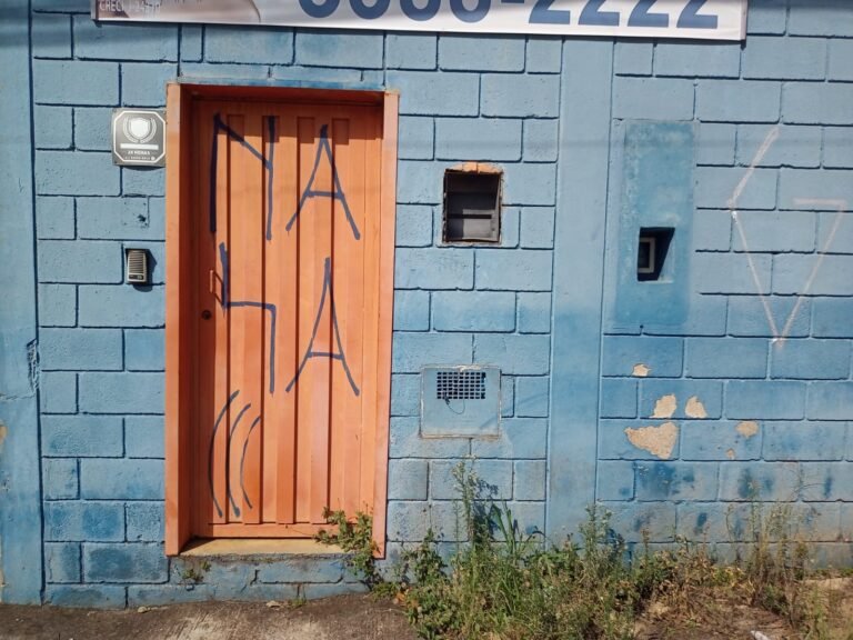 FACHADA:- Calçada com pisos intertravados e outras partes de concreto desempenado, restante com matos para aparar e restante em ordem, muro de blocos à vista com pintura na cor azul e ordem, cercas elétricas em ordem, 02 câmeras com numeração, 02 refletores virados para dentro em ordem, 01 campainha HDL, 01 Caixa da SANASA em ordem, relógio de energia ltron em ordem, portão de correr de chapa de aço com 5 m de altura por 7 m de largura com pintura na cor laranja com pichação em ordem e portão de entrada social padrão chapa de aço com pintura na cor laranja com pichação em fechadura HDL em ordem.