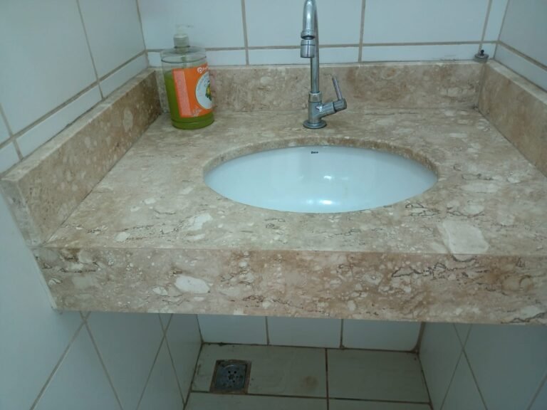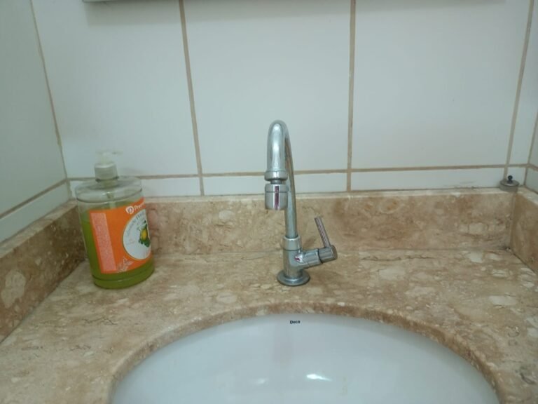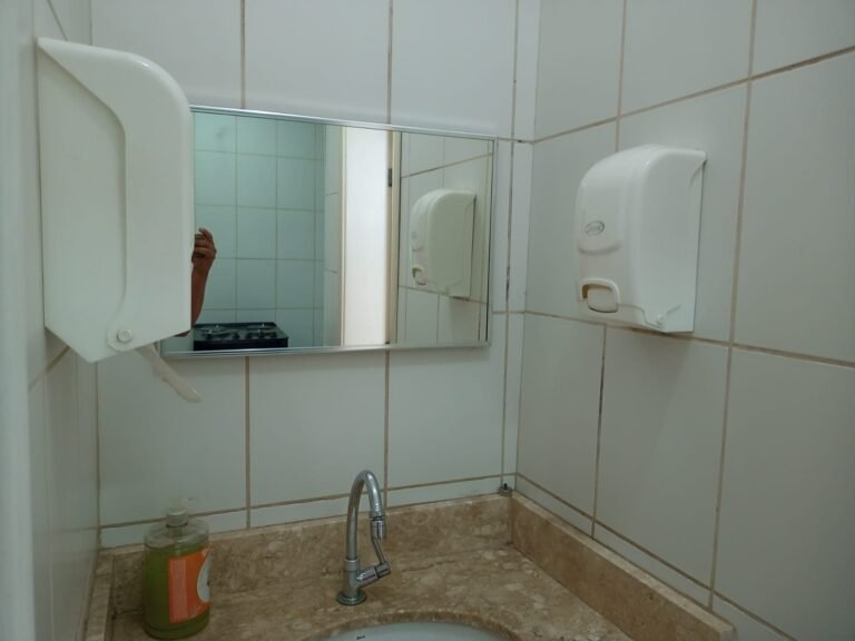 COPA 02:- Pia de granito com cuba Deca, torneira cromada em ordem, espelho de parede em ordem, 01 porta toalha de papel em ordem, porta sabonete líquido em ordem, lâmpada do teto em ordem, 01 tomada em ordem, 01 ralo com tampa em ordem, paredes revestidas de cerâmica na cor branca em ordem.