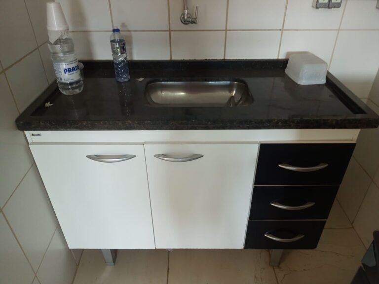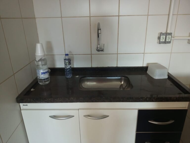 COPA 01:- Paredes com azulejo na cor branca em ordem, luminária com lâmpada fluorescente em ordem, torneiras cromada em ordem, 03 tomadas com 03 espelho de tomada em ordem, 01 ralo em ordem, 02 interruptores de luz em ordem, pisos cerâmica na cor bege em ordem, gabinete de pia MDF padrão com cuba inox pia de granito em ordem, com 02 porta com puxadores 03 gavetas com puxadores em ordem.