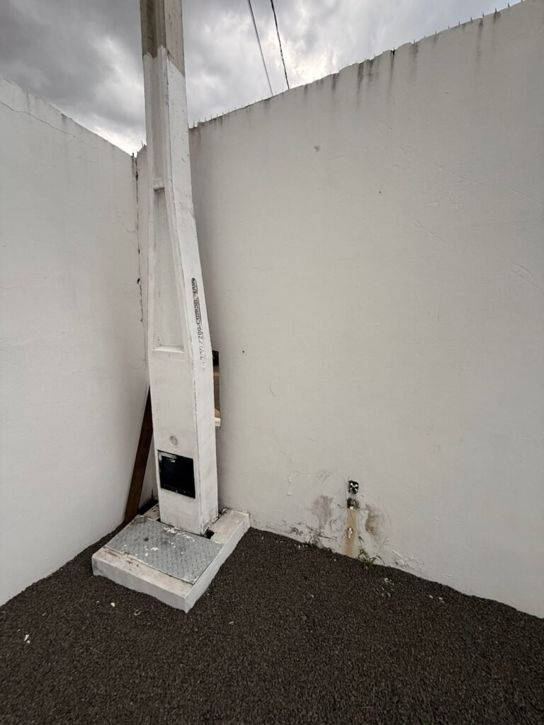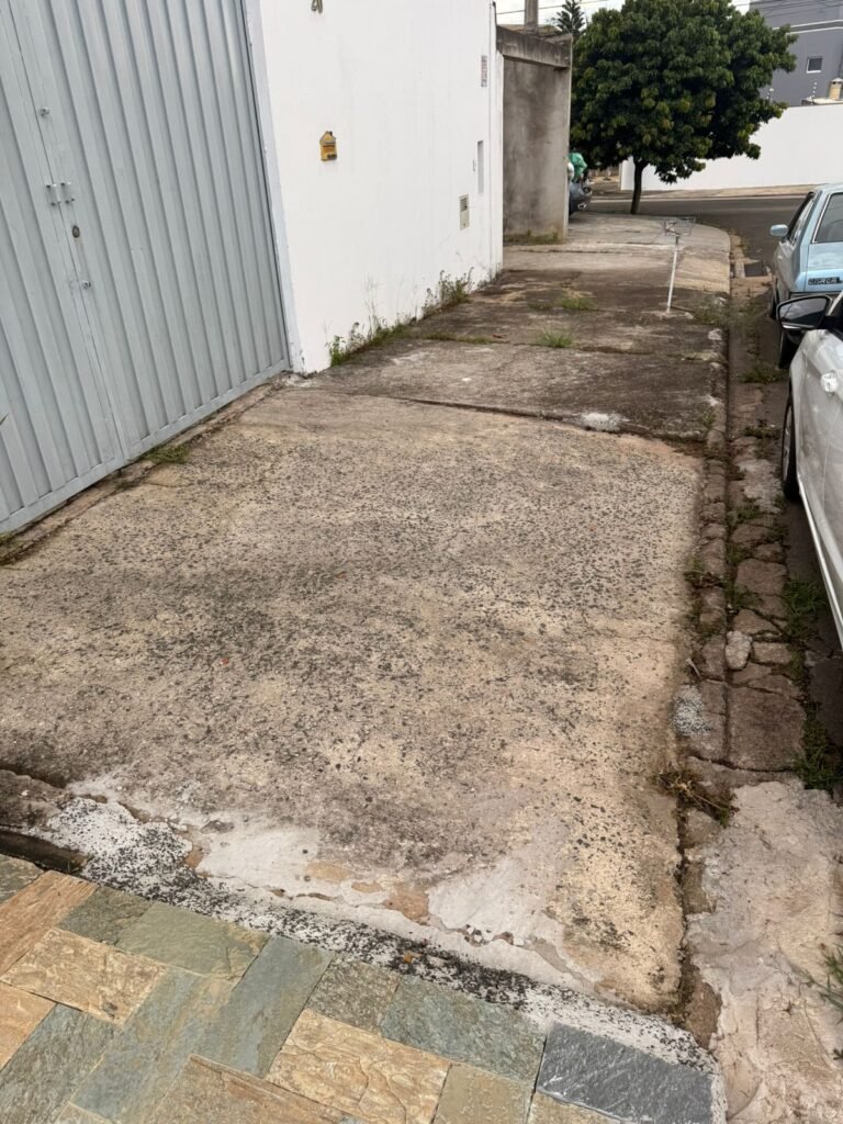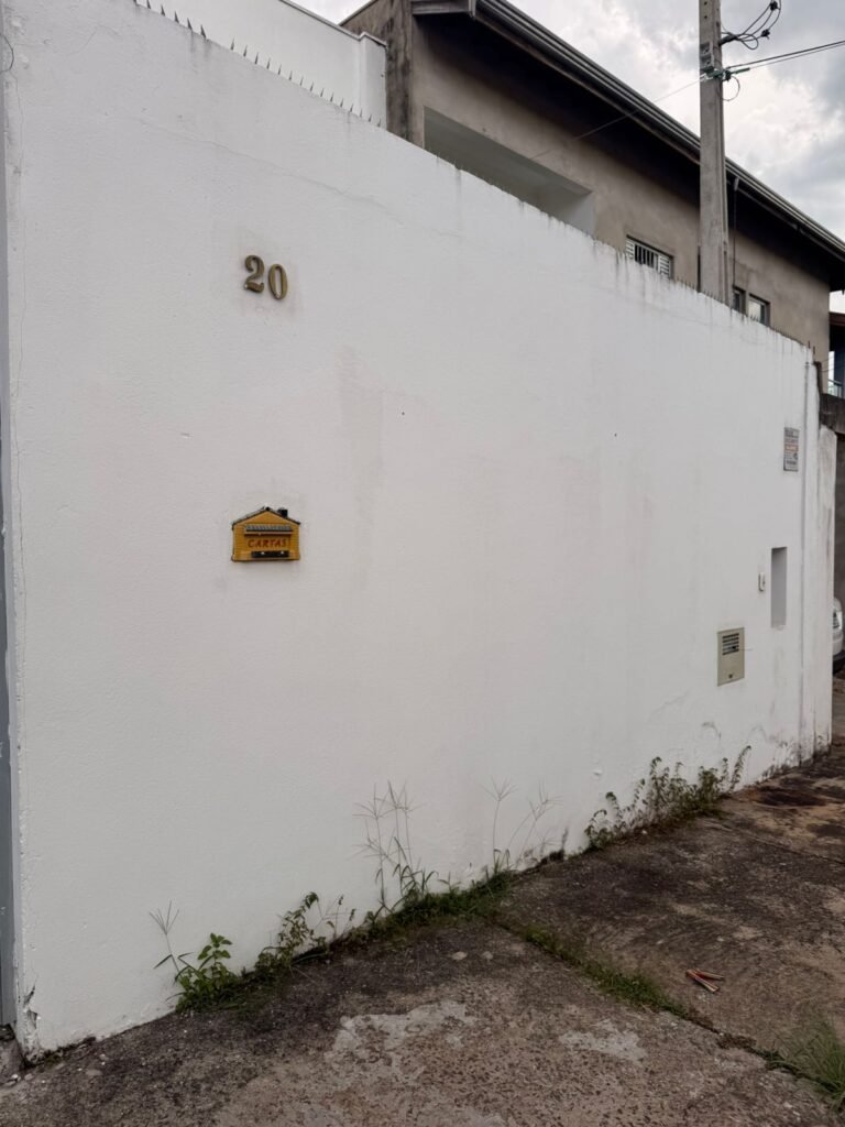 FACHADA-: Calçada de concreto desempenado com desgaste natural e restante em ordem, 01 lixeira de ferro em ordem, parede com pintura nova na cor branco em ordem, 01 tampa com lacre da Sanasa em ordem, 01 hidrômetro em ordem, 01 poste padrão Concremar, com tampa e medidor elétrico em ordem, 01 espelho de luz com 01 interruptor de campainha em ordem, 01 caixa de correspondência embutida na cor amarelo em ordem, digito em dourado “2-0”, lanças de proteção encima do muro e do portão em ordem, 01 portão de ferro com pintura nova na cor cinza em ordem, com 01 fechadura de chão em ordem, com 01 fechadura Start em ordem e com chave, 04 puxadores em ordem, 02 trincos com 02 cadeados marca Papaiz em ordem.