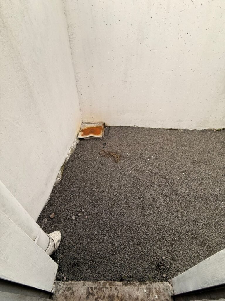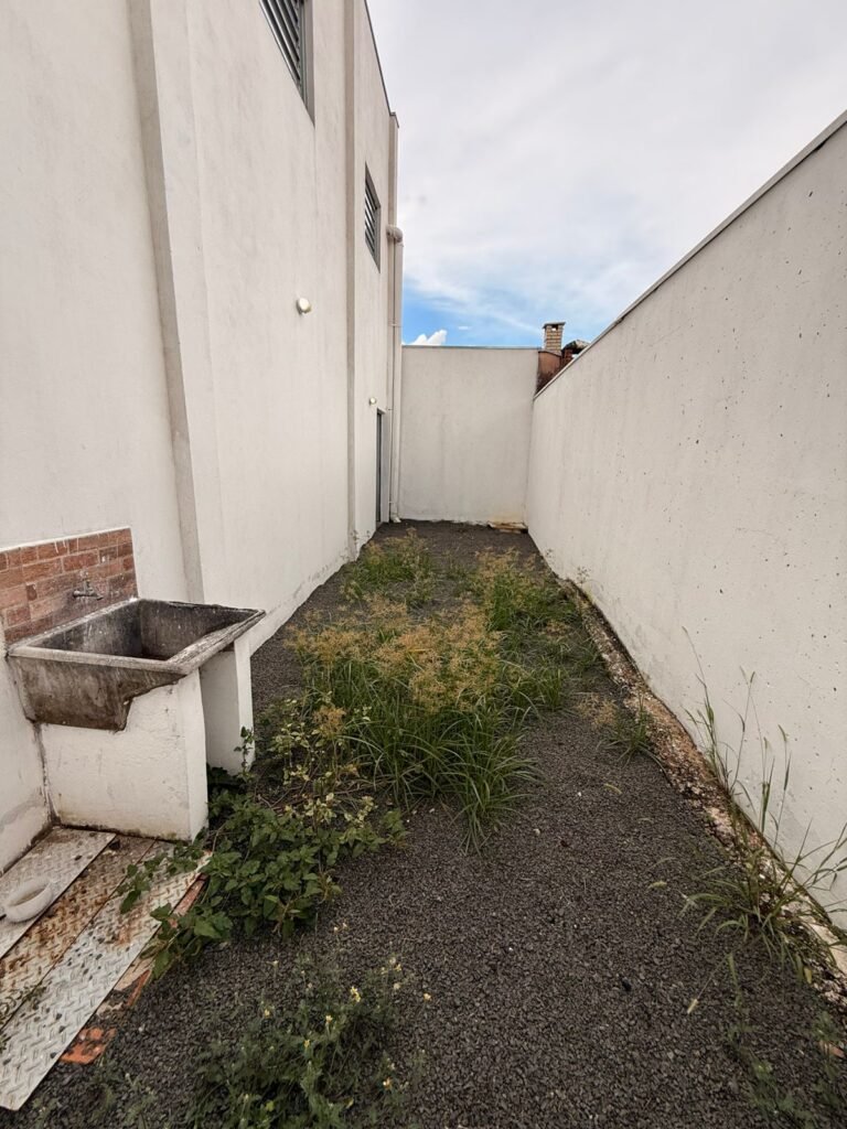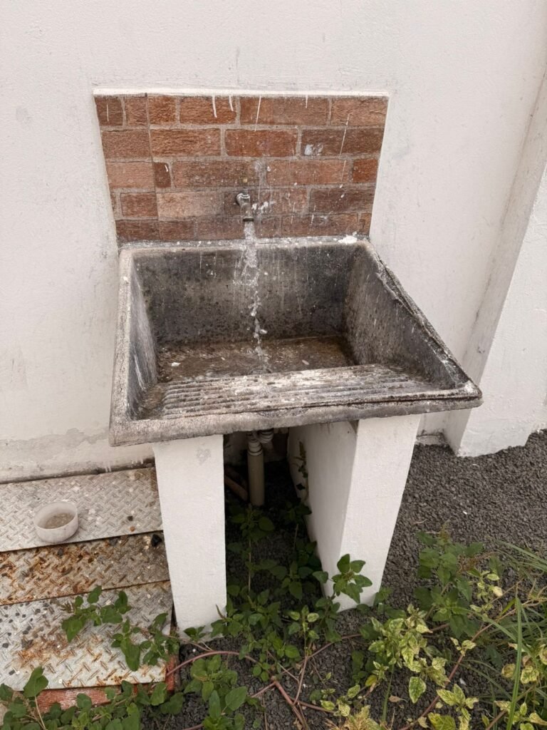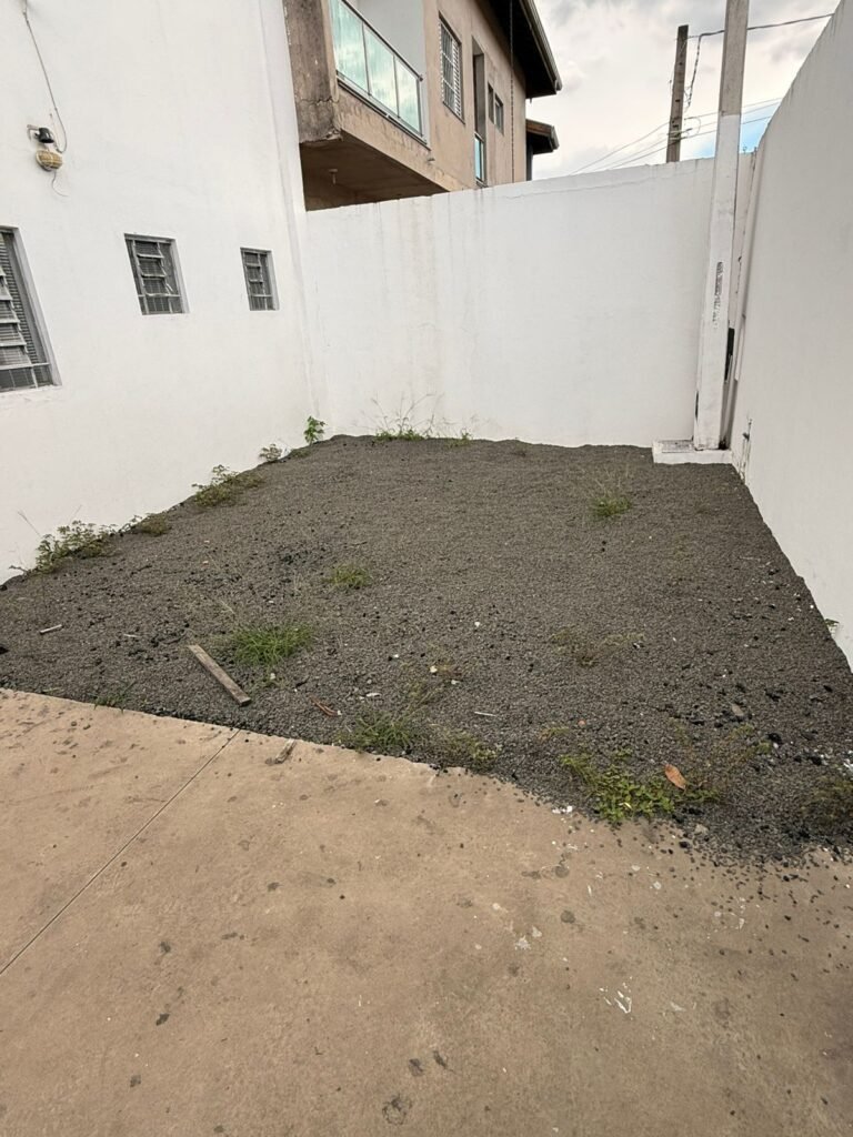 FUNDOS-: piso de pedregulhos, 03 tampas de inspeção, paredes com pintura na cor branco (do barracão está em ordem), 01 tanque de concreto, com 01 torneira de Jardim em ordem e 01 sifão sanfonado em ordem, 02 luminárias tartaruga apenas 01 em ordem.