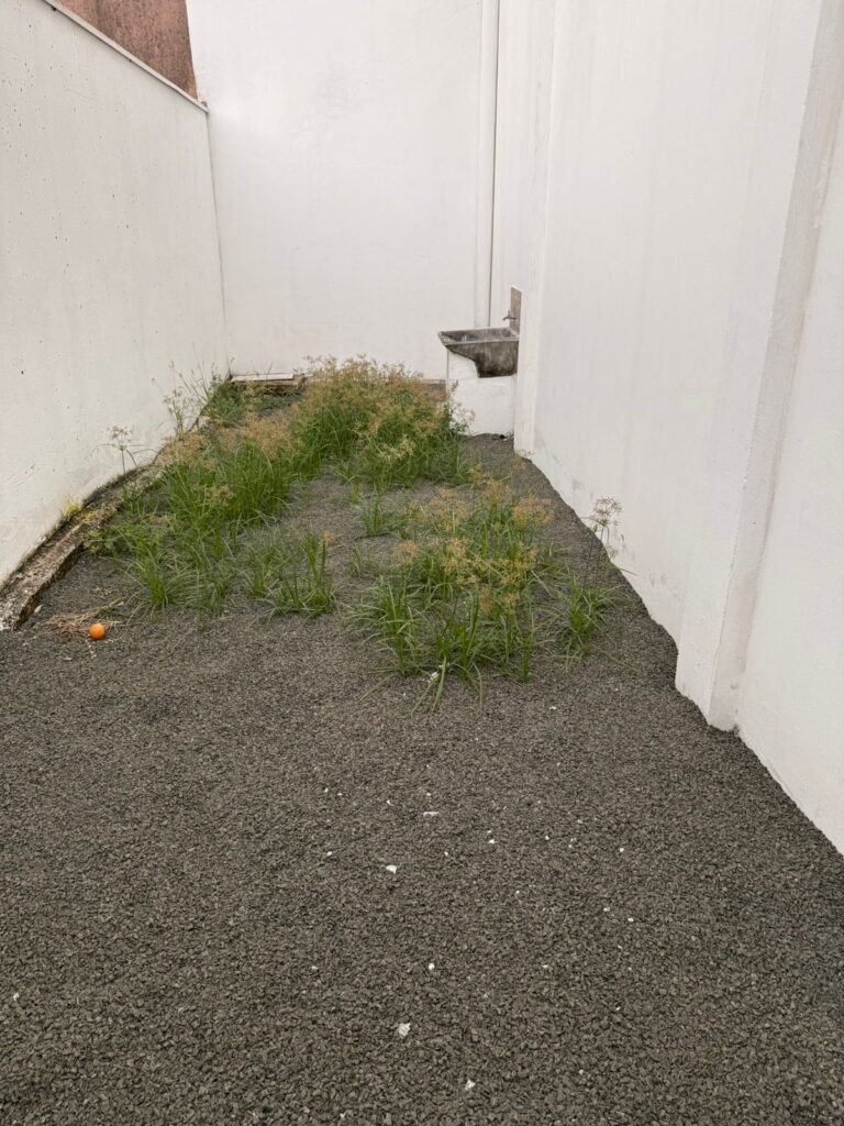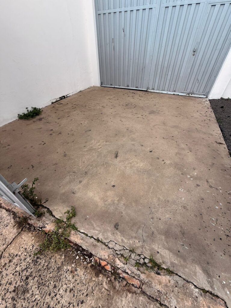 GARAGEM-: Parte do piso de concreto usinado com manchas pela extensão, pedaços de carvão misturado nos pedriscos, pintura com desgaste naturais e restante em ordem, 01 torneira de Jardim na cor preto em ordem, 01 canopla de registro em inox em ordem, 01 sirene, lâmpada de fora está piscando.