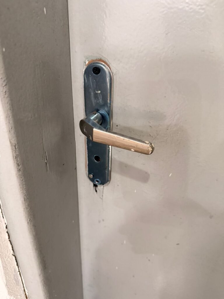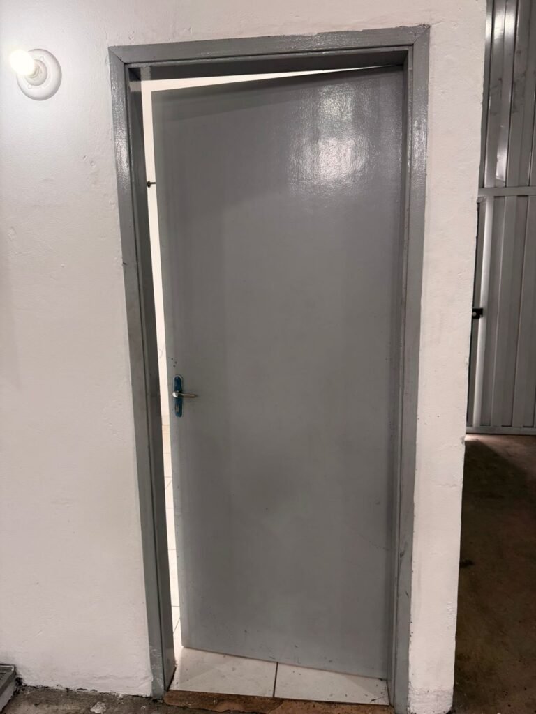 SALA -: 01 porta de madeira nova, com pintura nova na cor cinza em ordem, com maçaneta em inox em ordem e fechadura marca Silvana em ordem, piso e rodapés revestidos de pisos frio cerâmico em ordem, paredes e teto com pintura nova na cor branco neve, com alguns descasques e restante em ordem, 06 espelhos de luz em ordem sendo eles: 01 interruptor e 06 tomadas em ordem. 01 vitrô basculante com esquadrias de ferro com pintura na cor cinza em ordem, com fechadura em ordem, com 11 vidros canelados com algumas manchas de tinta e restante em ordem, 01 grade de ferro grelha de proteção e pintura na cor cinza, 01 lâmpada de led em ordem.
