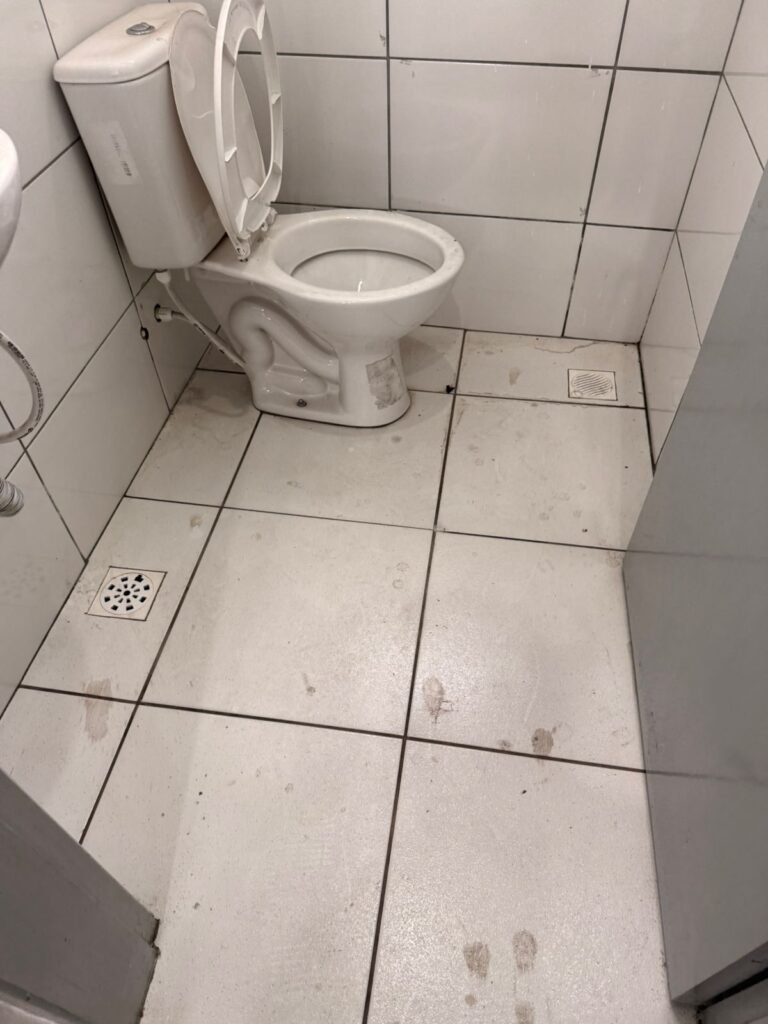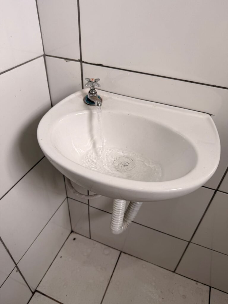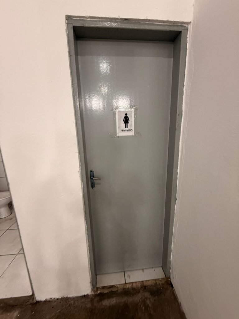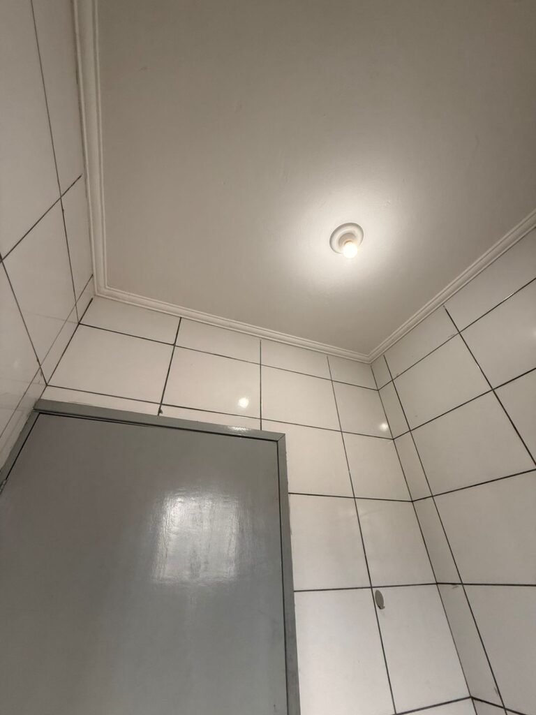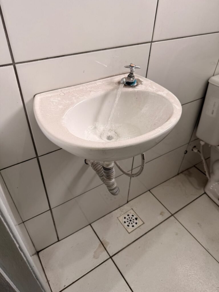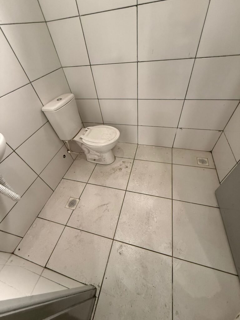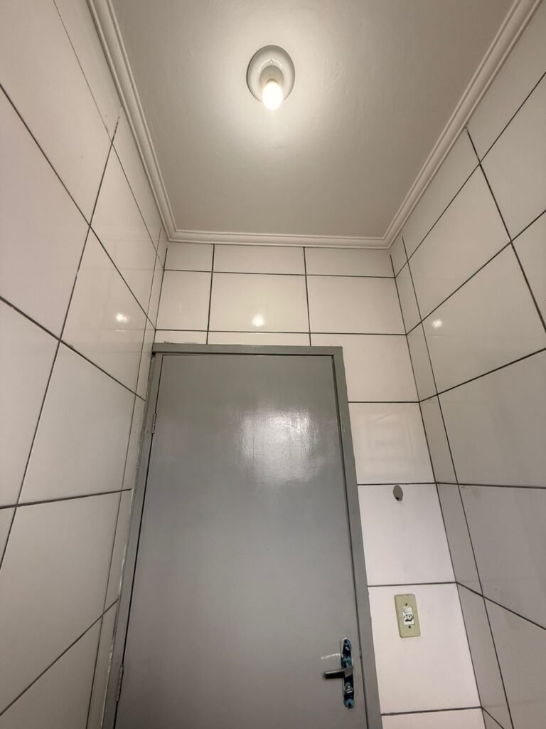 W.C 01-: 01 porta de madeira nova, com pintura nova na cor cinza em ordem, com maçaneta em inox em ordem e com fechadura com chave embutida em ordem, piso revestido de piso frio cerâmico em ordem, 02 ralos de plástico cor branco em ordem, paredes revestidas de azulejo cor branco em ordem, 01 espelho de luz com 01 interruptor e 01 tomada em ordem, 01 pia de cerâmica com branco em ordem, com 01 torneira de inox marca Coiex em ordem e com 01 sifão sanfonado vazando, 01 conjunto sanitário de cerâmica marca Deca em ordem, com tampa e acento em ordem, com descarga e válvula em ordem, 01 canopla de inox em ordem, 01 prè instalação de chuveiro em ordem, 01 vitrô basculante com esquadrias de ferro com pintura na cor cinza em ordem, com maçaneta em ordem, com 08 vidros canelados em ordem e com grade de ferro de proteção em ordem, teto com gola de gesso e pintura na cor branco neve em ordem, 01 bocal com 01 lâmpada led em ordem.