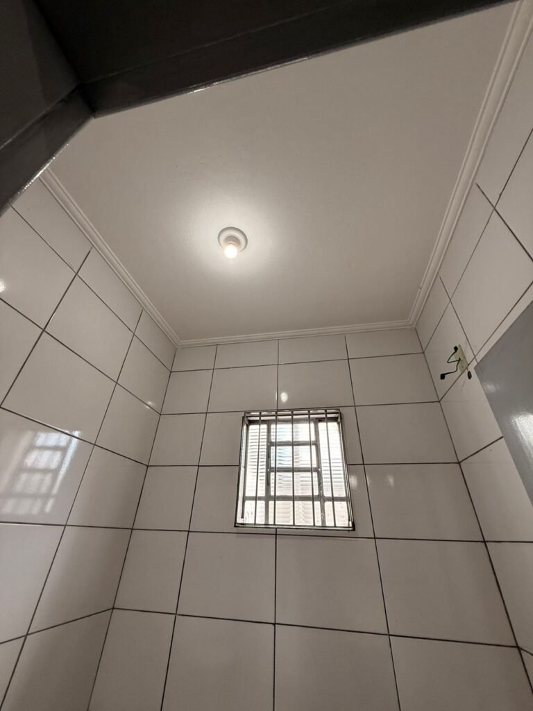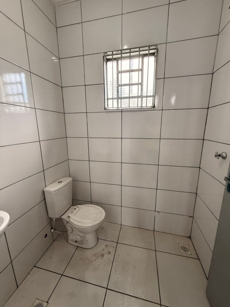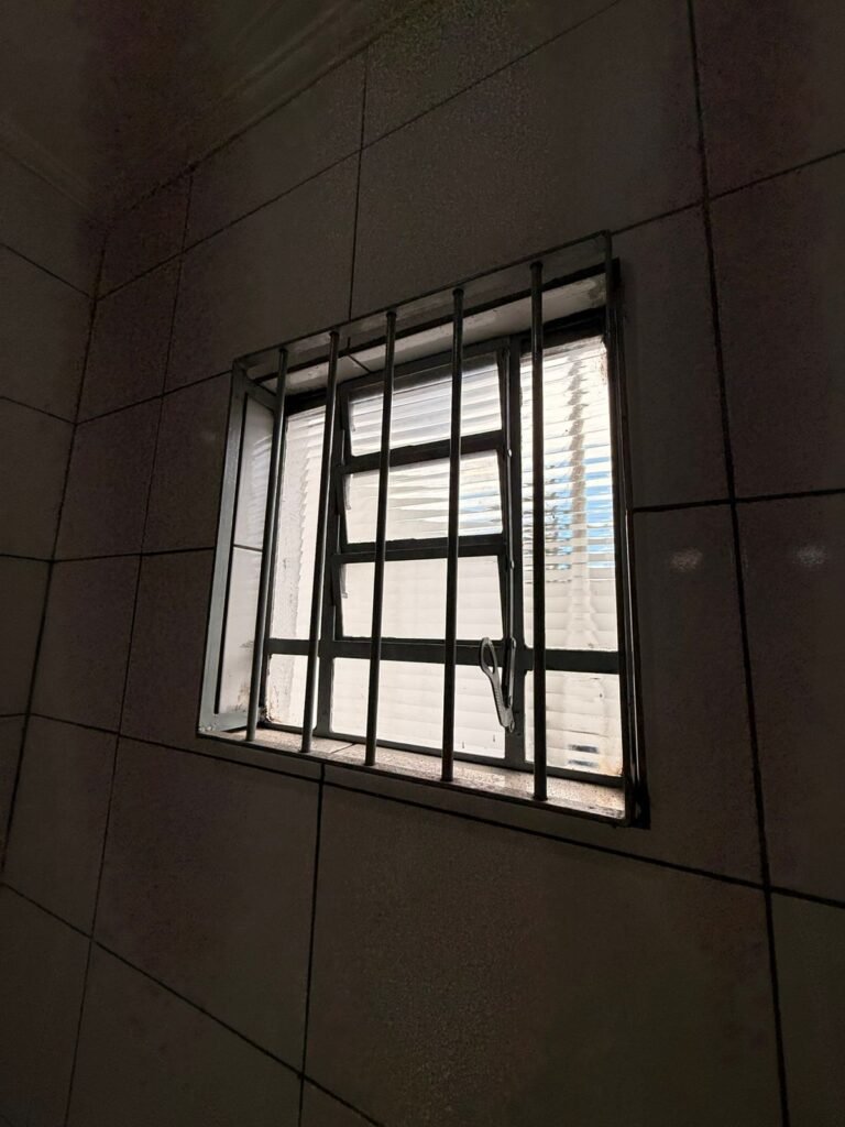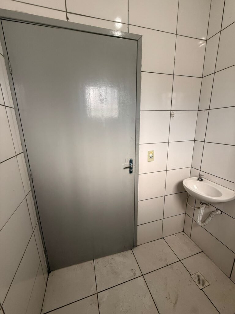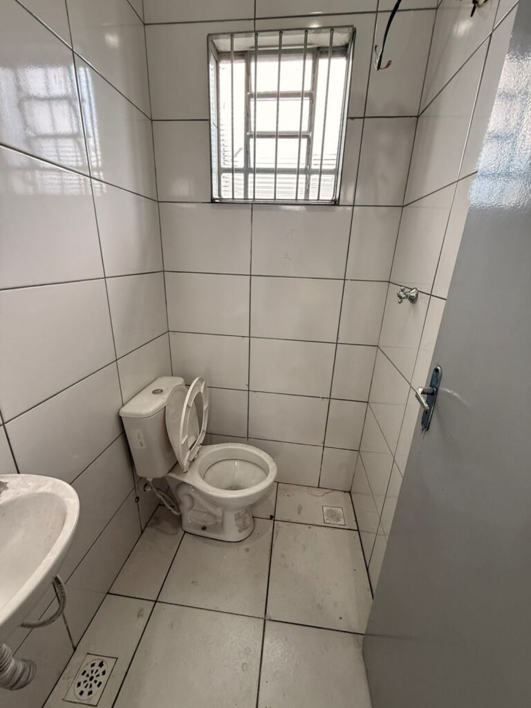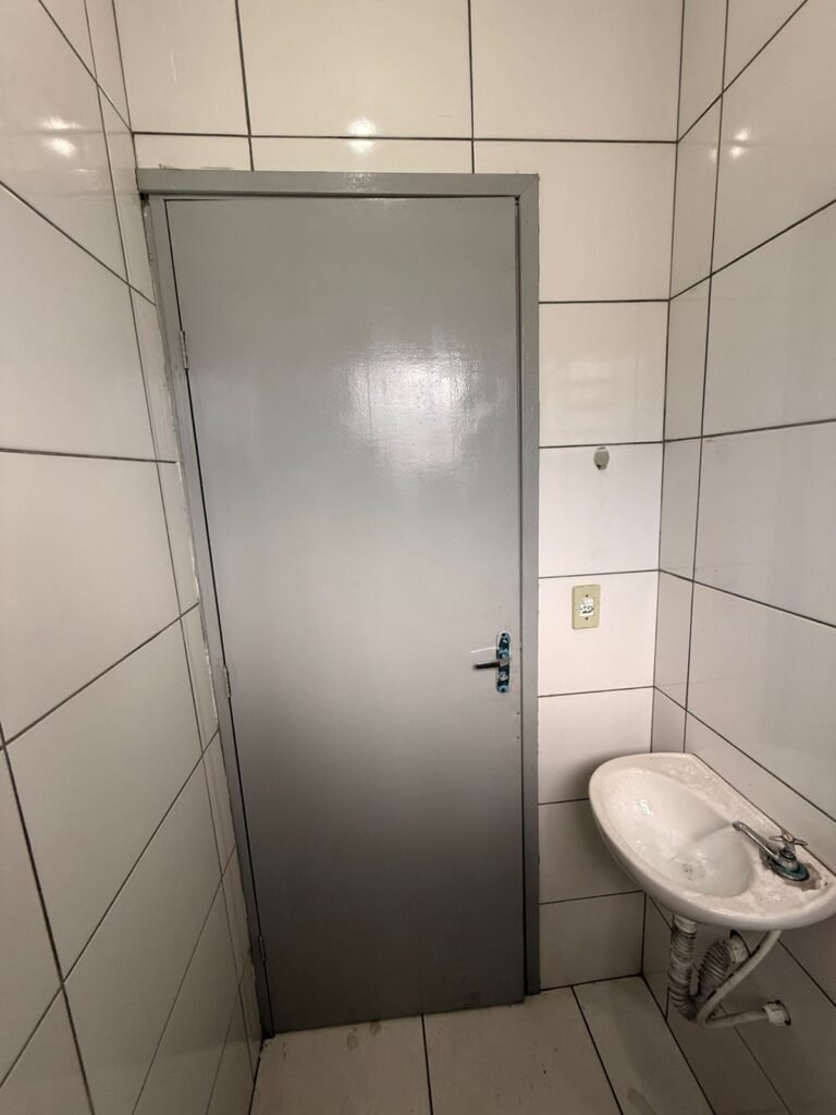 W.C 02-: 01 porta de madeira nova, com pintura nova na cor cinza em ordem, com maçaneta em inox em ordem e com fechadura com chave embutida em ordem, piso revestido de piso frio cerâmico em ordem, 02 ralos de plástico cor branco em ordem, paredes revestidas de azulejo cor branco em ordem, 01 espelho de luz com 01 interruptor e 01 tomada em ordem, 01 pia de cerâmica com branco em ordem, com 01 torneira de inox marca Coiex em ordem e com 01 sifão sanfonado vazando, 01 conjunto sanitário de cerâmica marca Deca em ordem, com tampa e acento em ordem, com descarga e válvula em ordem, 01 canopla de inox em ordem, 01 prè instalação de chuveiro em ordem, 01 vitrô basculante com esquadrias de ferro com pintura na cor cinza em ordem, com maçaneta em ordem, com 08 vidros canelados em ordem e com grade de ferro de proteção em ordem, teto com gola de gesso e pintura na cor branco neve em ordem, 01 bocal com 01 lâmpada led em ordem.