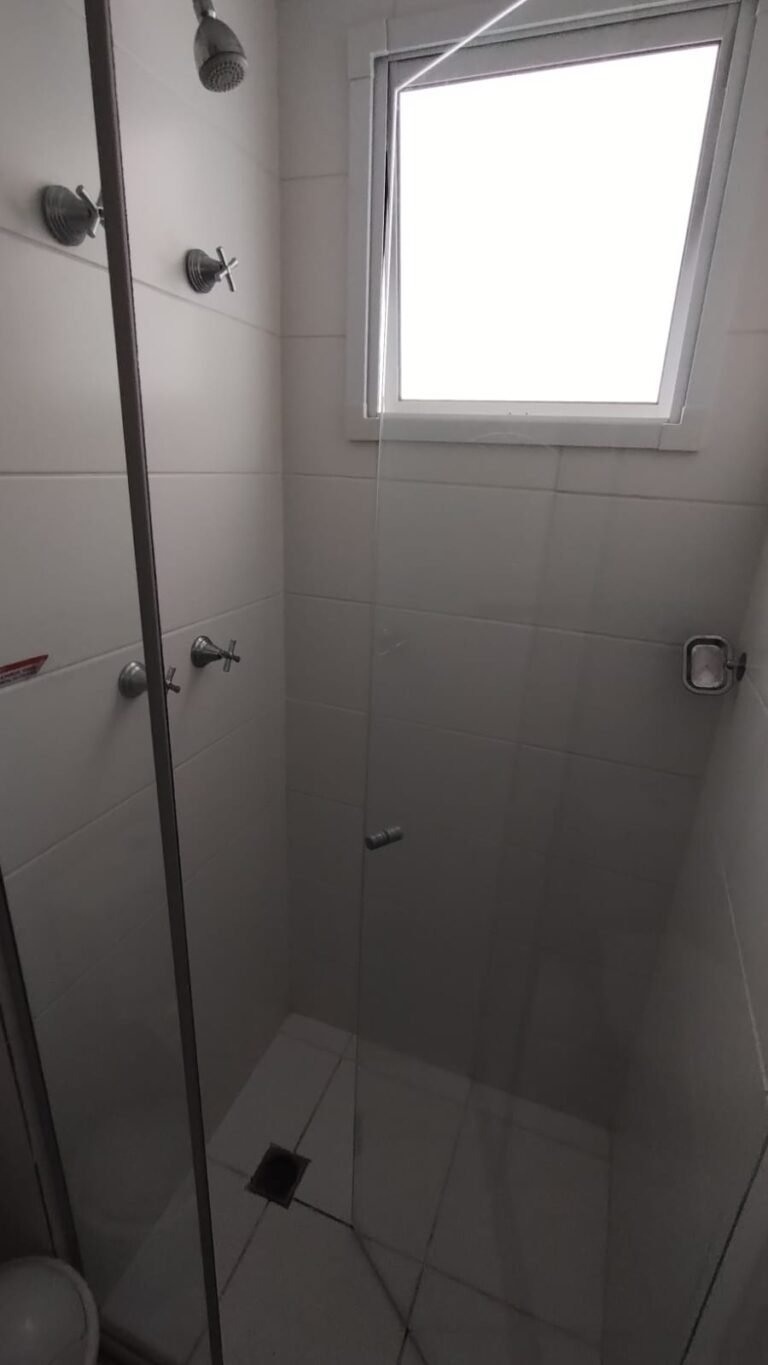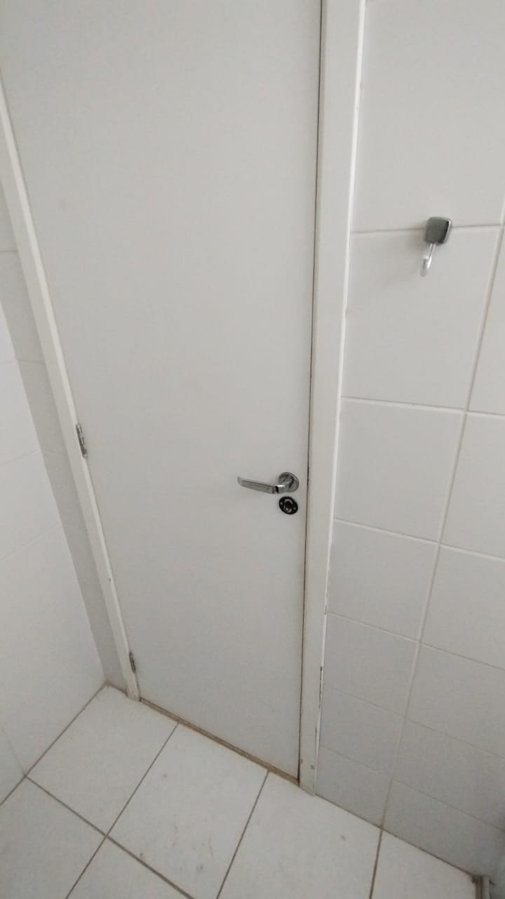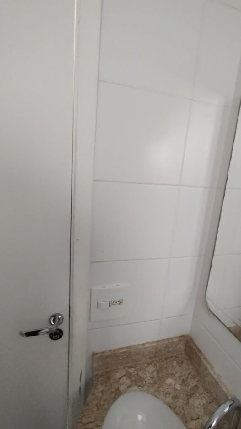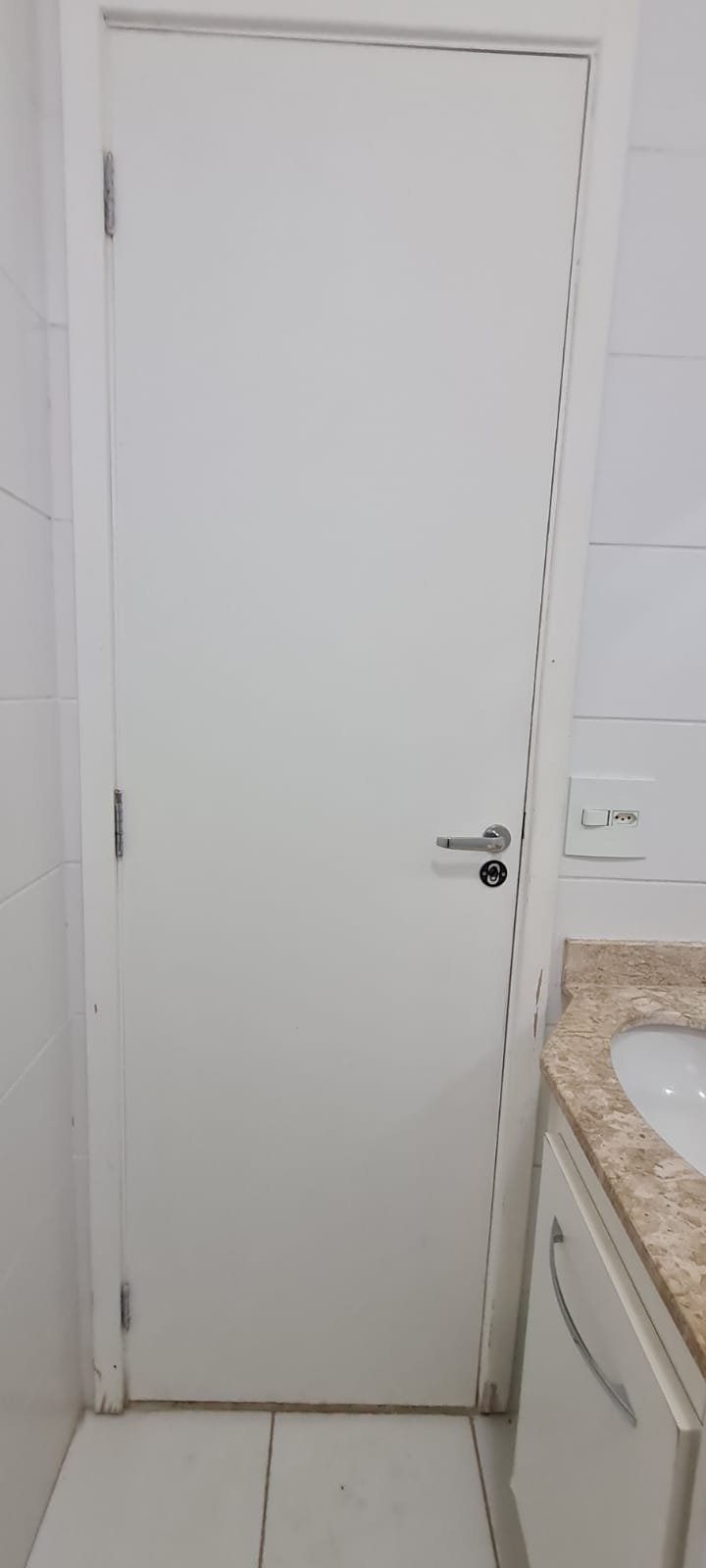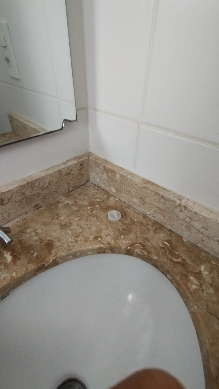 Banheiro Social:- Piso cerâmico na cor branco em ordem, 01 soleira em mármore travertino em ordem, paredes com azulejos ate o teto em ordem, teto com a pintura na cor branco em ordem, 01 porta de madeira com a pintura na cor branca com algumas manchas de sujeira e desgaste o restante em ordem, dobradiças em ordem, maçaneta em ordem, faltando a chave, guarnição em aos os lados a pintura na cor branco em ordem, 01 luminária plafon em ordem, 01 lâmpada de led em ordem, 01 gabinete de pia planejado com manchas de sujeira o restante me ordem, 01 porta em ordem, 01 puxador em ordem, 02 dobradiças pneumáticas em ordem, 01 pia em mármore Travertino com frontão em ordem, uma cuba cerâmica marca Deca em ordem, 01 válvula lavatório rachada o restante em ordem, 01 sifão desentupido em ordem, 01 torneira rosca marca Docol em ordem, 01 porta sabonete em ordem, 03 portas toalhas em ordem, 01 porta papel higiênico em ordem, 01 vaso sanitário cerâmica Deca com caixa acoplada em ordem, 01 kit tampa de vaso em ordem, 01 lixinho de banheiro com tampa em ordem, 01 chuveiro marca Deca em ordem, 04 registros Docol em ordem, 02 ralos desentupido em ordem, 01 Box blindex de abrir em ordem, 01 espelho quadrado com a lateral quebrada o restante em ordem, 01 vitrô basculante em alumínio escovado com vidro, pintura eletrostática na cor branco em ordem, sem o puxador o restante em ordem, 01 interruptor duplo com um modulo de luz e uma tomada com espelho em ordem.