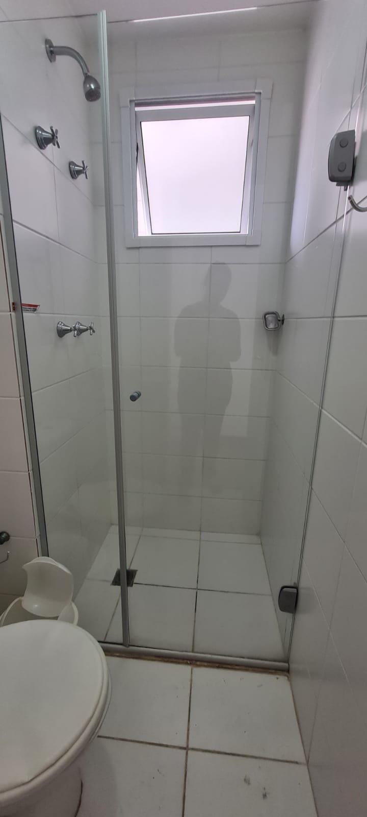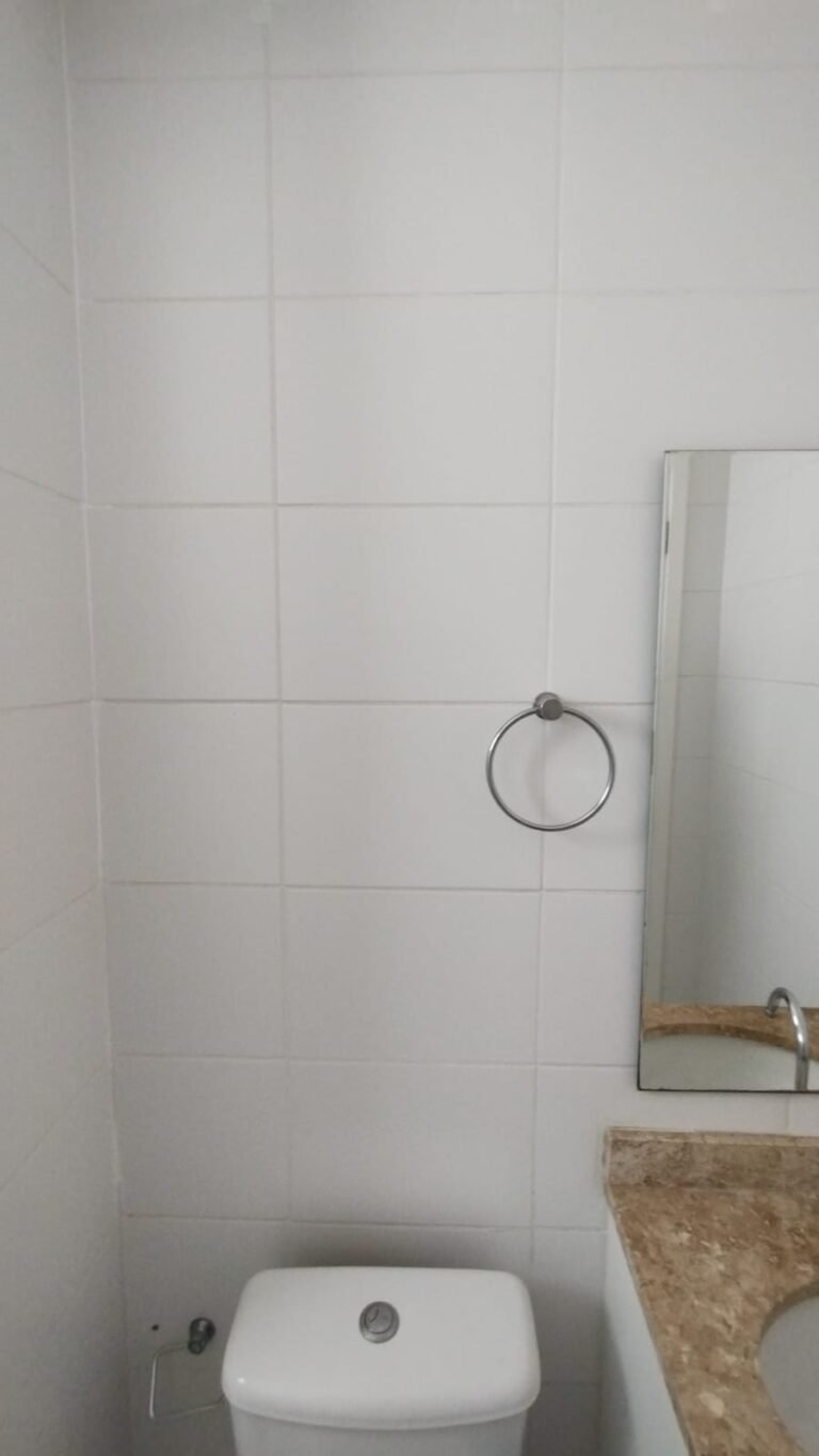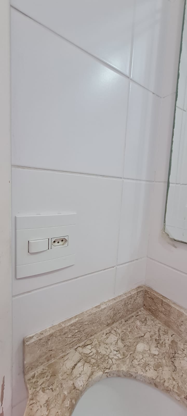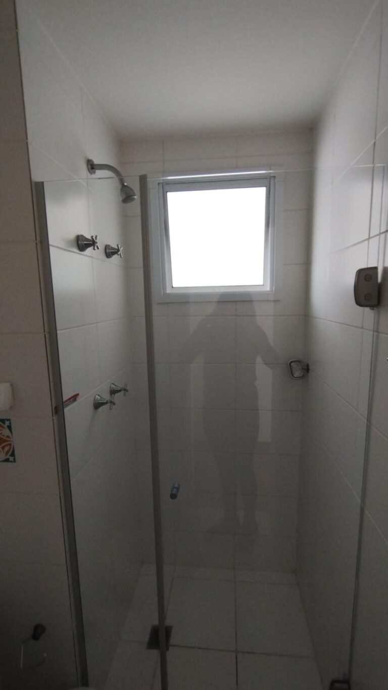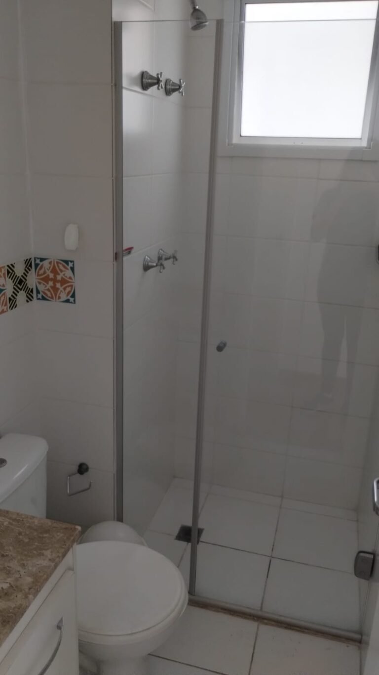 Banheiro Social:- Piso cerâmico na cor branco em ordem, 01 soleira em mármore travertino em ordem, paredes com azulejos ate o teto em ordem, teto com a pintura na cor branco em ordem, 01 porta de madeira com a pintura na cor branca com algumas manchas de sujeira e desgaste o restante em ordem, dobradiças em ordem, maçaneta em ordem, faltando a chave, guarnição em aos os lados a pintura na cor branco em ordem, 01 luminária plafon em ordem, 01 lâmpada de led em ordem, 01 gabinete de pia planejado com manchas de sujeira o restante me ordem, 01 porta em ordem, 01 puxador em ordem, 02 dobradiças pneumáticas em ordem, 01 pia em mármore Travertino com frontão em ordem, uma cuba cerâmica marca Deca em ordem, 01 válvula lavatório rachada o restante em ordem, 01 sifão desentupido em ordem, 01 torneira rosca marca Docol em ordem, 01 porta sabonete em ordem, 03 portas toalhas em ordem, 01 porta papel higiênico em ordem, 01 vaso sanitário cerâmica Deca com caixa acoplada em ordem, 01 kit tampa de vaso em ordem, 01 lixinho de banheiro com tampa em ordem, 01 chuveiro marca Deca em ordem, 04 registros Docol em ordem, 02 ralos desentupido em ordem, 01 Box blindex de abrir em ordem, 01 espelho quadrado com a lateral quebrada o restante em ordem, 01 vitrô basculante em alumínio escovado com vidro, pintura eletrostática na cor branco em ordem, sem o puxador o restante em ordem, 01 interruptor duplo com um modulo de luz e uma tomada com espelho em ordem.