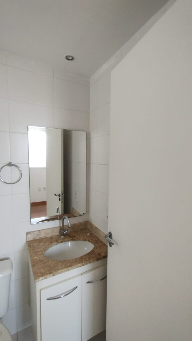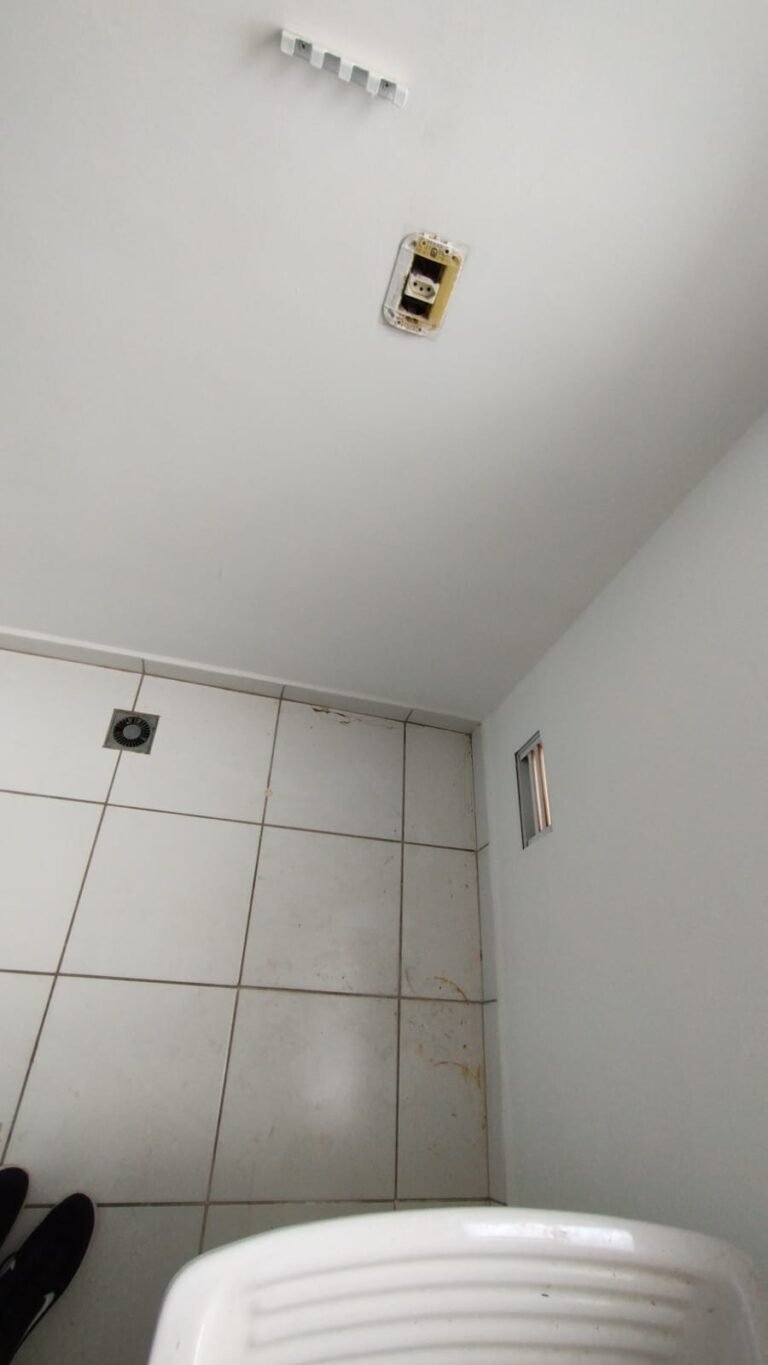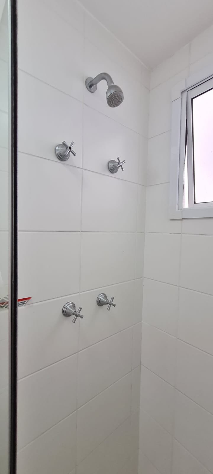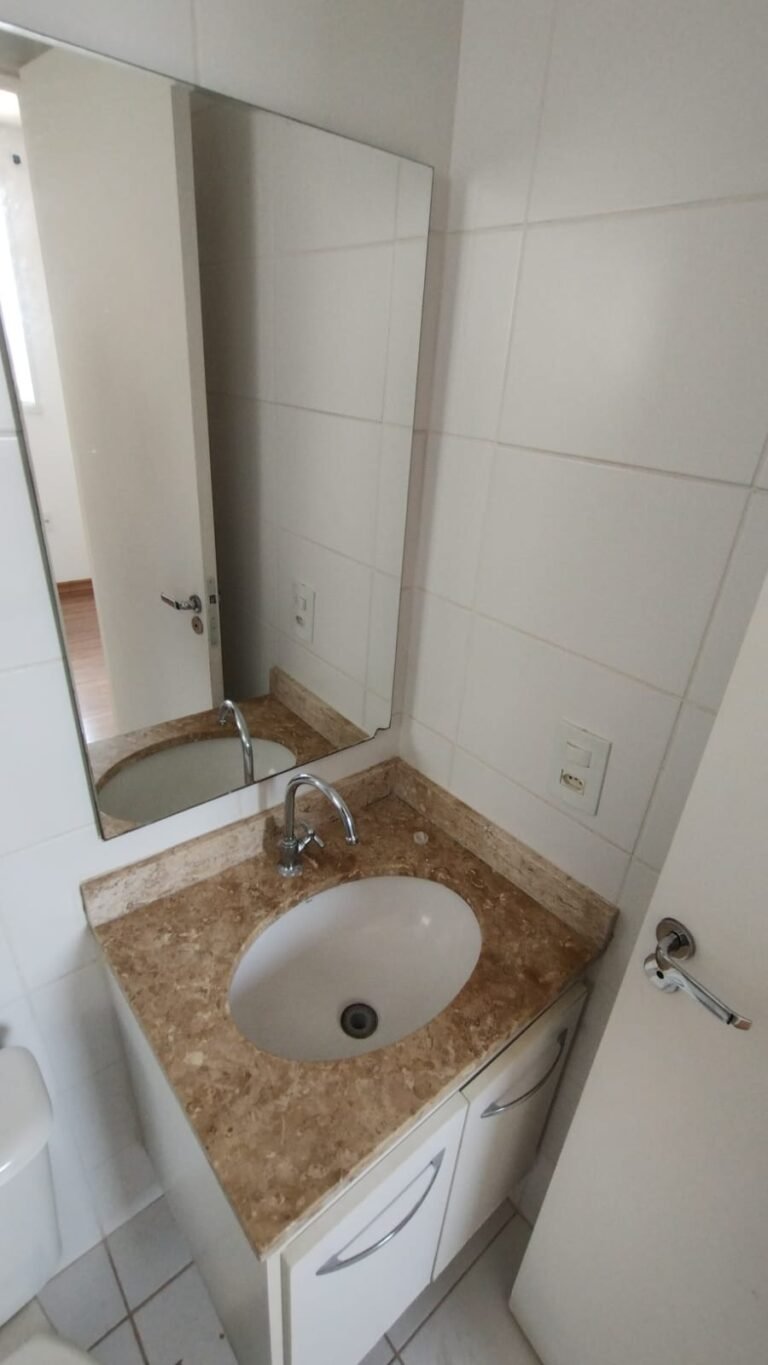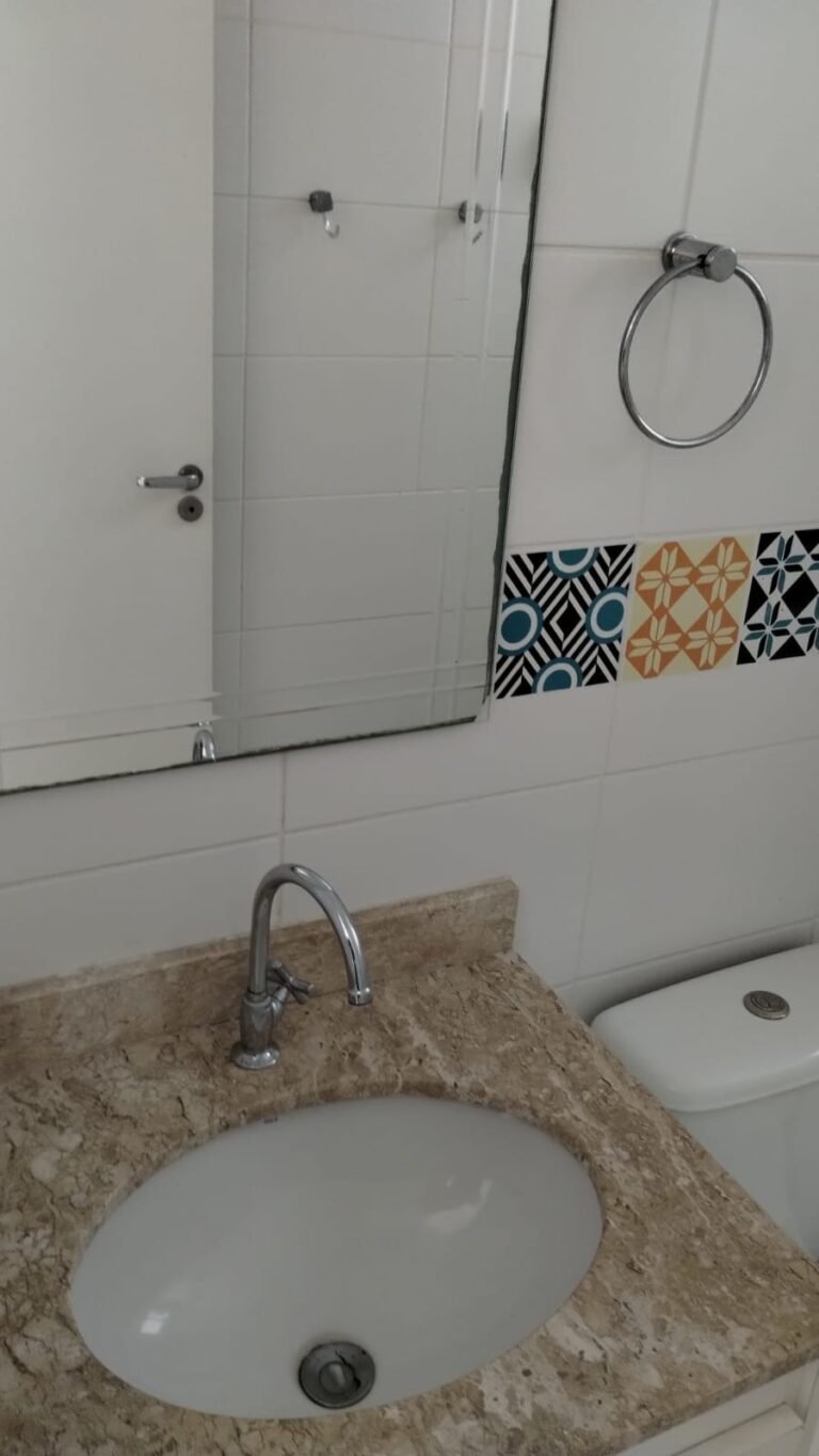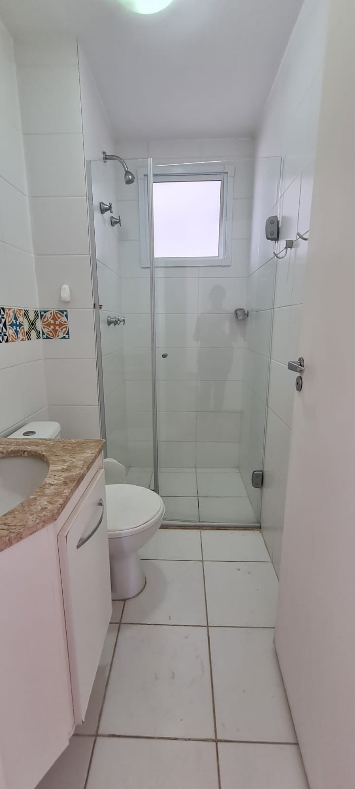 Banheiro Social:- Piso cerâmico na cor branco em ordem, 01 soleira em mármore travertino em ordem, paredes com azulejos ate o teto em ordem, teto com a pintura na cor branco em ordem, 01 porta de madeira com a pintura na cor branca com algumas manchas de sujeira e desgaste o restante em ordem, dobradiças em ordem, maçaneta em ordem, faltando a chave, guarnição em aos os lados a pintura na cor branco em ordem, 01 luminária plafon em ordem, 01 lâmpada de led em ordem, 01 gabinete de pia planejado com manchas de sujeira o restante me ordem, 01 porta em ordem, 01 puxador em ordem, 02 dobradiças pneumáticas em ordem, 01 pia em mármore Travertino com frontão em ordem, uma cuba cerâmica marca Deca em ordem, 01 válvula lavatório rachada o restante em ordem, 01 sifão desentupido em ordem, 01 torneira rosca marca Docol em ordem, 01 porta sabonete em ordem, 03 portas toalhas em ordem, 01 porta papel higiênico em ordem, 01 vaso sanitário cerâmica Deca com caixa acoplada em ordem, 01 kit tampa de vaso em ordem, 01 lixinho de banheiro com tampa em ordem, 01 chuveiro marca Deca em ordem, 04 registros Docol em ordem, 02 ralos desentupido em ordem, 01 Box blindex de abrir em ordem, 01 espelho quadrado com a lateral quebrada o restante em ordem, 01 vitrô basculante em alumínio escovado com vidro, pintura eletrostática na cor branco em ordem, sem o puxador o restante em ordem, 01 interruptor duplo com um modulo de luz e uma tomada com espelho em ordem.
