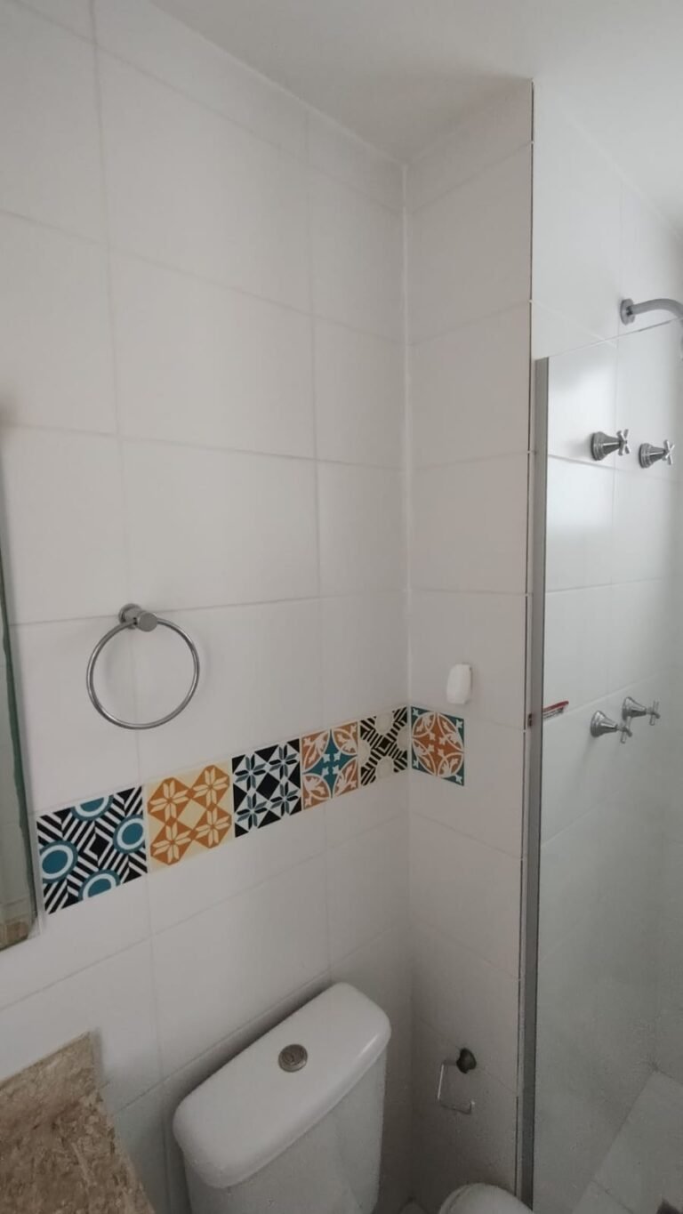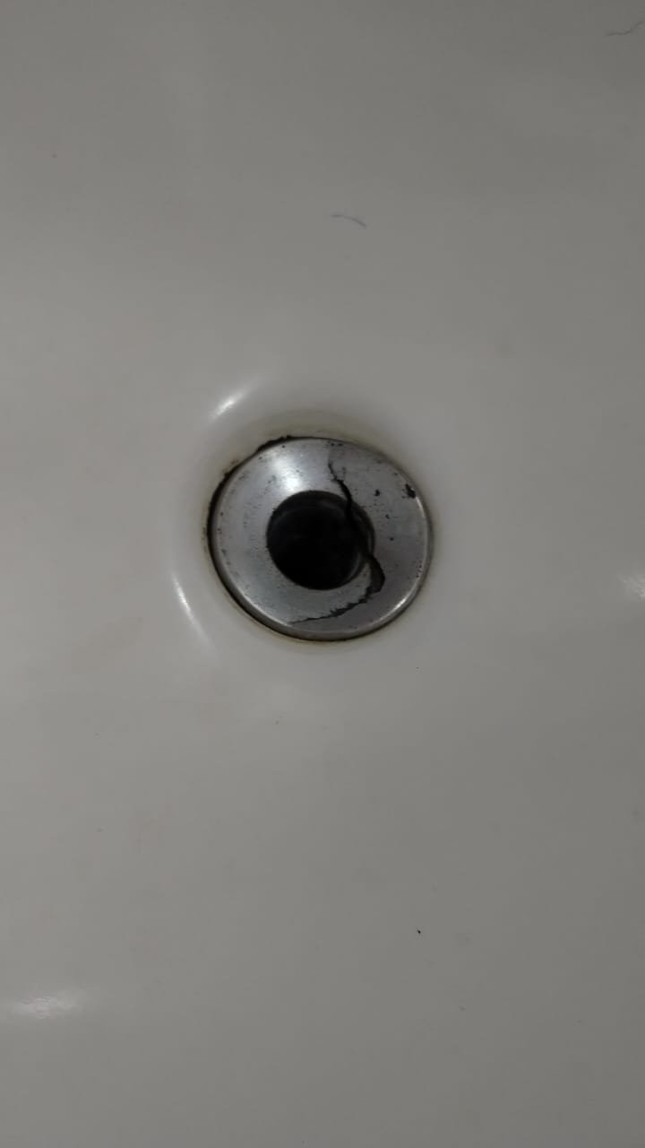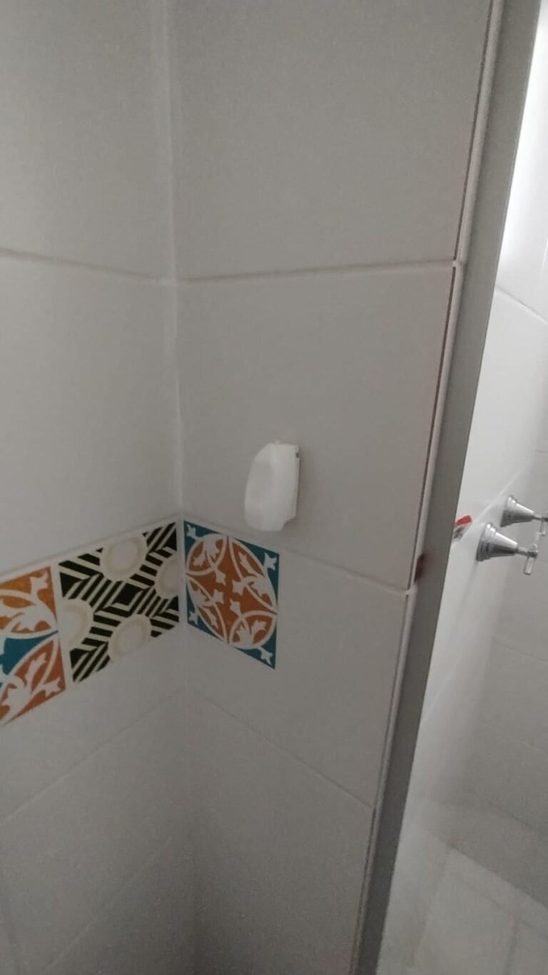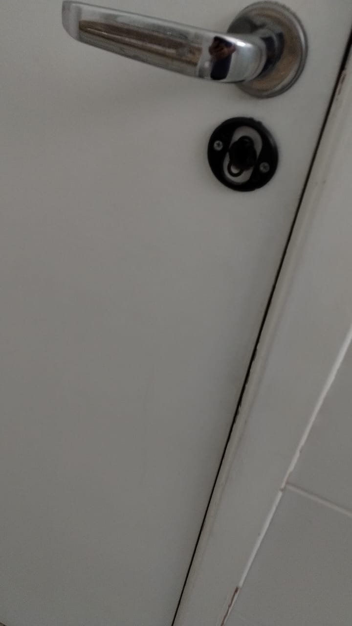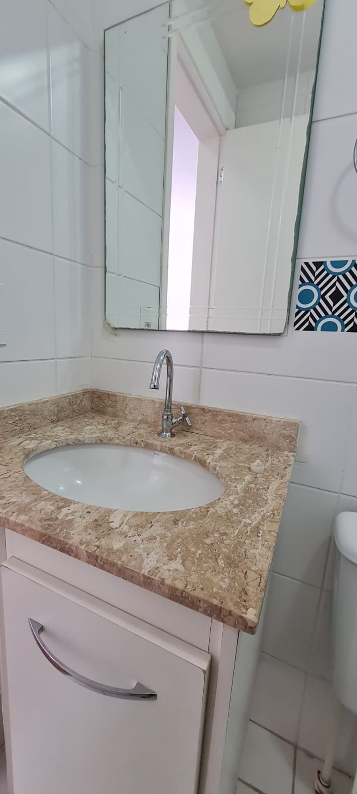 Banheiro Social:- Piso cerâmico na cor branco em ordem, 01 soleira em mármore travertino em ordem, paredes com azulejos ate o teto em ordem, teto com a pintura na cor branco em ordem, 01 porta de madeira com a pintura na cor branca com algumas manchas de sujeira e desgaste o restante em ordem, dobradiças em ordem, maçaneta em ordem, faltando a chave, guarnição em aos os lados a pintura na cor branco em ordem, 01 luminária plafon em ordem, 01 lâmpada de led em ordem, 01 gabinete de pia planejado com manchas de sujeira o restante me ordem, 01 porta em ordem, 01 puxador em ordem, 02 dobradiças pneumáticas em ordem, 01 pia em mármore Travertino com frontão em ordem, uma cuba cerâmica marca Deca em ordem, 01 válvula lavatório rachada o restante em ordem, 01 sifão desentupido em ordem, 01 torneira rosca marca Docol em ordem, 01 porta sabonete em ordem, 03 portas toalhas em ordem, 01 porta papel higiênico em ordem, 01 vaso sanitário cerâmica Deca com caixa acoplada em ordem, 01 kit tampa de vaso em ordem, 01 lixinho de banheiro com tampa em ordem, 01 chuveiro marca Deca em ordem, 04 registros Docol em ordem, 02 ralos desentupido em ordem, 01 Box blindex de abrir em ordem, 01 espelho quadrado com a lateral quebrada o restante em ordem, 01 vitrô basculante em alumínio escovado com vidro, pintura eletrostática na cor branco em ordem, sem o puxador o restante em ordem, 01 interruptor duplo com um modulo de luz e uma tomada com espelho em ordem.