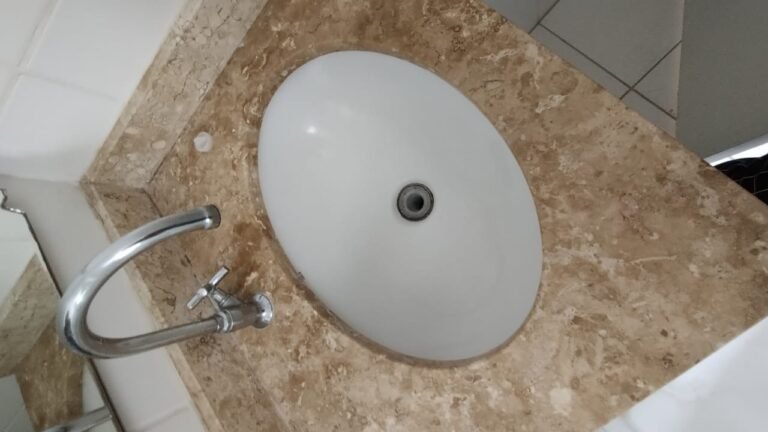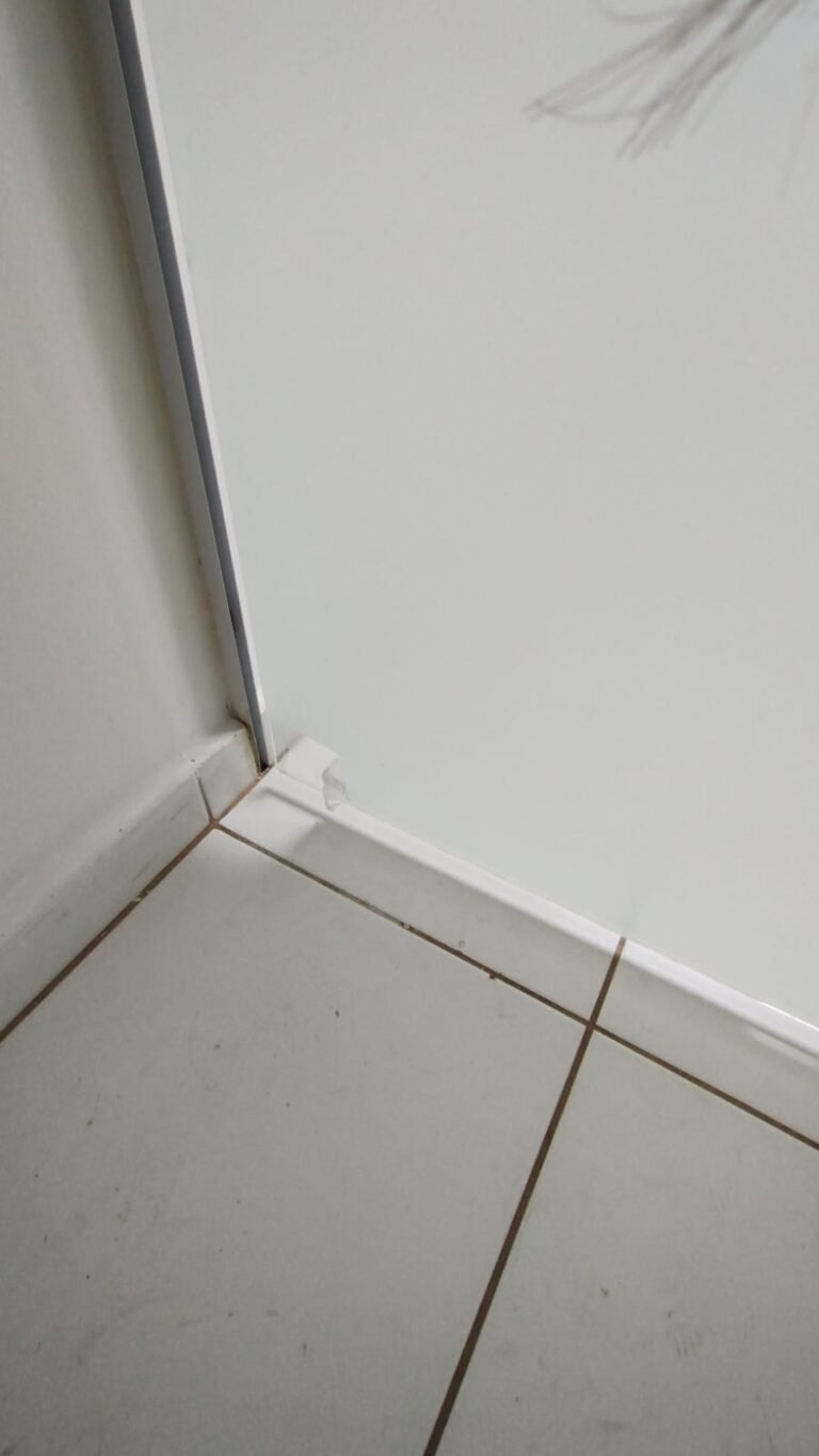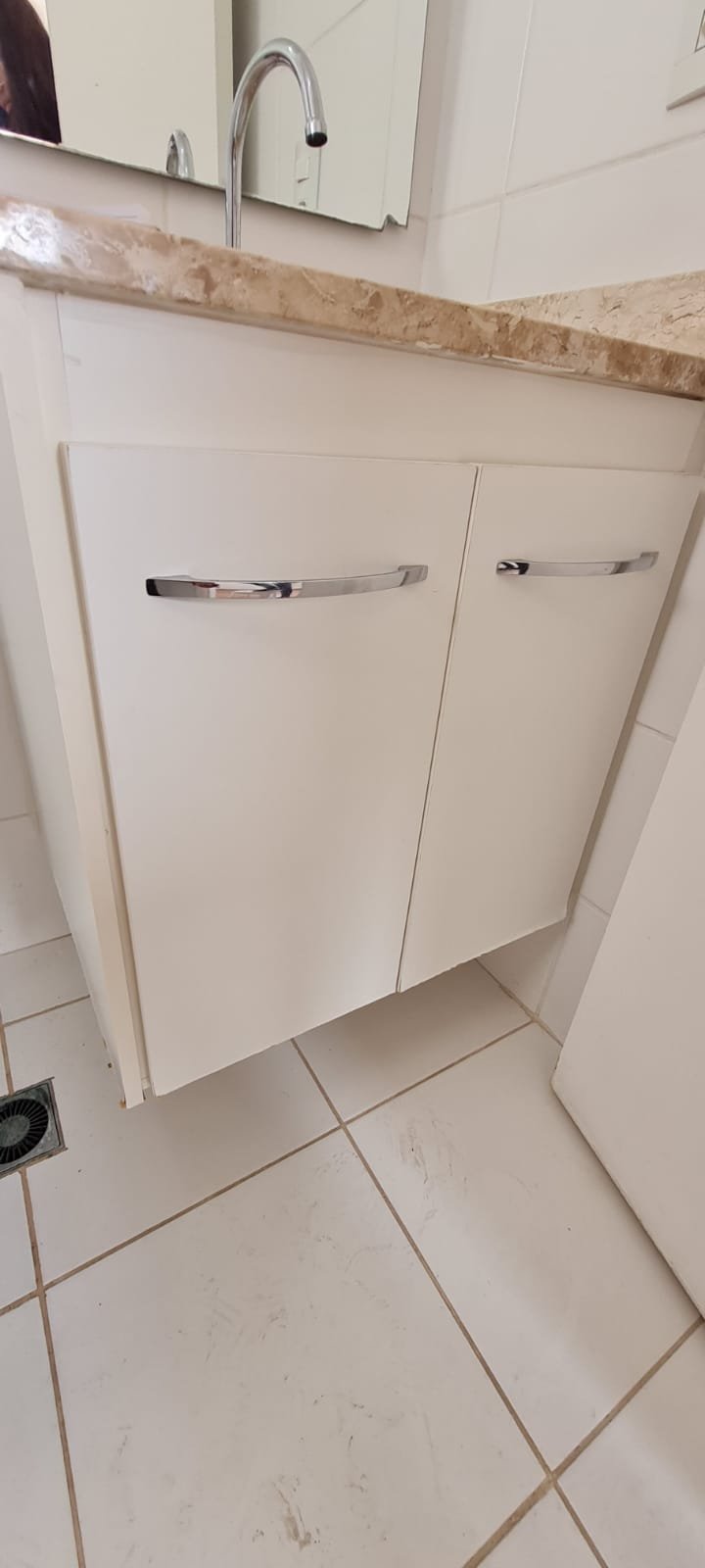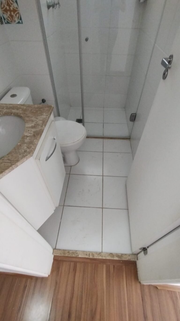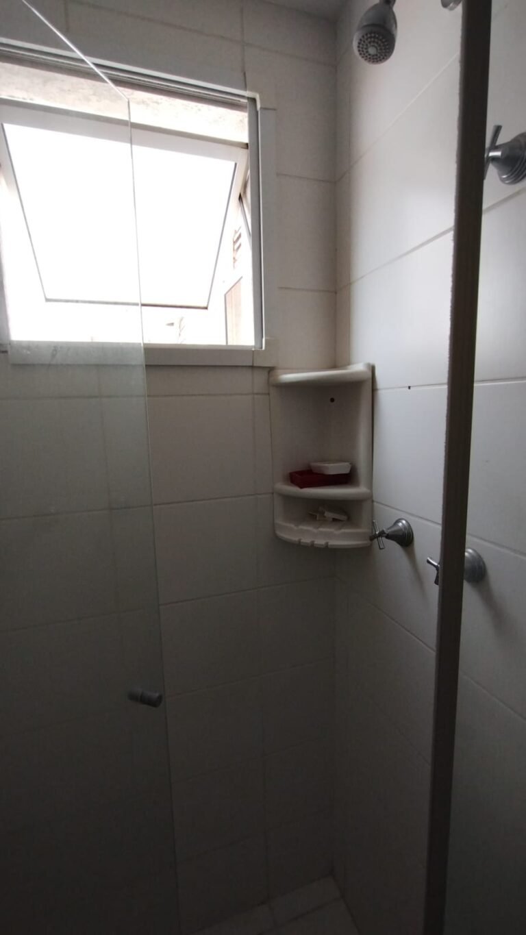 Banheiro Suíte:- Piso cerâmico branco em ordem, paredes com azulejo na cor branco ate o teto com a pintura na cor branco com mancha de infiltração o restante em ordem, porta de madeira com batente com desgaste e a pintura na cor branco com desgaste o restante em ordem, guarnição em ambos os lados com a pintura na cor branco em ordem, 01 soleira em mármore Travertino em ordem, 01 gabinete planejado em madeira com a pintura na cor branco com algumas manchas o restante em ordem, 02 portas com 02 puxadores em ordem, 04 dobradiças pneumáticas em ordem, 01 pia em mármore Travertino com frontão em ordem, 01 cuba cerâmica marca Deca em ordem, válvula em ordem, sifão desentupido em ordem, 01 torneira de rosca marca Docol em ordem, 02 ralos desentupidos em ordem, 01 vaso sanitário cerâmica Deca com caixa acoplada em ordem, tampa vaso sanitário em ordem, 01 Box blindex de abrir em ordem, 03 registros Docol em ordem, 01 chuveiro Deca em ordem, 03 porta toalhas em ordem, 01 porta papel higiênico em ordem, 01 porta shampoo em acrílico em ordem, 01 espelho com a lateral lascada o restante em ordem, 01 janela basculante com vidro em alumínio escovado com a pintura eletrostática na cor branco em ordem, sem o puxador o restante em ordem, 01 interruptor duplo com um modulo de luz e outro de energia com espelho em ordem.