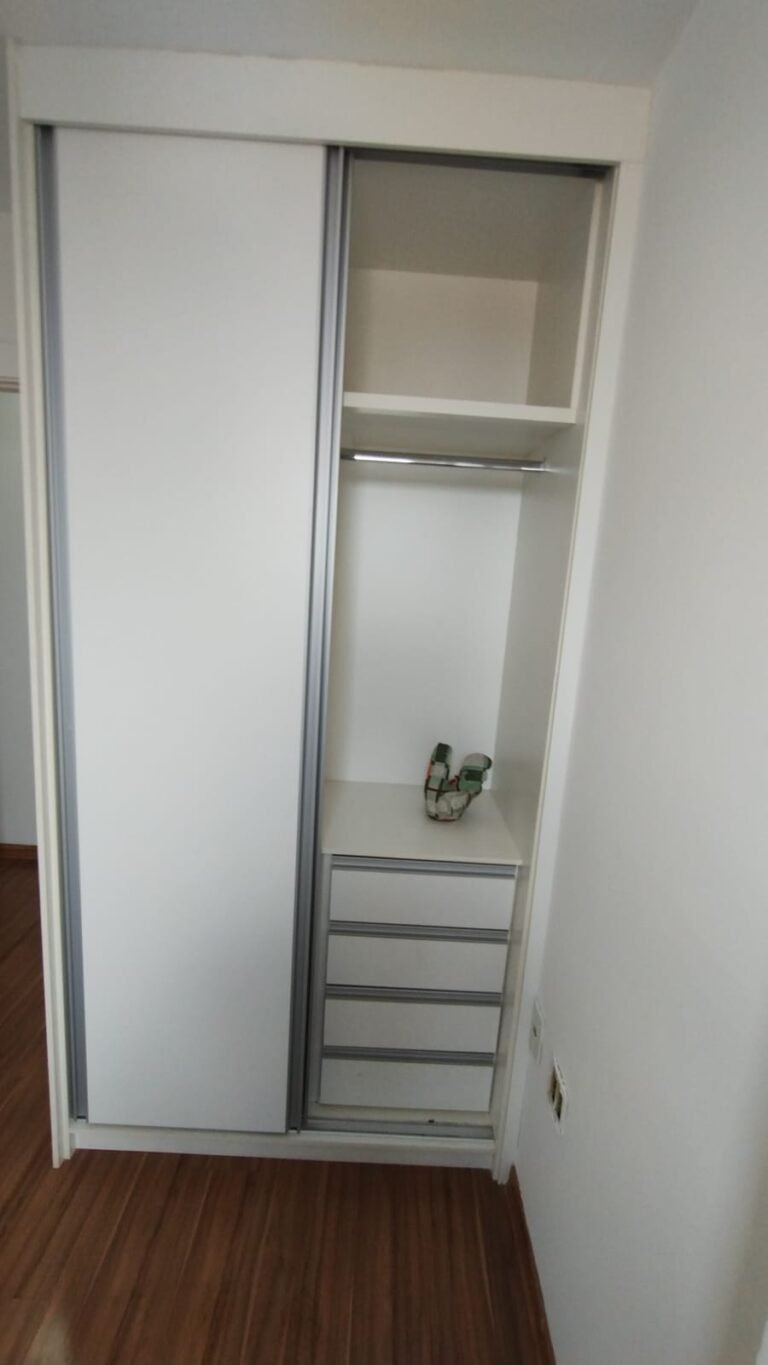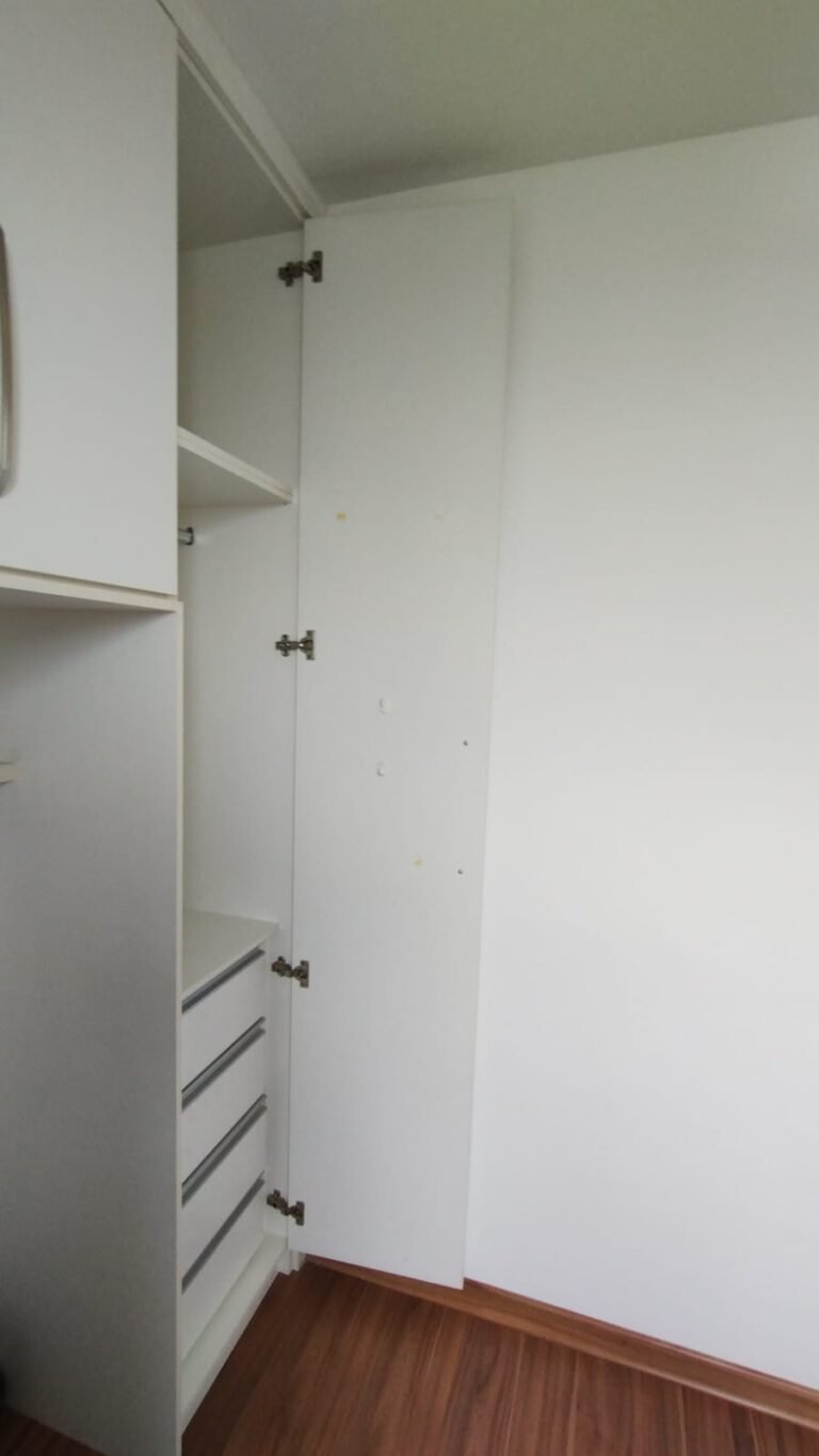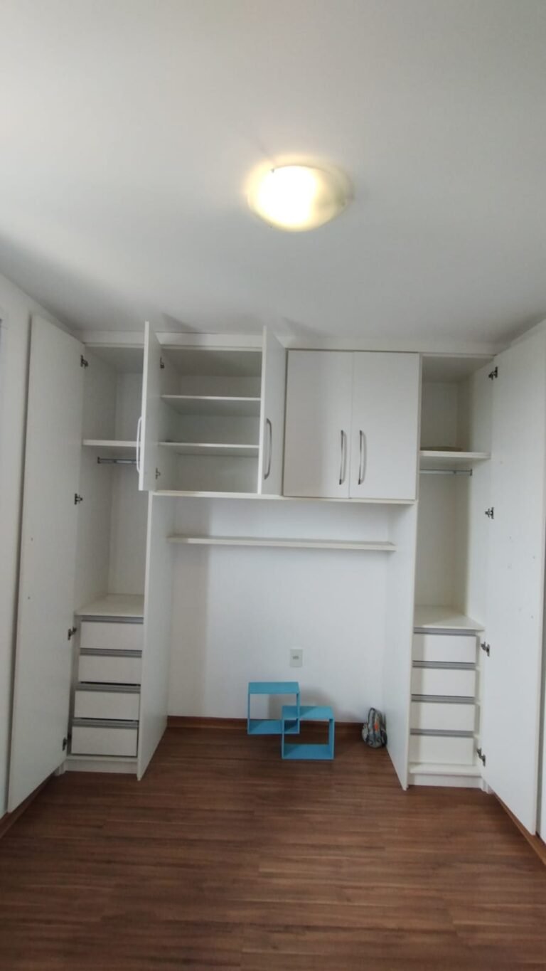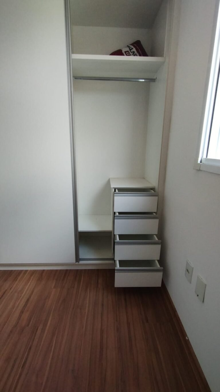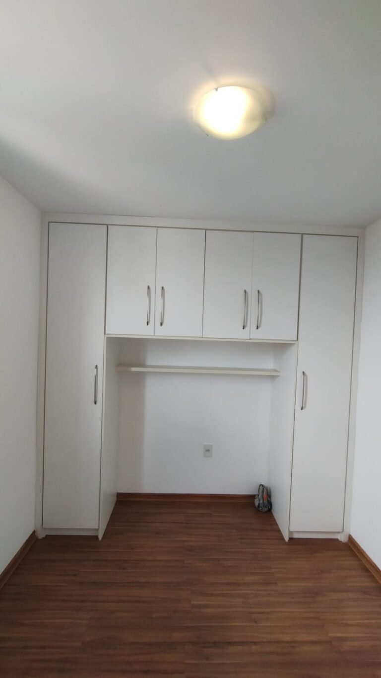 Quarto 01:- Piso laminado de madeira em ordem, rodapés laminado de madeira em em ordem, paredes com a pintura na cor branco em ordem, teto com a pintura na cor branco em ordem, porta de madeira com a pintura na cor branco com desgaste na lateral e no batente o restante em ordem, guarnição em ambos os lados com a pintura na cor branco em ordem, dobradiças em ordem, fechadura quebrada faltando chave, maçanetas em ordem, 01 plafon em ordem, 01 lâmpadas de led em ordem, 01 janela alumínio escovado com a pintura eletrostática na cor branco em ordem, contendo 03 folhas de correr sendo 01 de vidro e as outras duas em alumínio vazado em ordem, 01 rede de proteção na janela em ordem, 01 armário planejado com 02 portas de correr com puxador de alumínio embutido em ordem, 04 gavetas de correr com puxador de alumínio embutido em ordem, 05 nichos em ordem, 01 cabideiro de inox em ordem, 02 maleiros em ordem, 01 suporte duplo 4×4 para modulo sem espelho o restante em ordem, 01 interruptor com um modulo de luz com espelho de em ordem, 02 tomada com um modulo de energia em ordem.