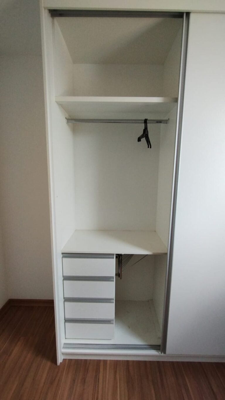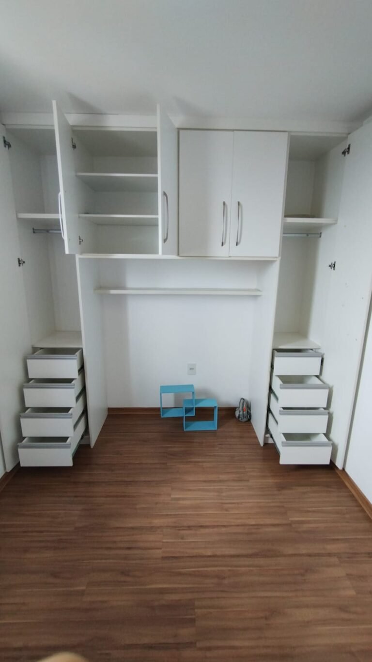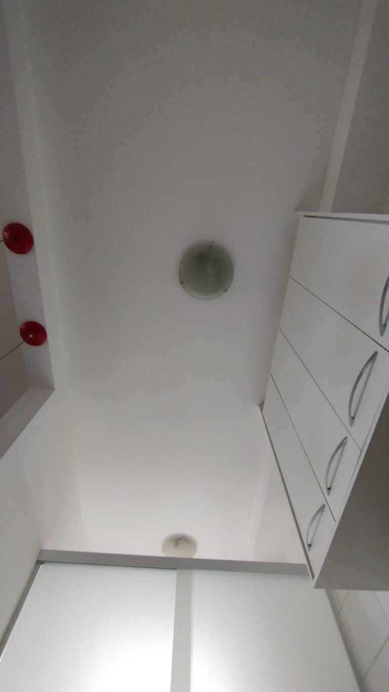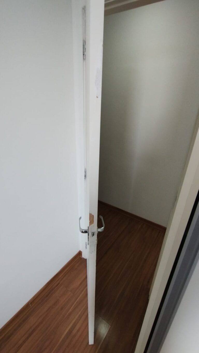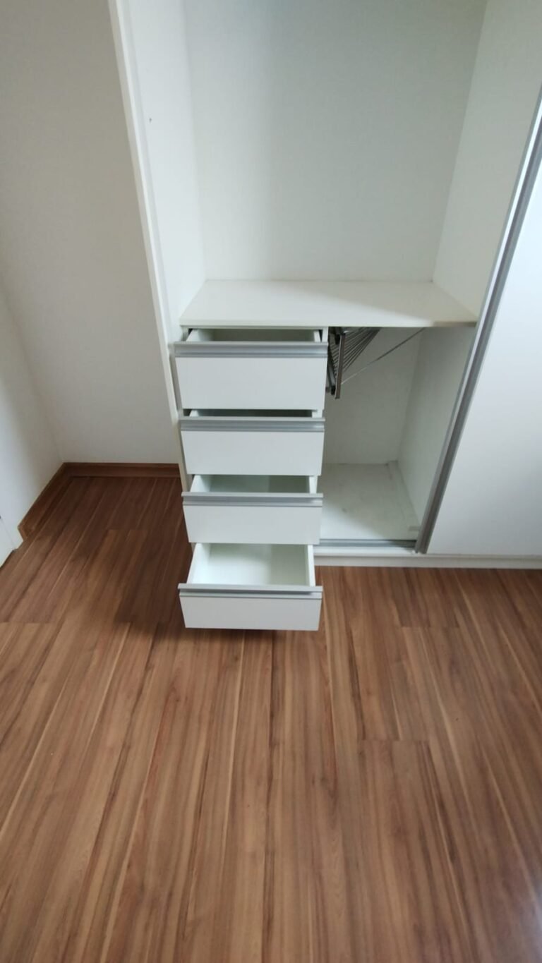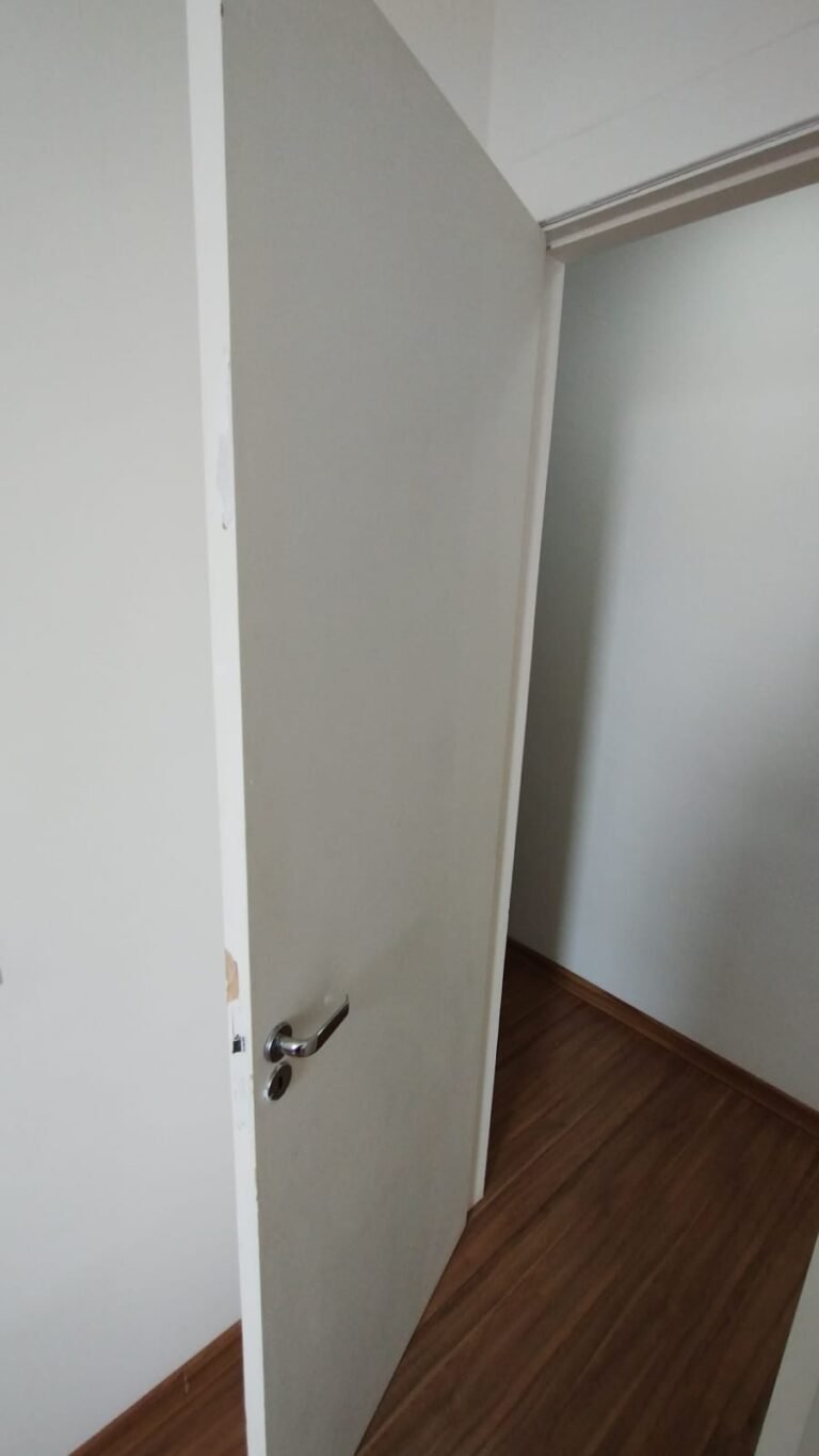 Quarto 01:- Piso laminado de madeira em ordem, rodapés laminado de madeira em em ordem, paredes com a pintura na cor branco em ordem, teto com a pintura na cor branco em ordem, porta de madeira com a pintura na cor branco com desgaste na lateral e no batente o restante em ordem, guarnição em ambos os lados com a pintura na cor branco em ordem, dobradiças em ordem, fechadura quebrada faltando chave, maçanetas em ordem, 01 plafon em ordem, 01 lâmpadas de led em ordem, 01 janela alumínio escovado com a pintura eletrostática na cor branco em ordem, contendo 03 folhas de correr sendo 01 de vidro e as outras duas em alumínio vazado em ordem, 01 rede de proteção na janela em ordem, 01 armário planejado com 02 portas de correr com puxador de alumínio embutido em ordem, 04 gavetas de correr com puxador de alumínio embutido em ordem, 05 nichos em ordem, 01 cabideiro de inox em ordem, 02 maleiros em ordem, 01 suporte duplo 4×4 para modulo sem espelho o restante em ordem, 01 interruptor com um modulo de luz com espelho de em ordem, 02 tomada com um modulo de energia em ordem.