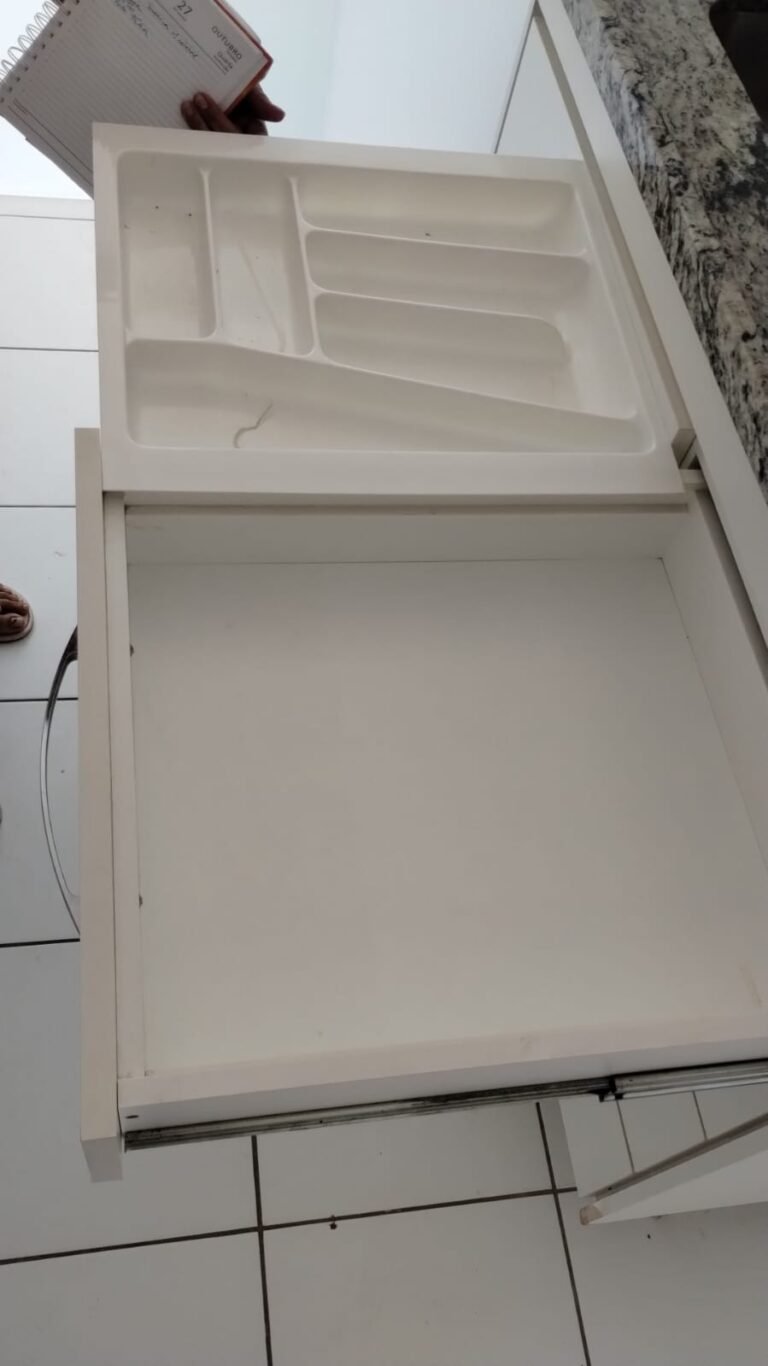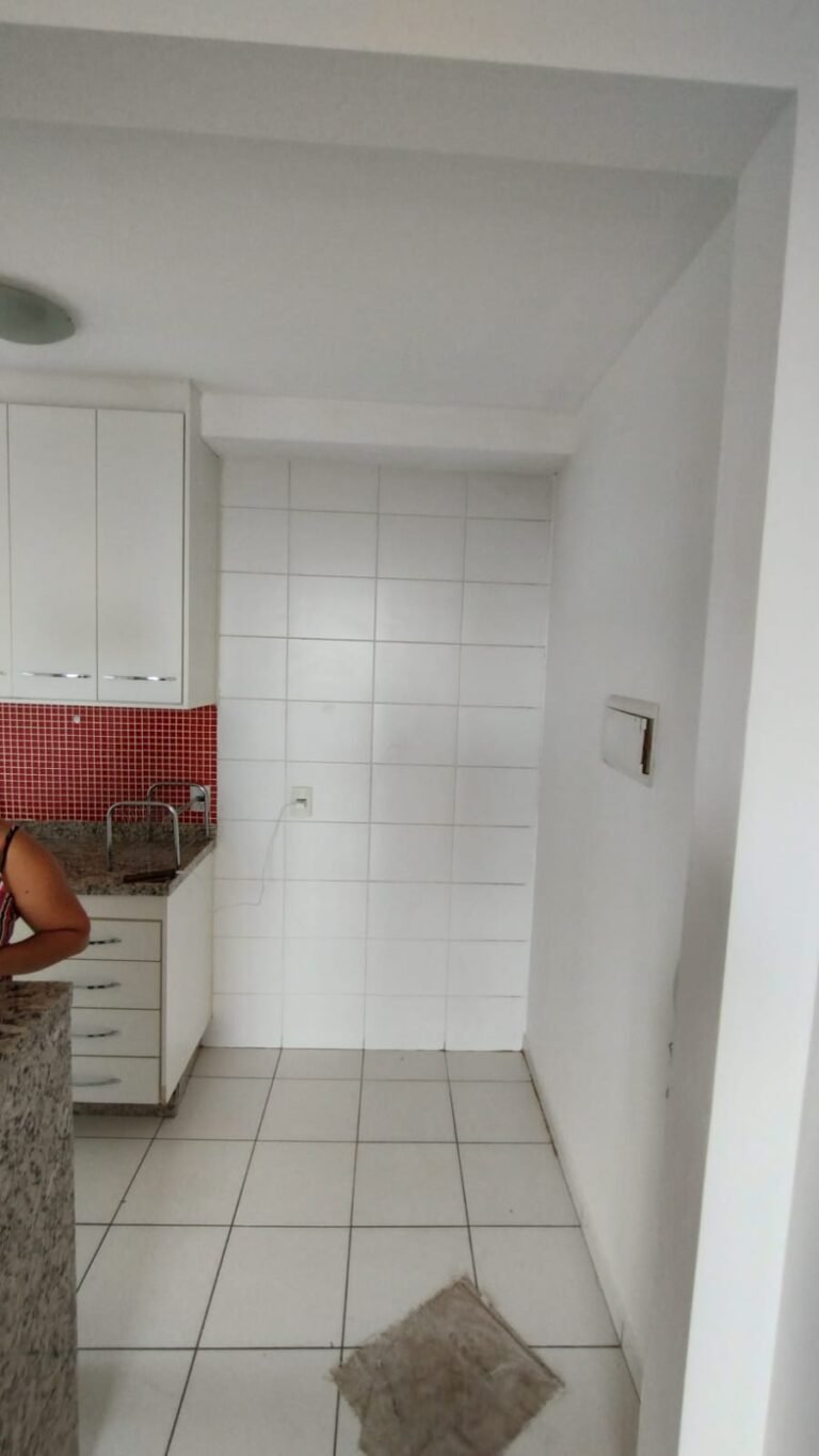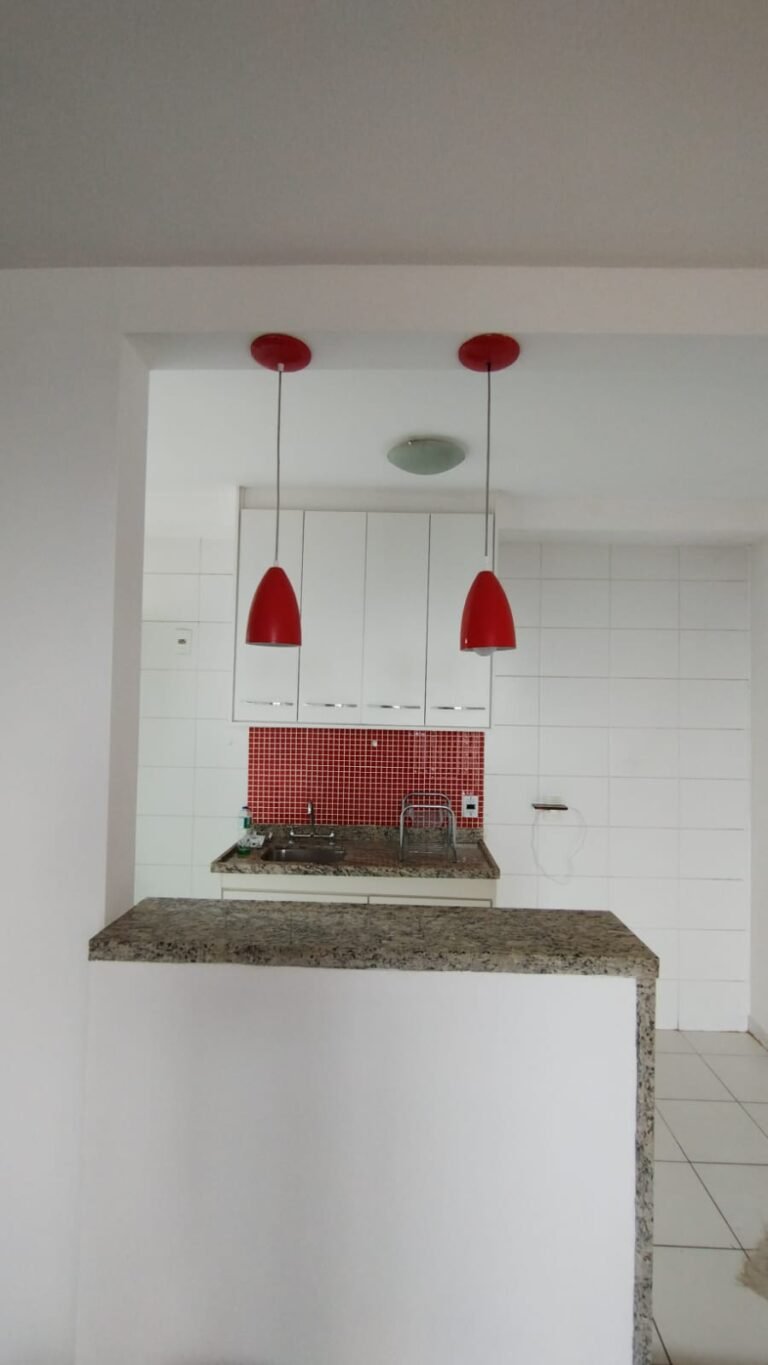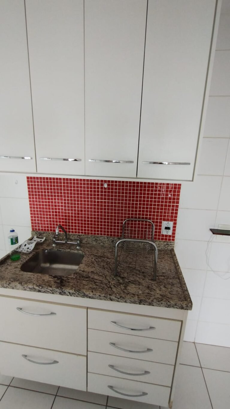 Cozinha:- Piso Cerâmico na cor branco em ordem, rodapés cerâmicos na cor branco em ordem, 01 parede com azulejos até o teto na cor branco em ordem, pastilhas na cor vermelha acima da pia da cozinha em ordem, paredes com a pintura na cor branco em ordem, teto na cor branco em ordem, 01 soleira mármore White Ice em ordem, 01 bancada passa pratos em mármore White Ice em ordem, 01 base em mármore White Ice em ordem, 01 plafon com lâmpada de led em ordem, 01 pia em mármore White Ice com frontão e base em ordem, 01 cuba inox em ordem, 01 válvula em ordem, 01 sifão desentupido em ordem, 01 torneira dupla de rosca Docol em ordem, 01 gabinete de pia planejado com a lateral lascada o restante em ordem, 04 gavetas de correr em ordem, 04 puxadores em ordem, 01 porta talheres removível em ordem, 01 gaveta de correr com puxador em ordem, 01 porta com puxador contendo algumas manchas o restante em ordem, 02 dobradiças sendo uma enferrujada o restante em ordem, 01 pistão pneumático em ordem, 01 armário planejado contendo 04 portas em ordem, 04 puxadores em ordem, 12 dobradiças em ordem, 06 prateleiras em ordem, 01 escorredor de louça inox em ordem, 01 porta detergente em ordem, 01 caixa de disjuntores Seck com tampa em ordem sendo 02 disjuntores steck SD C20 2P, 04 disjuntores SD C20 1P, 01 disjuntor SD C16 1P, 01 disjuntor SDR 63A, 02 lustres pendentes cone de alumínio com a pintura na cor vermelho em ordem, 02 lâmpadas de led em ordem, 01 plafon com 01 lâmpada de led em ordem, 01 interruptor com dois módulos de luz com espelho em ordem, 02 tomadas com espelho em ordem, 01 tomada dupla sem espelho o restante em ordem, 02 porta toalhas de plástico em ordem.