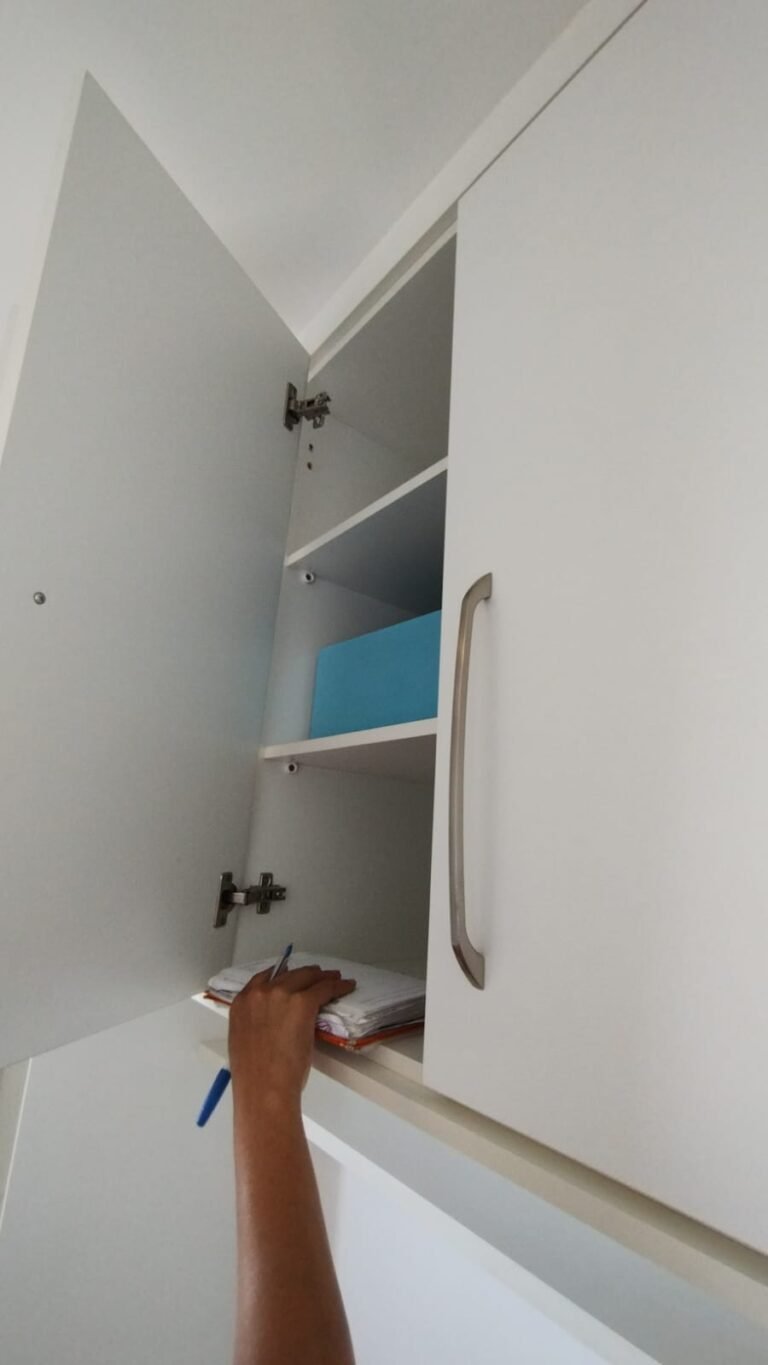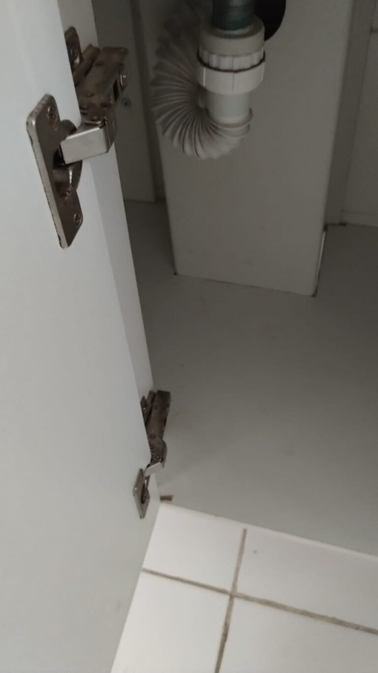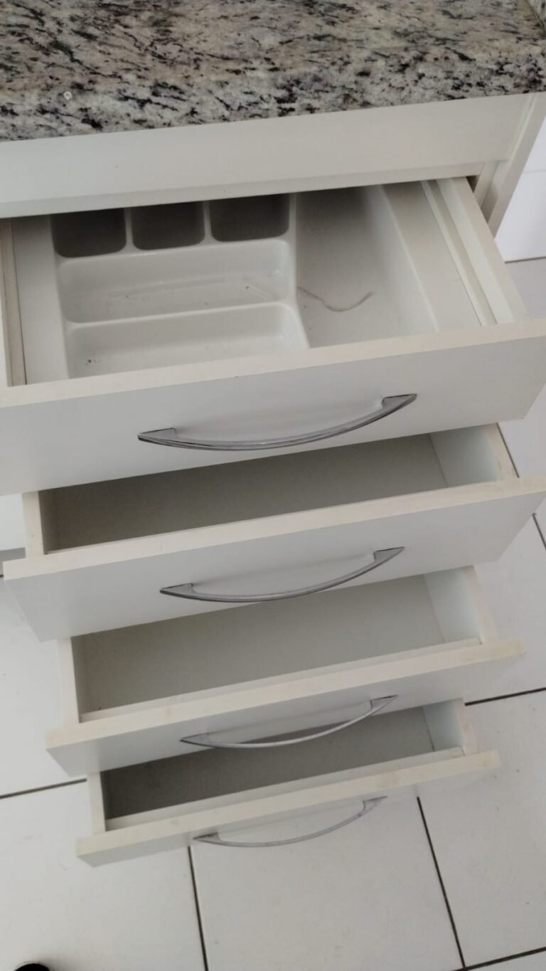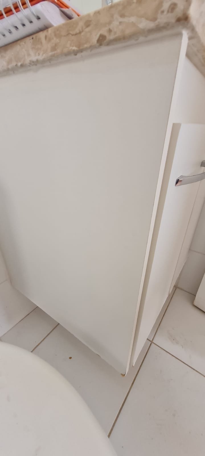 Cozinha:- Piso Cerâmico na cor branco em ordem, rodapés cerâmicos na cor branco em ordem, 01 parede com azulejos até o teto na cor branco em ordem, pastilhas na cor vermelha acima da pia da cozinha em ordem, paredes com a pintura na cor branco em ordem, teto na cor branco em ordem, 01 soleira mármore White Ice em ordem, 01 bancada passa pratos em mármore White Ice em ordem, 01 base em mármore White Ice em ordem, 01 plafon com lâmpada de led em ordem, 01 pia em mármore White Ice com frontão e base em ordem, 01 cuba inox em ordem, 01 válvula em ordem, 01 sifão desentupido em ordem, 01 torneira dupla de rosca Docol em ordem, 01 gabinete de pia planejado com a lateral lascada o restante em ordem, 04 gavetas de correr em ordem, 04 puxadores em ordem, 01 porta talheres removível em ordem, 01 gaveta de correr com puxador em ordem, 01 porta com puxador contendo algumas manchas o restante em ordem, 02 dobradiças sendo uma enferrujada o restante em ordem, 01 pistão pneumático em ordem, 01 armário planejado contendo 04 portas em ordem, 04 puxadores em ordem, 12 dobradiças em ordem, 06 prateleiras em ordem, 01 escorredor de louça inox em ordem, 01 porta detergente em ordem, 01 caixa de disjuntores Seck com tampa em ordem sendo 02 disjuntores steck SD C20 2P, 04 disjuntores SD C20 1P, 01 disjuntor SD C16 1P, 01 disjuntor SDR 63A, 02 lustres pendentes cone de alumínio com a pintura na cor vermelho em ordem, 02 lâmpadas de led em ordem, 01 plafon com 01 lâmpada de led em ordem, 01 interruptor com dois módulos de luz com espelho em ordem, 02 tomadas com espelho em ordem, 01 tomada dupla sem espelho o restante em ordem, 02 porta toalhas de plástico em ordem.
