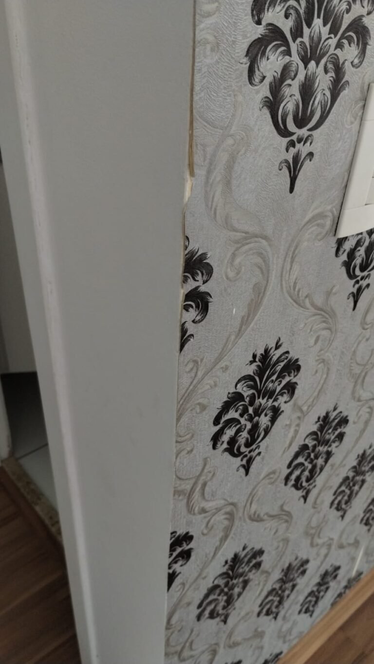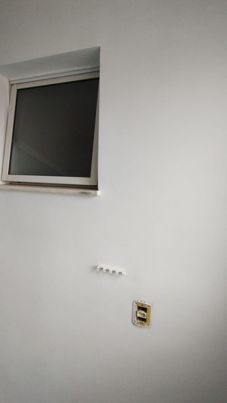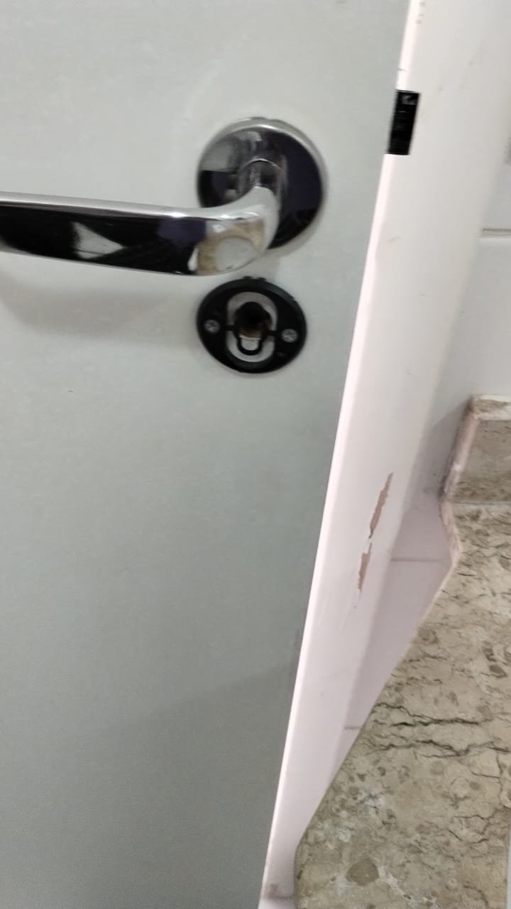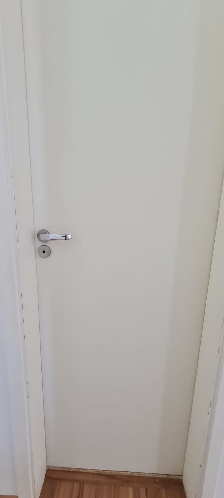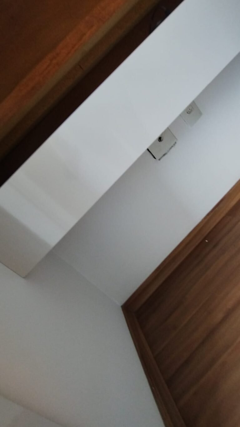 Sala:- Porta de madeira com a pintura na cor branco com prego na parte superior da porta restante em ordem, dobradiças em ordem, fechadura em ordem, chaves em ordem, guarnição em ambos os lados com a pintura na cor branco em ordem, paredes com a pintura na cor branco em ordem, 01 parede contendo papel de parede com a lateral lascada e parte inferior faltando um pedaço restante em ordem, teto com a pintura na cor branco em ordem, piso laminado de madeira em ordem, rodapés laminados de madeira em ordem, 01 plafon em ordem, 01 lâmpada de led em ordem, 01 plafon sem a tampa de vidro contendo 01 lâmpada de led o restante em ordem, 01 interfone em ordem, 01 campainha em ordem, 01 interruptor com dois módulos de luz com espelho em ordem, 01 interruptor de luz com três módulos de luz com espelho em ordem, 01 tomada com espelho em ordem, 01 interruptor com modulo de saída para cabo com espelho em ordem, 01 tomada dupla com dois módulos de energia com espelho em ordem, um interruptor com um modulo para cabo e um cego com espelho em ordem, 01 interruptor para sacada com modulo de luz com espelho em ordem, 01 varão para cortina na cor mogno em ordem, 01 porta chaves em ordem, 01 rack de madeira com uma gaveta na cor laca com alguns lascos o restante em ordem, contendo duas dobradiças fixas em ordem, 01 pistão pneumático em ordem.