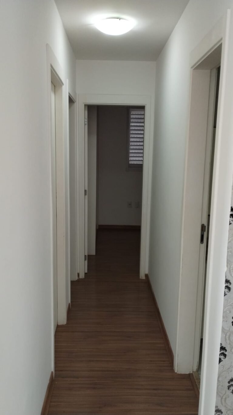 Corredor:- Piso laminado de madeira, rodapés laminado de madeira em ordem, paredes com a pintura na cor branco em ordem, 01 luminária plafon em ordem, 01 lâmpada de led em ordem,