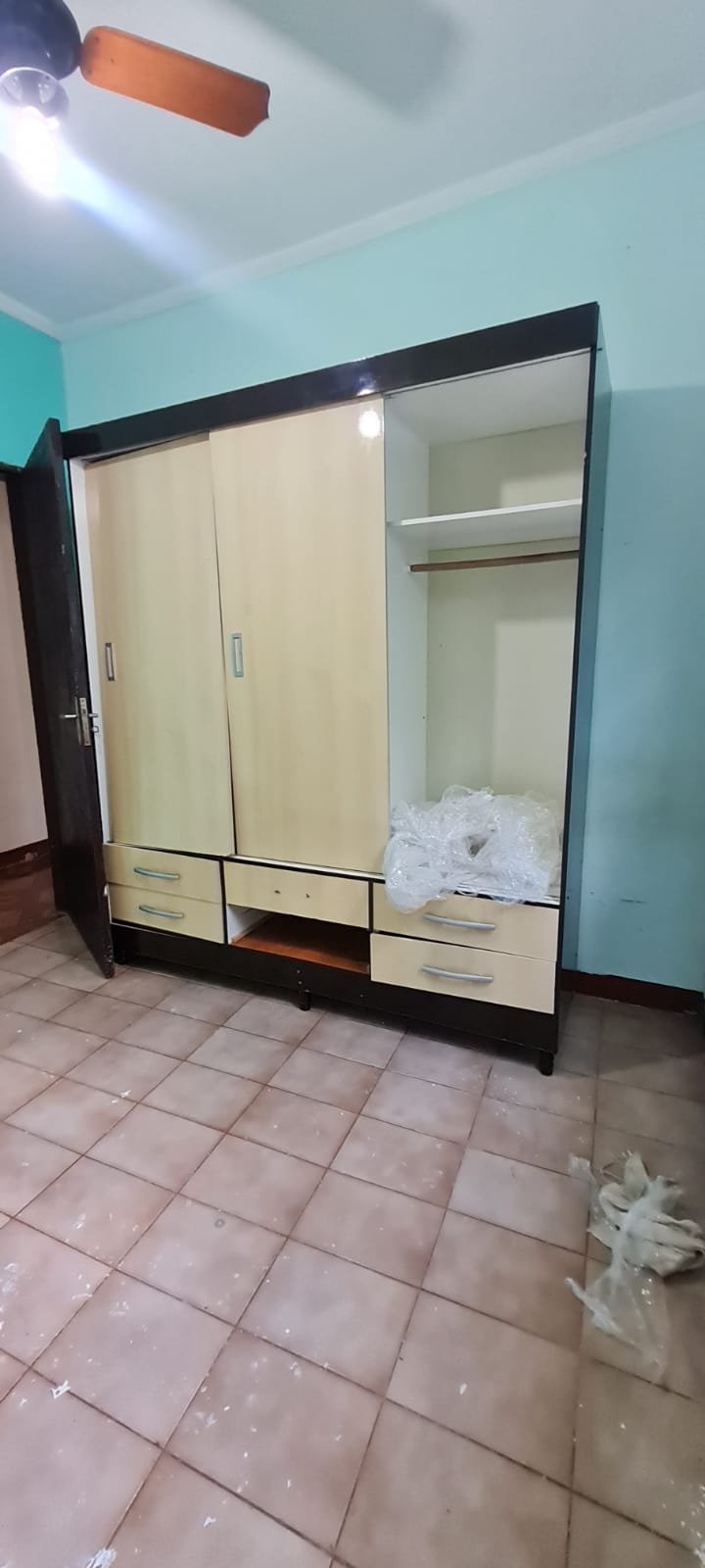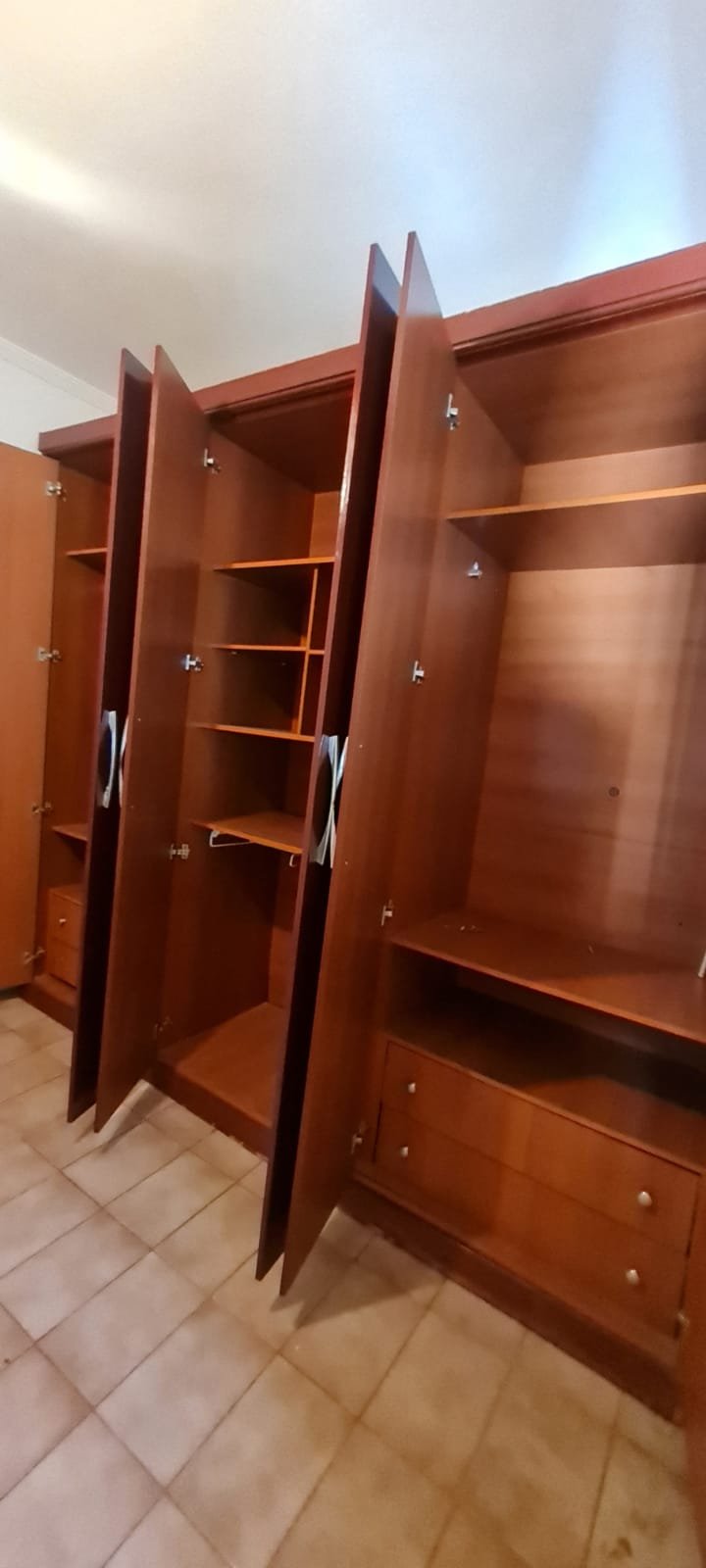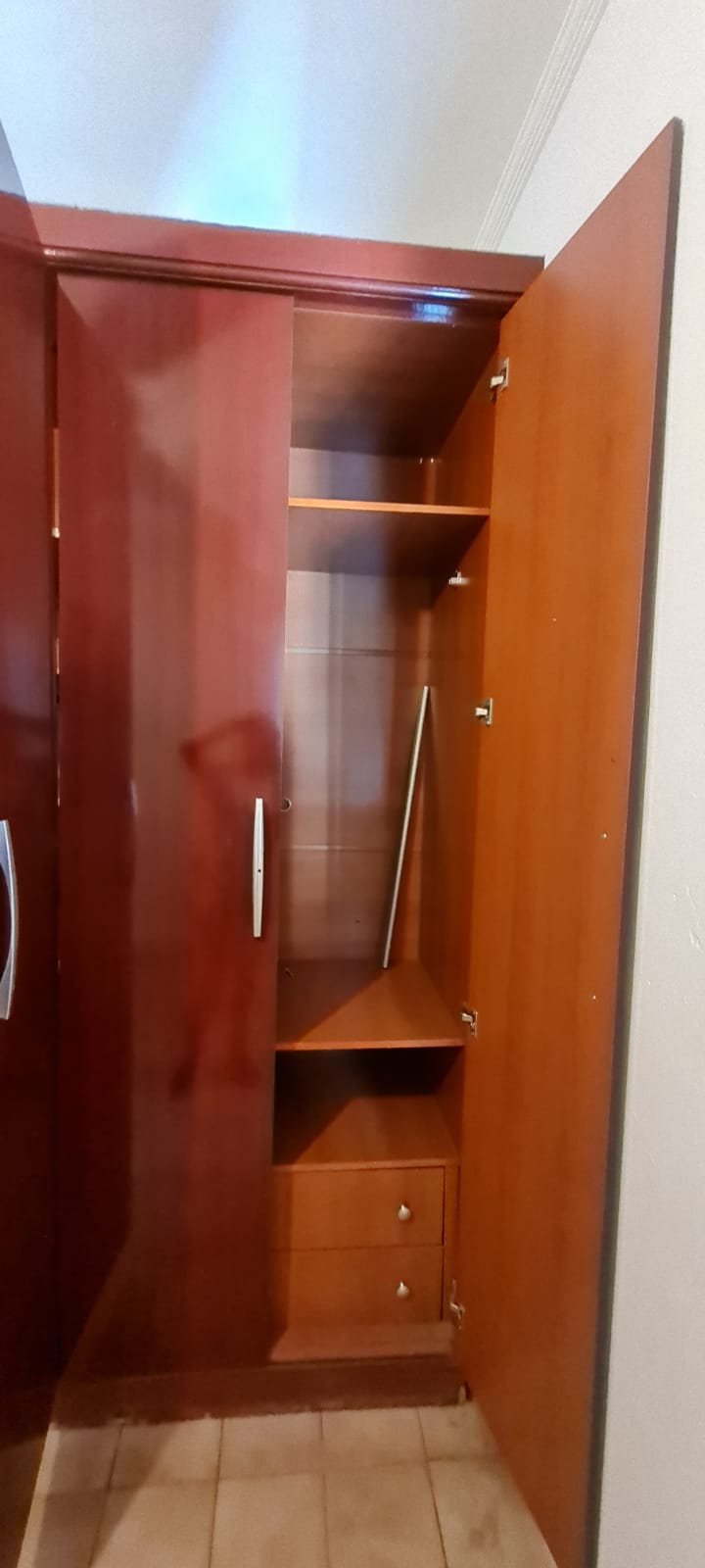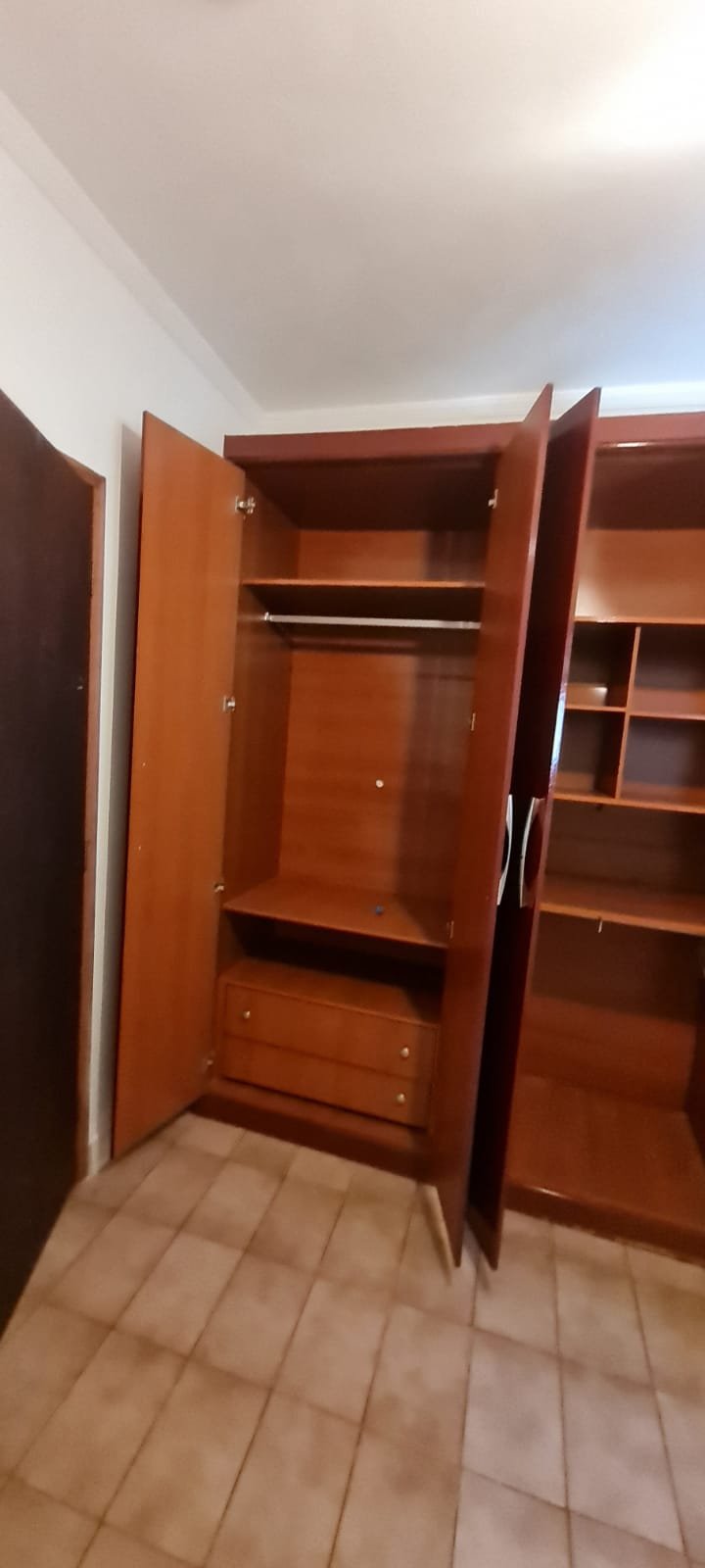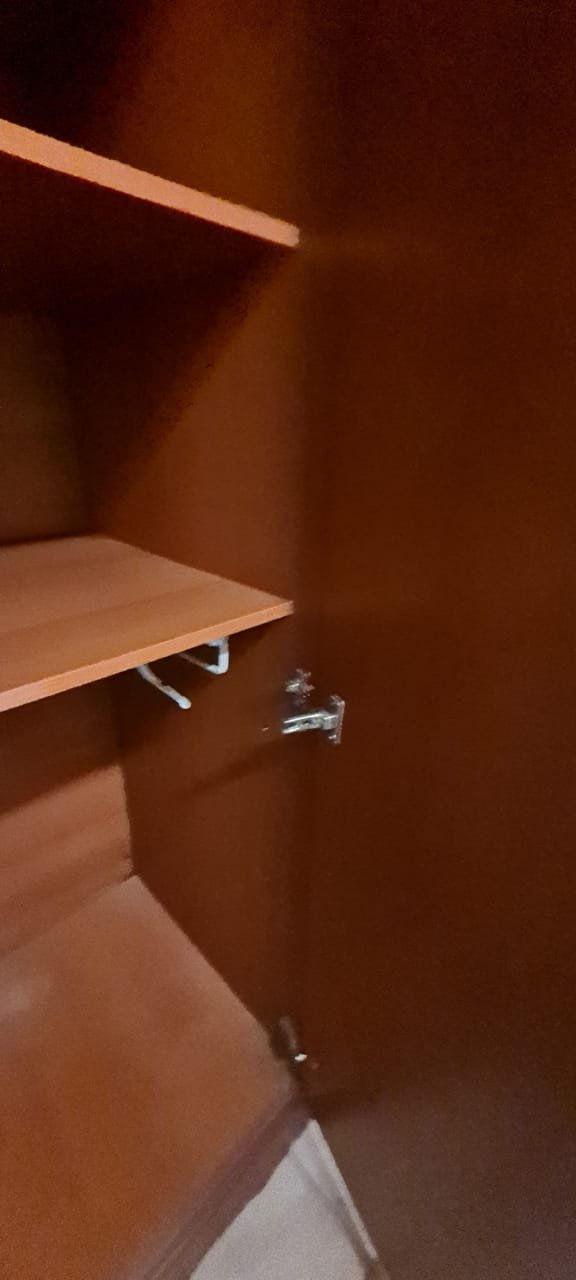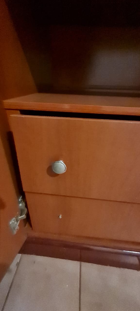 Quarto Suíte:- Parede do quarto com pintura bege, piso com manchas de sujeira, guarda roupas com 04 dobradiças quebradas, 02 gavetas emperradas, faltando 01 puxador na gaveta, base estufada.