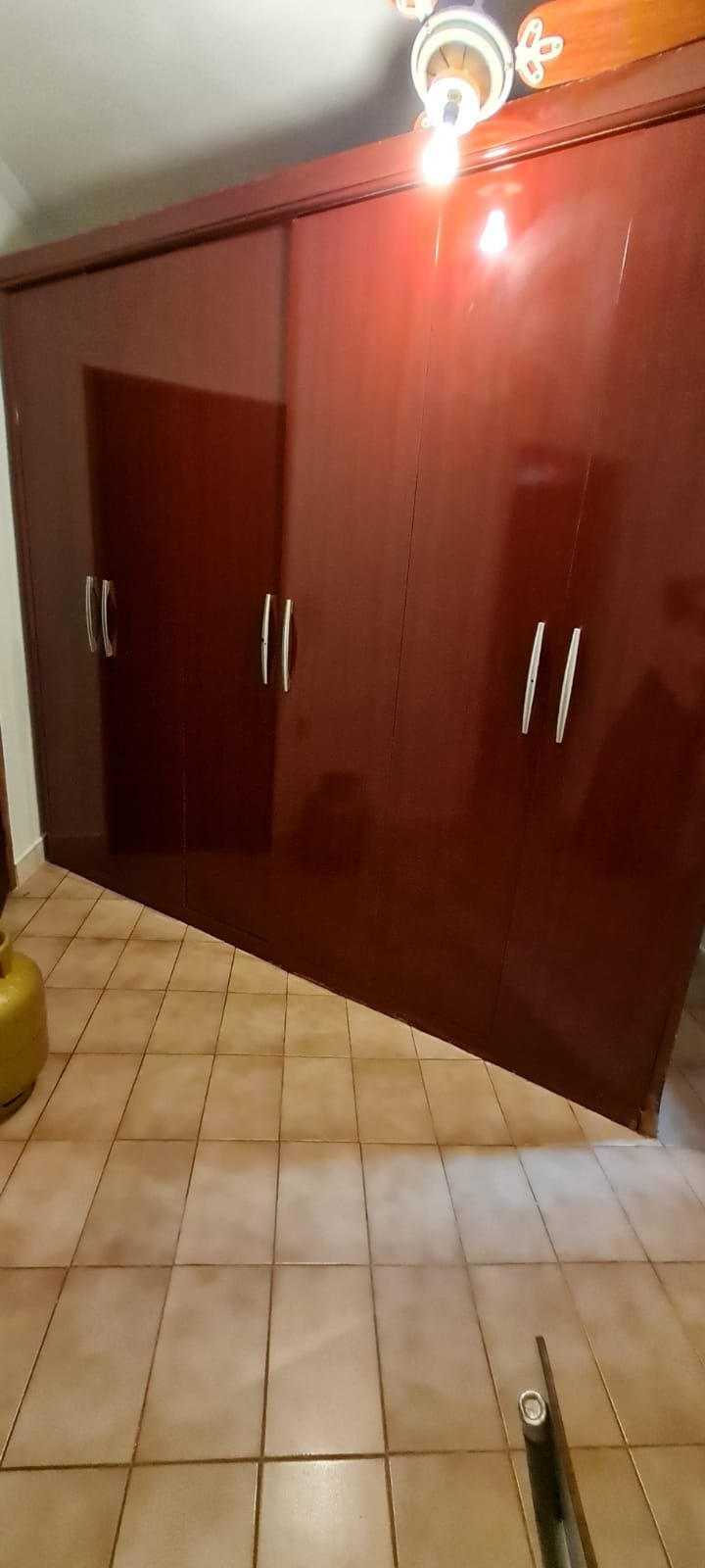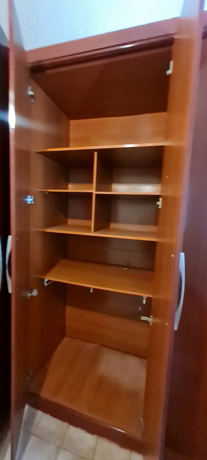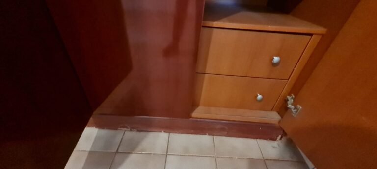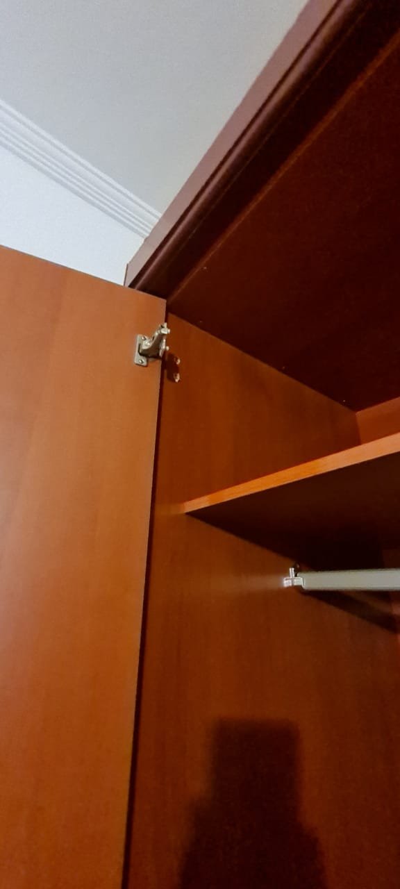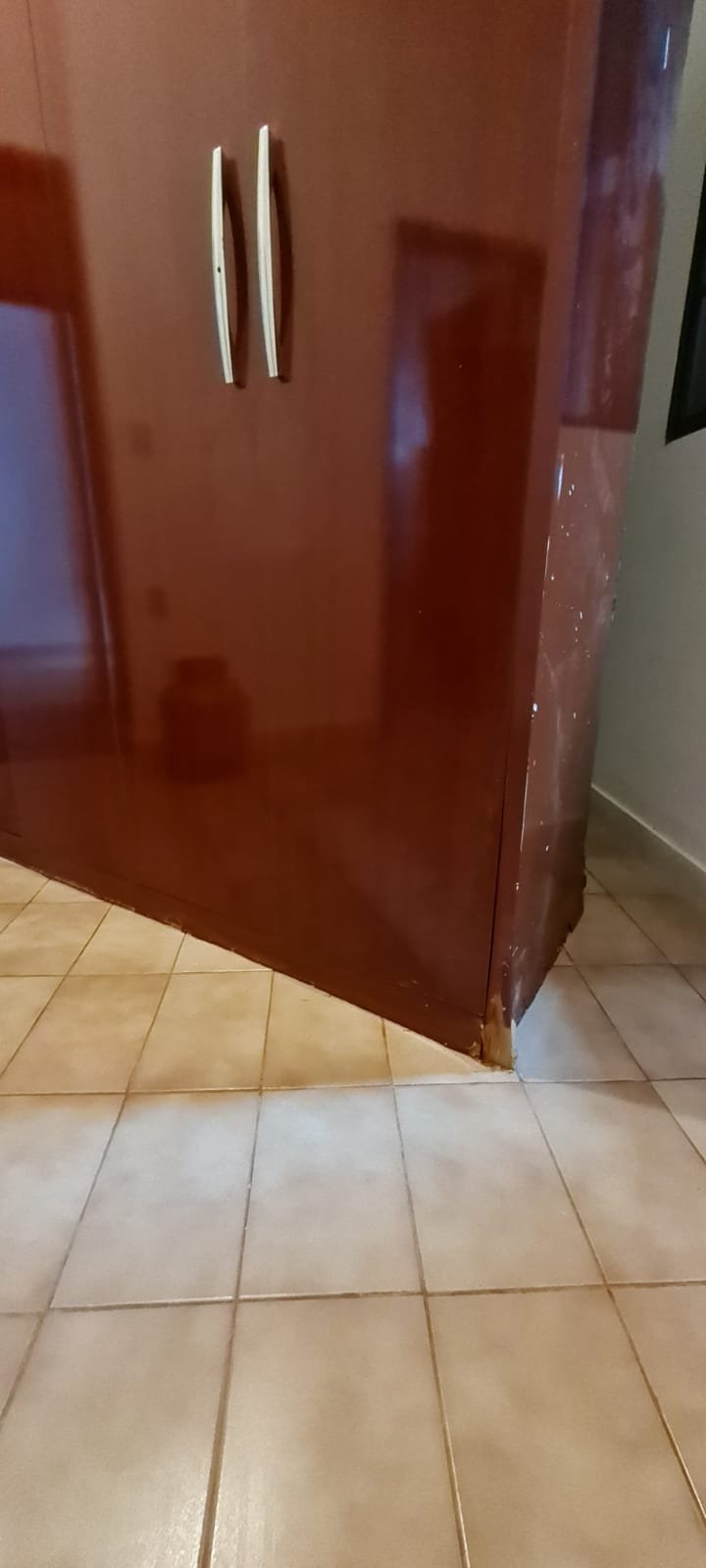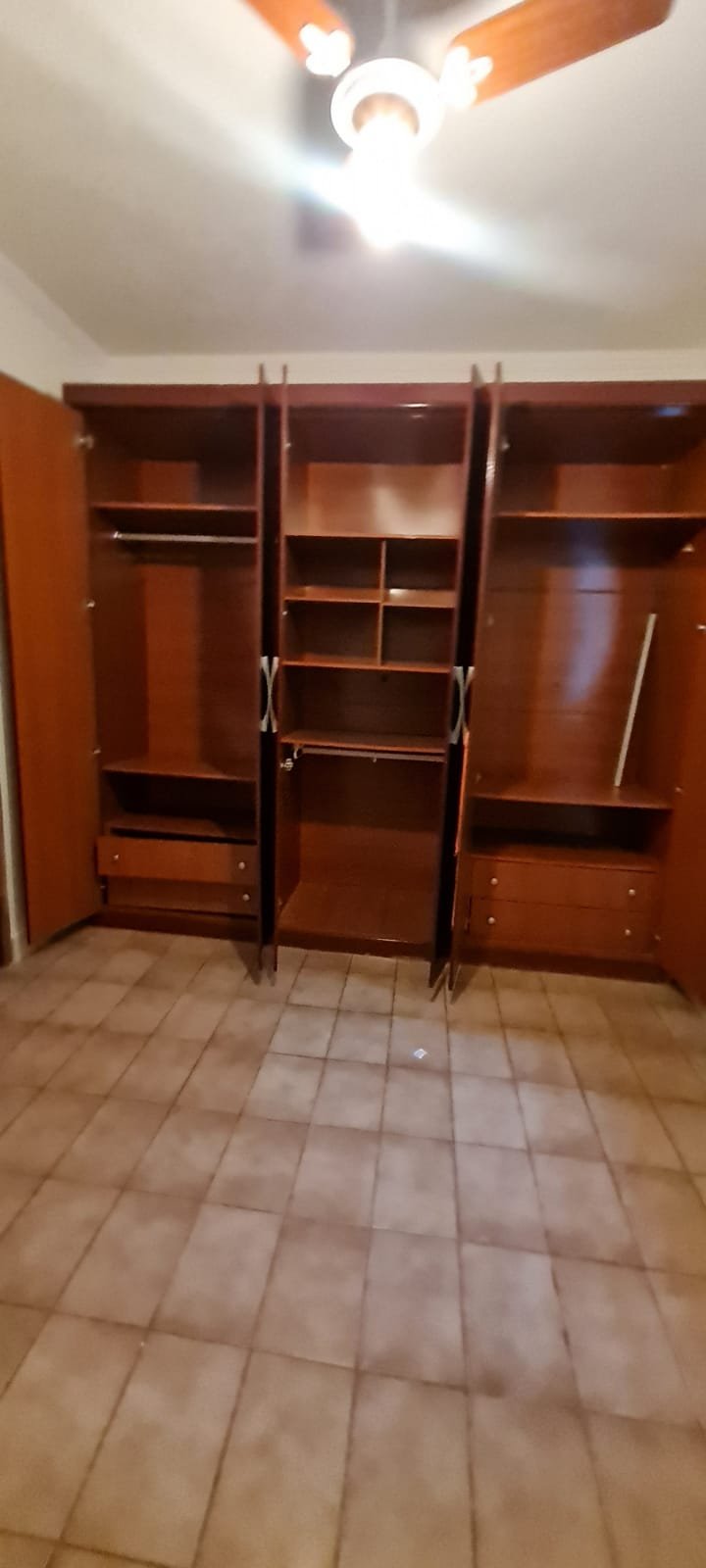 Quarto Suíte:- Parede do quarto com pintura bege, piso com manchas de sujeira, guarda roupas com 04 dobradiças quebradas, 02 gavetas emperradas, faltando 01 puxador na gaveta, base estufada.