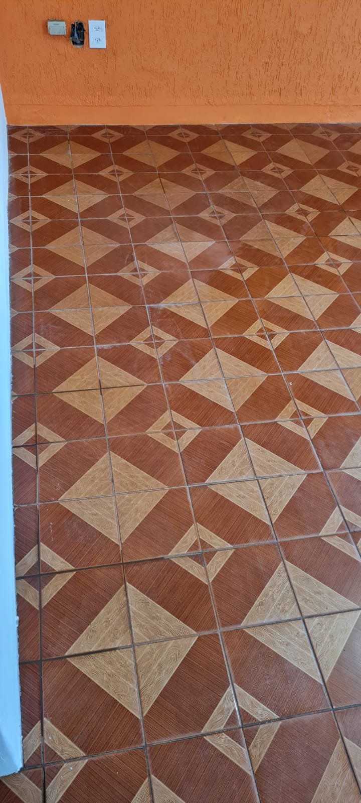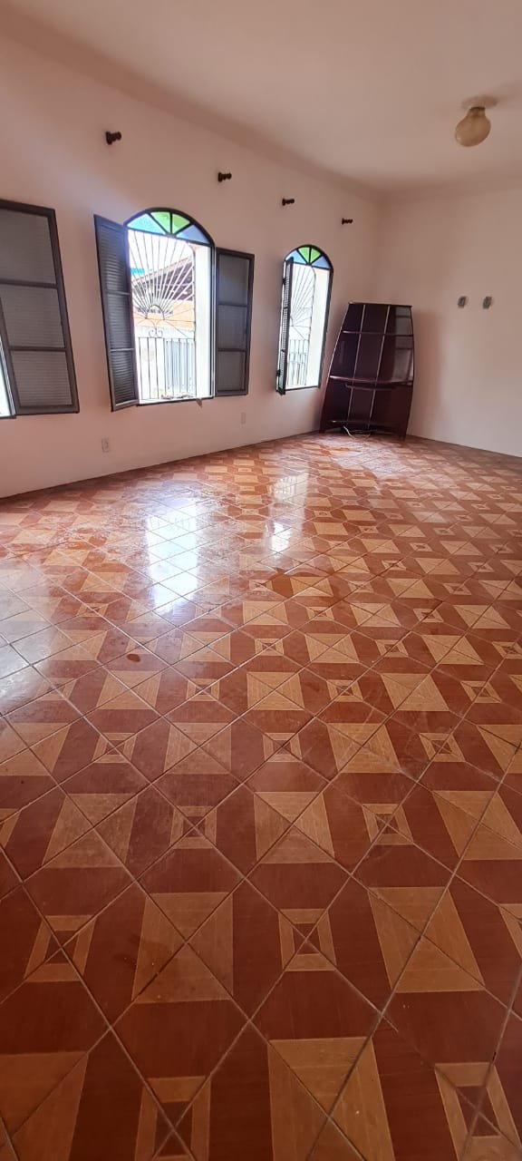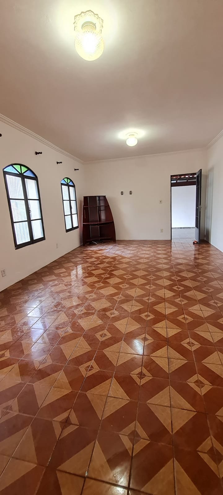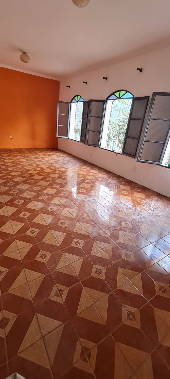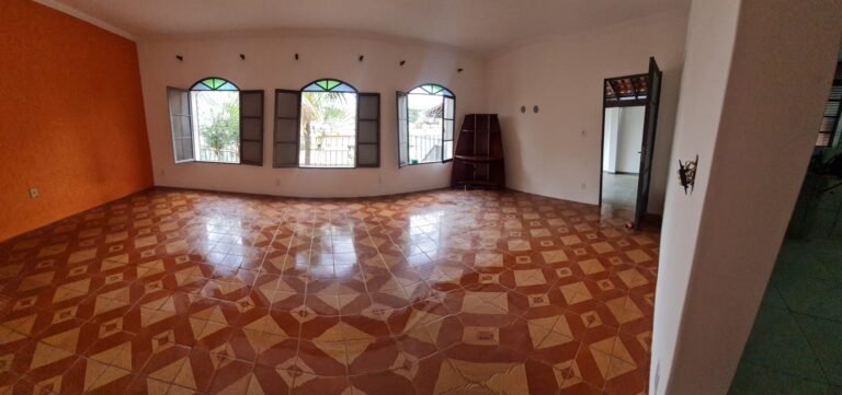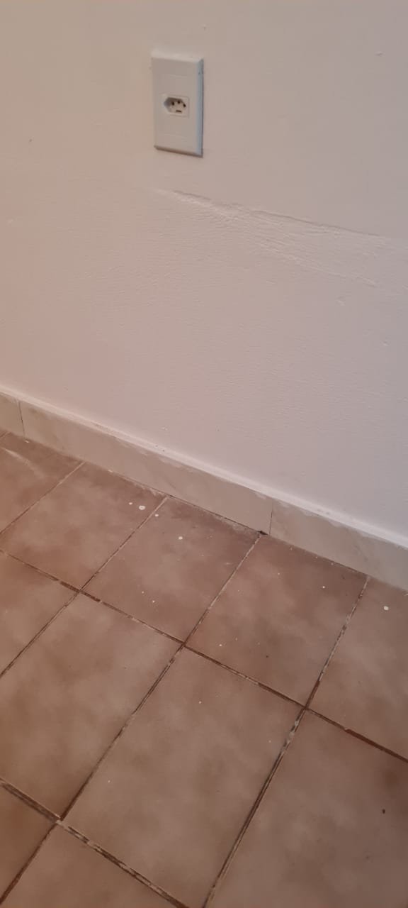 Sala:- Paredes sujas sem pintura, buracos tampados de massa corrida branca, teto sujo, piso com manchas brancas, porta da sala enroscando para fechar, faltando 01 fechamento do varão cortina, rack quebrado.